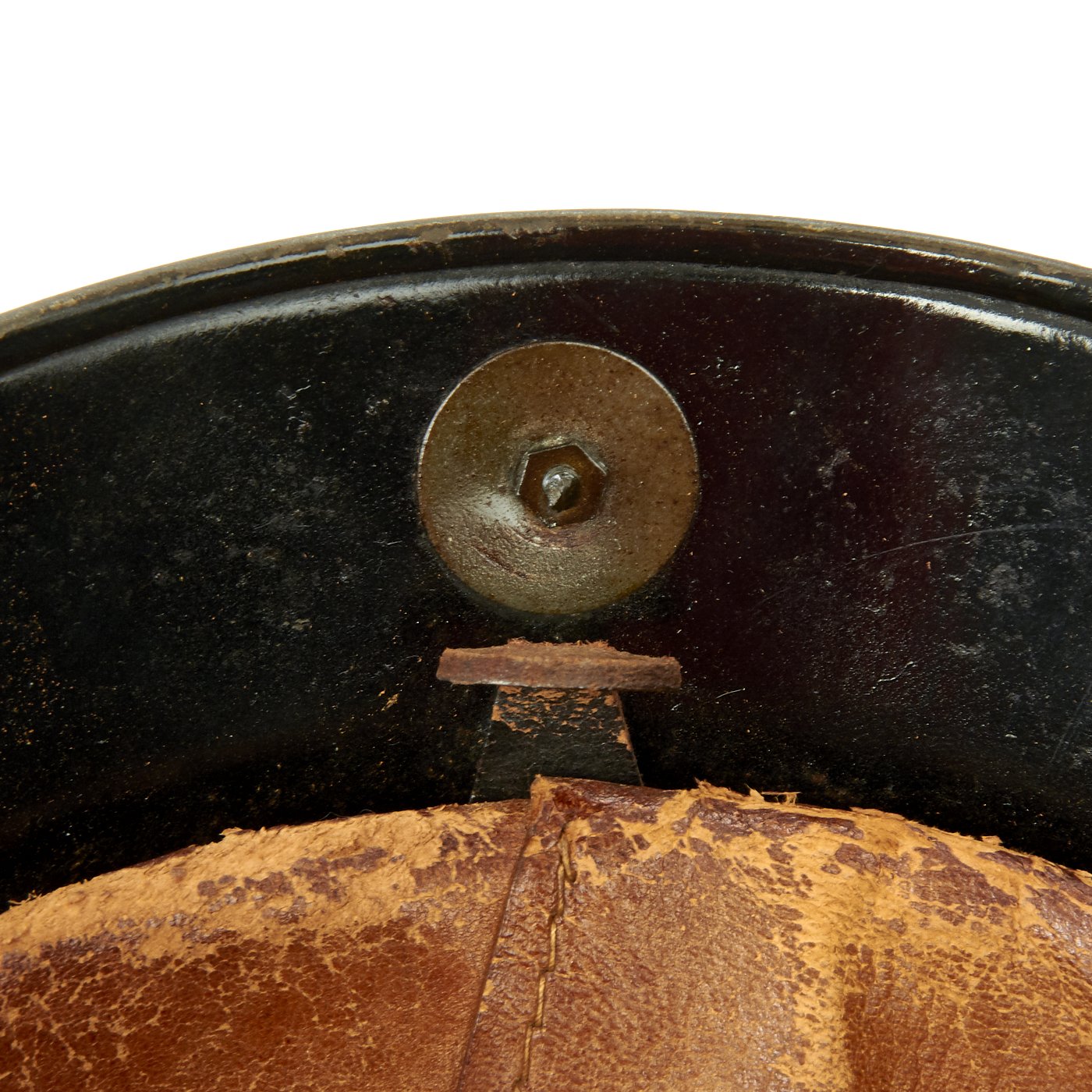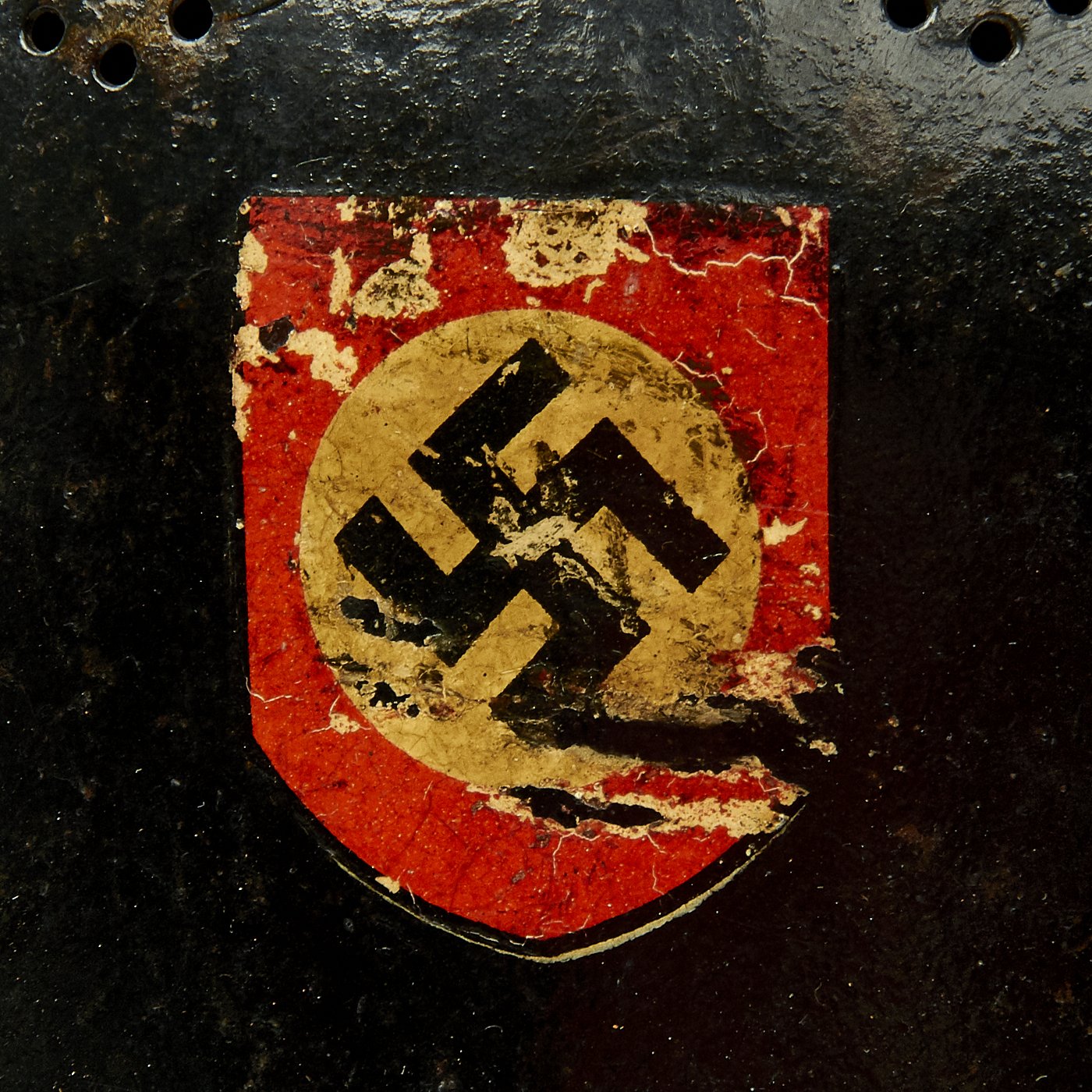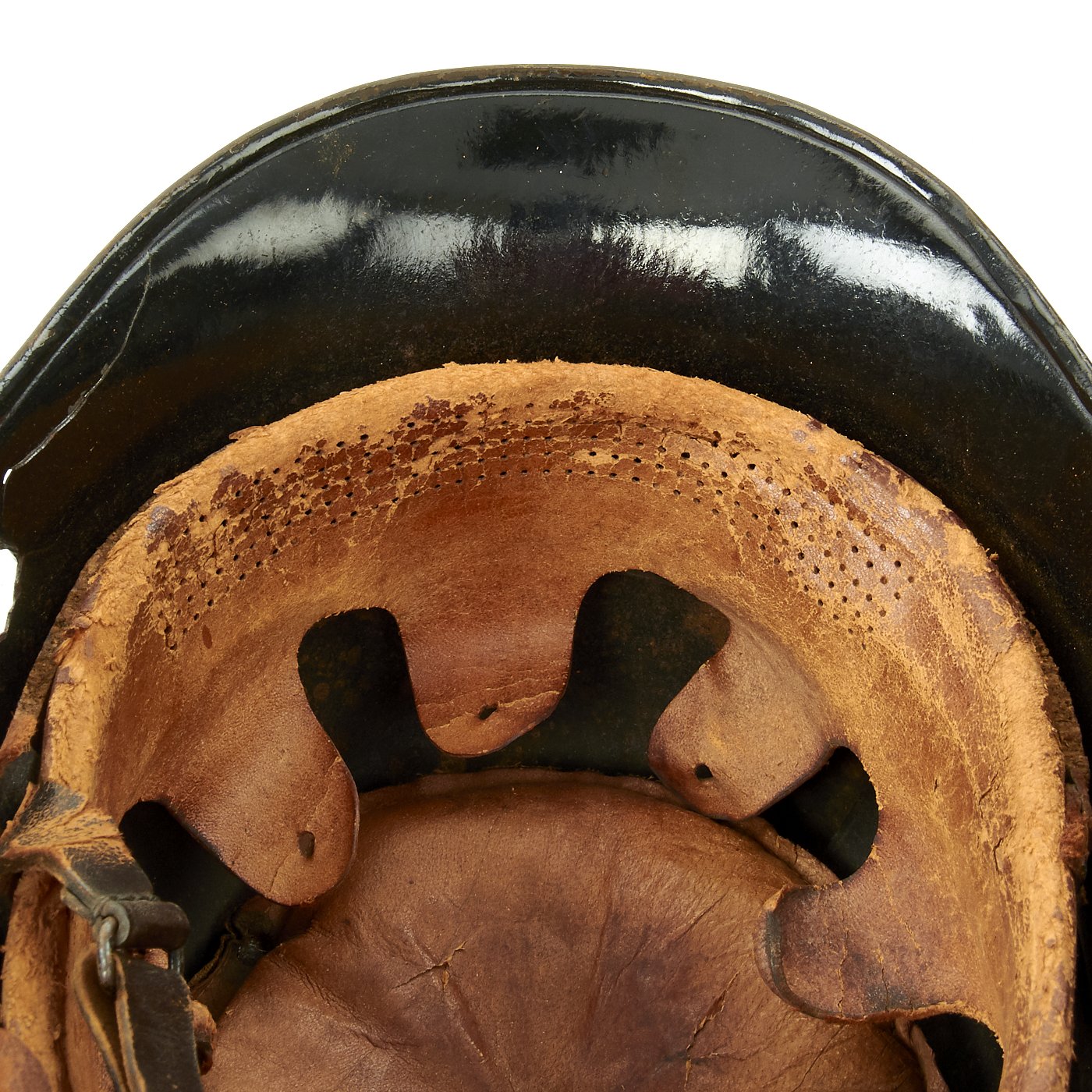 As a collectible, this is a very nice example of an early manufacture “square dip” M1934 helmet with aluminum comb. It is complete with both decals. The leather liner, which shows age and wear, is complete along with the leather crown pad. One side of the the chinstrap is absent. Overall condition of the shell is very good condition. A very nice example of a difficult to find early variation of the German WW2 Feuerwehr Helmet.