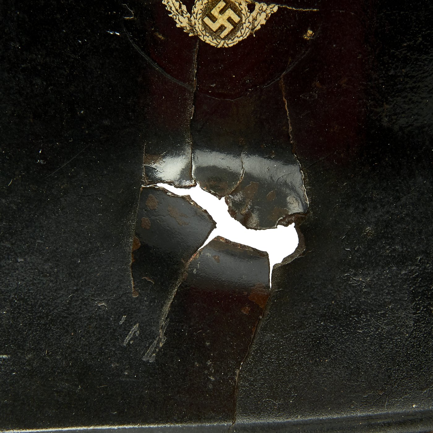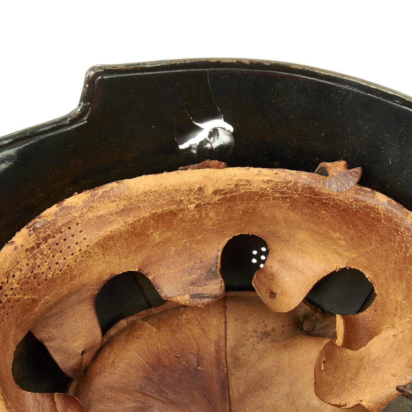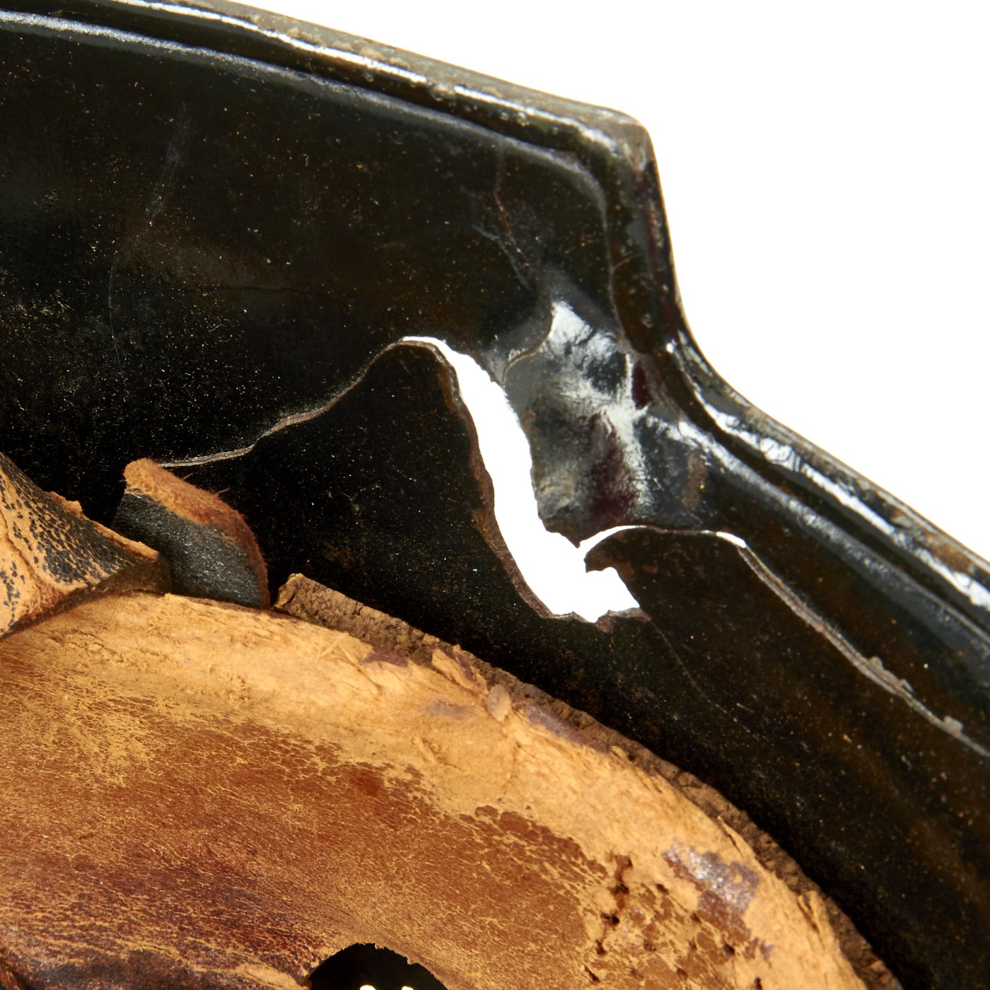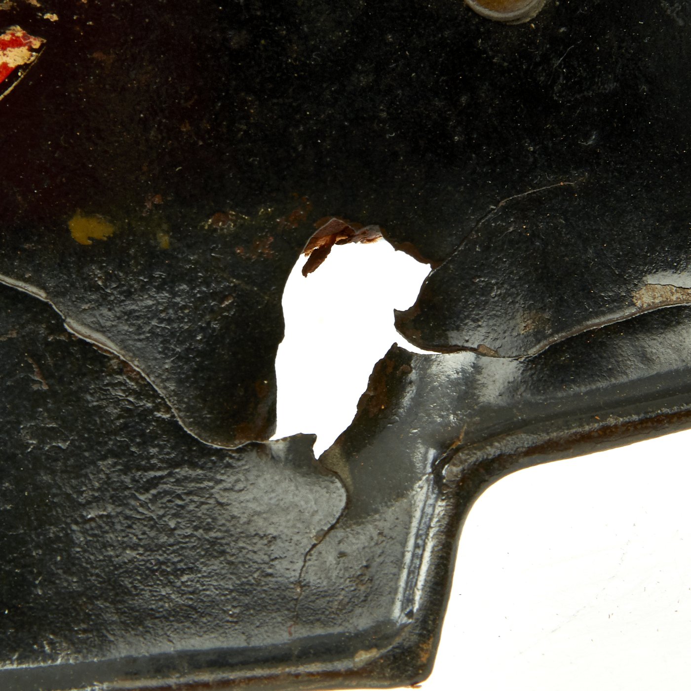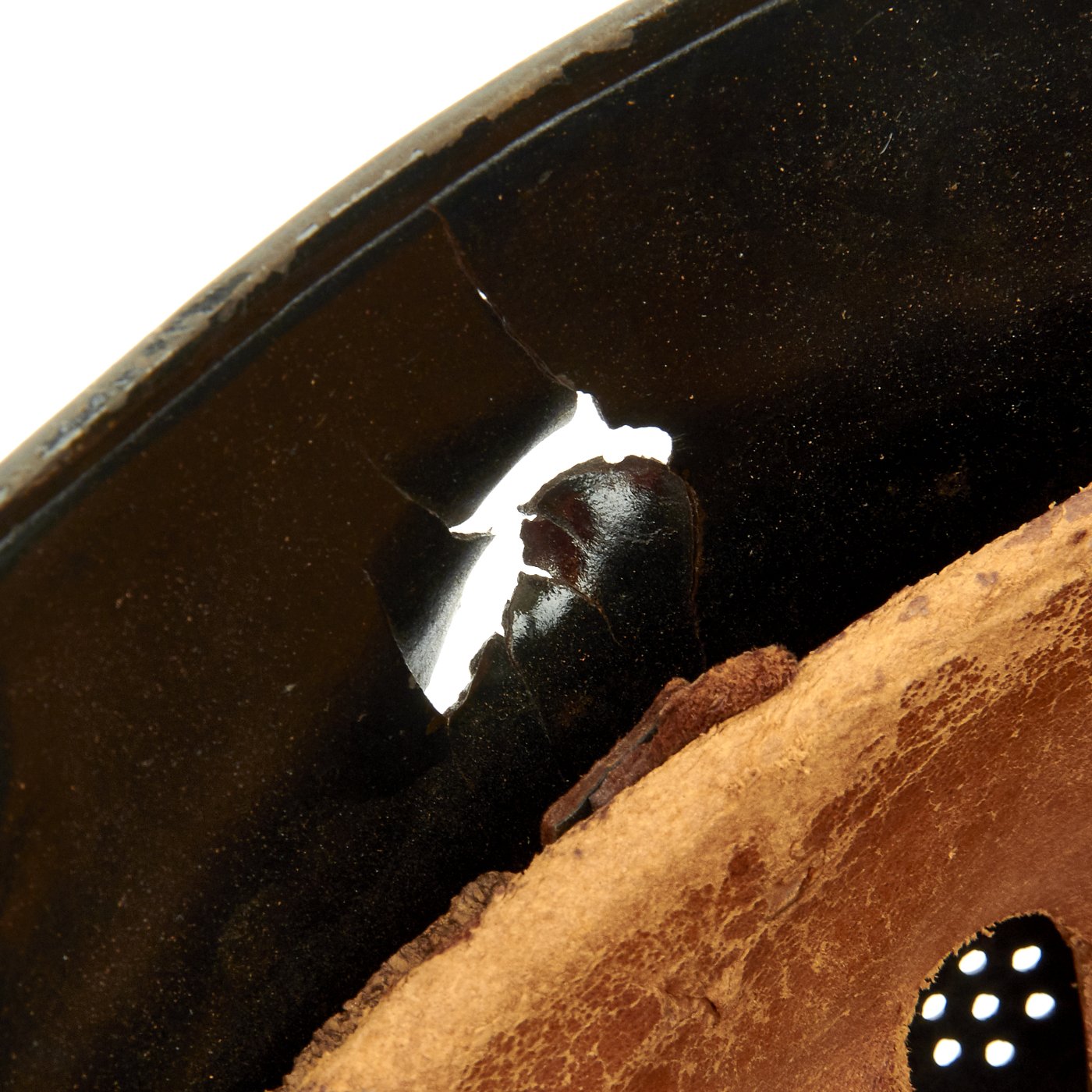 Original Item: Only One Available. This is a genuine USGI bring back Trophy of War. The unique aspect of this helmet is a .45 caliber size bullet hole (Colt 1911, Thompson SMG, M3 Grease Gun) enters at the forward right side of the helmet, and exists on the left side, indicating that the German solider was Killed in Action. Close inspection of the paint, style and aging of the edges of the bullet path lead us to be confident that these entrance/exit holes are genuine to the WWII period. Additionally, the USGI that captured this helmet pained DEC. 25, 1944 on the aluminum comb.
