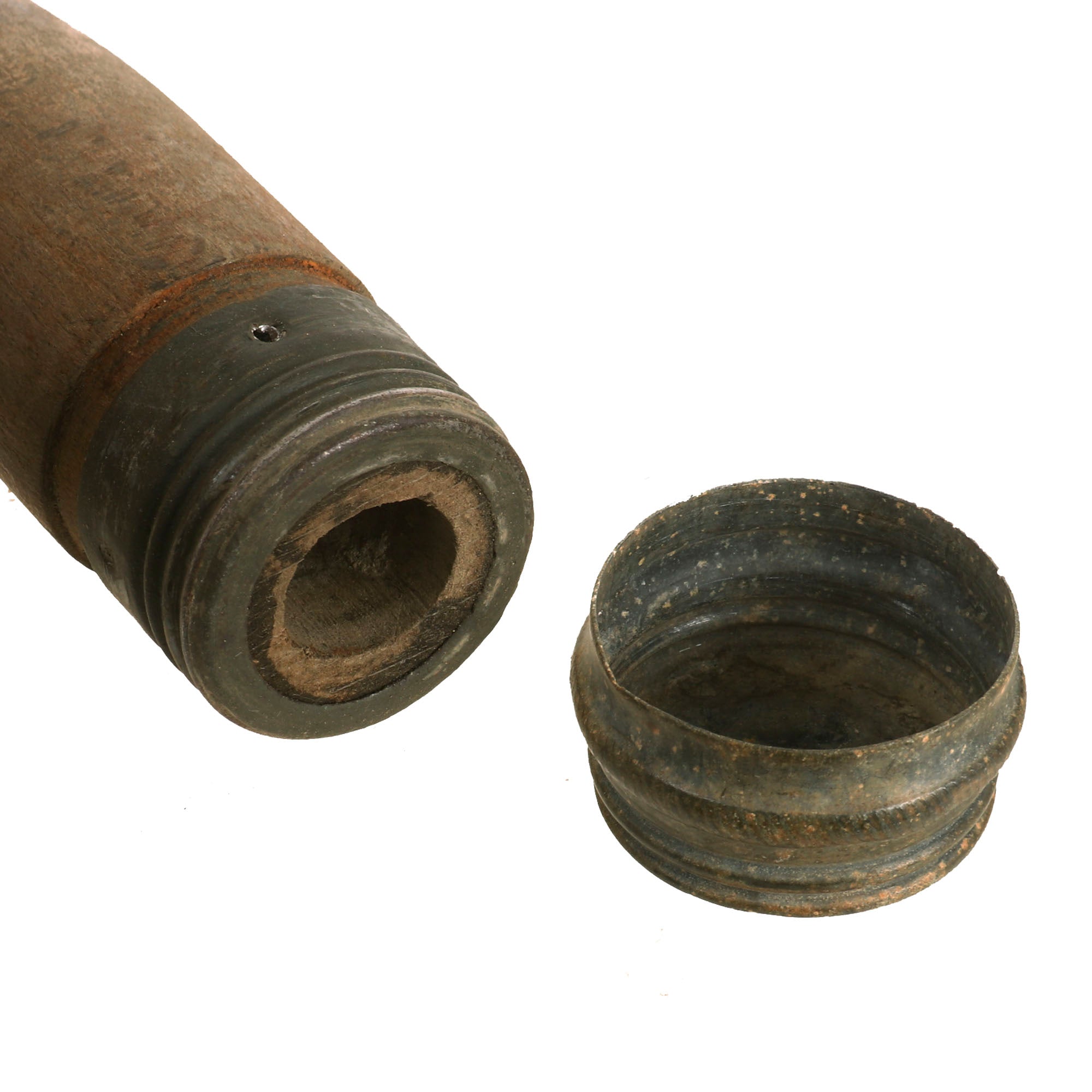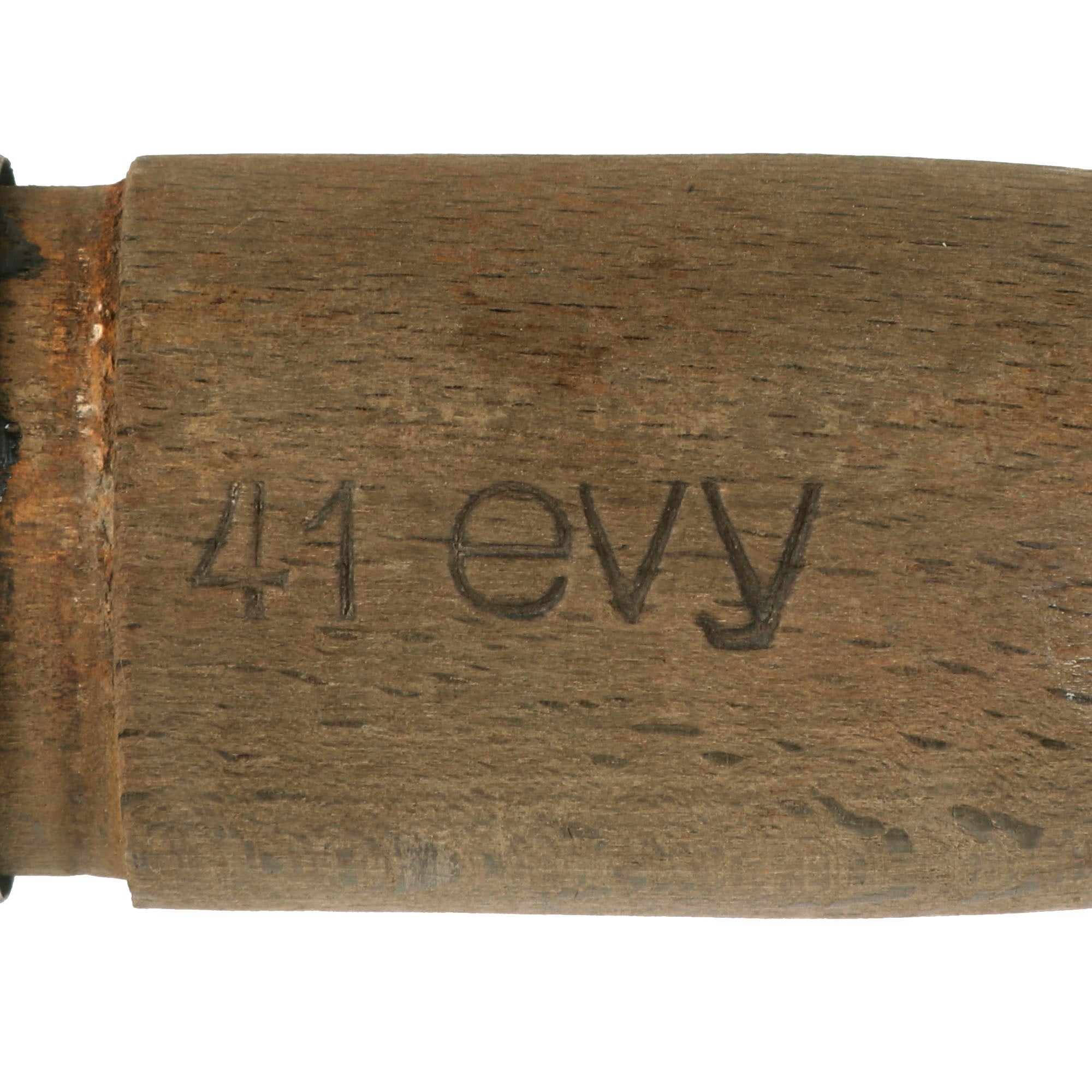 The wood shaft of the grenade only has the year and 3 letter code marking present; 41 evy.. This indicates manufacture by Witwe Wilhelm von Hagen, Iserlohn Westfalen, in 1941. This firm is a metalworking business who manufactured grenades and artillery shell fuses during the war.The bottom end cap is still present, but the string and bead are missing. The wood is in fair condition but does have small nicks and denting.