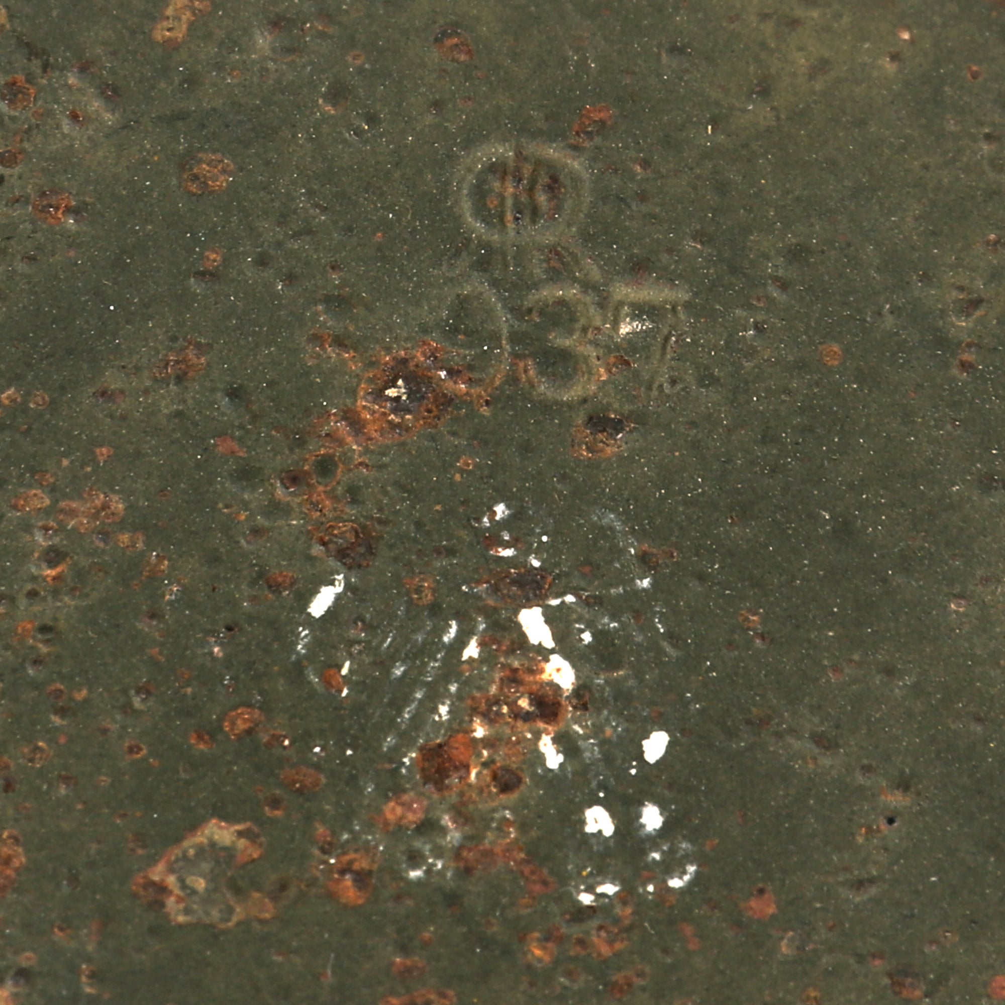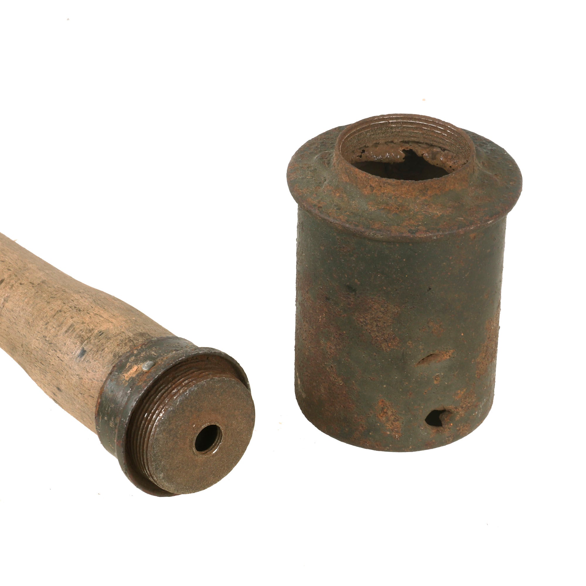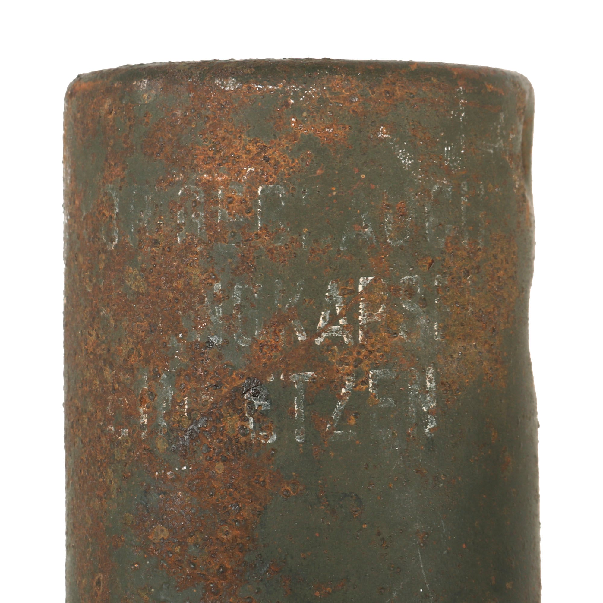 Warhead is demilitarized; it does unscrew from the shaft but there is splitting at the seam, so handle with care. It is painted the correct green over a red primer, and the stencil on the front is mostly faded, but for historical purposes it is as follows: VOR GEBRAUCH SPRENGKAPSEL EINSETZEN (Before use insert detonator). The top of the warhead is stamped with the year 1937 and a maker code ЯR for Richard Rinker without any subcontractor numbers present. All early (pre/early 1940) Stielhandgranate 24 were marked with the letters "ЯR" to fool the Allies. The head also has a couple small shrapnel holes, which really adds some great character to the piece.
