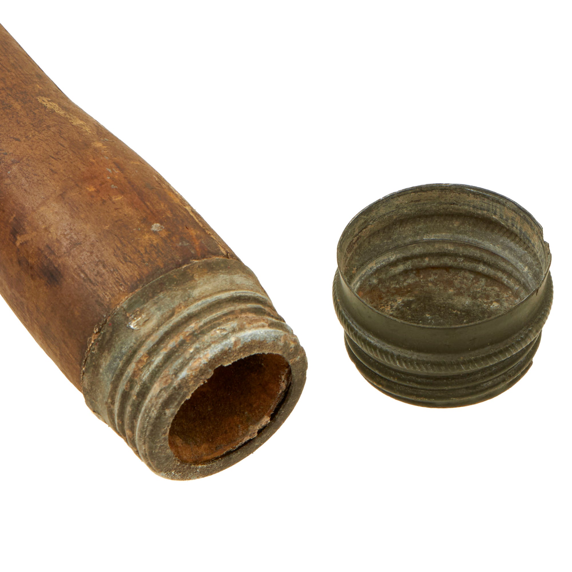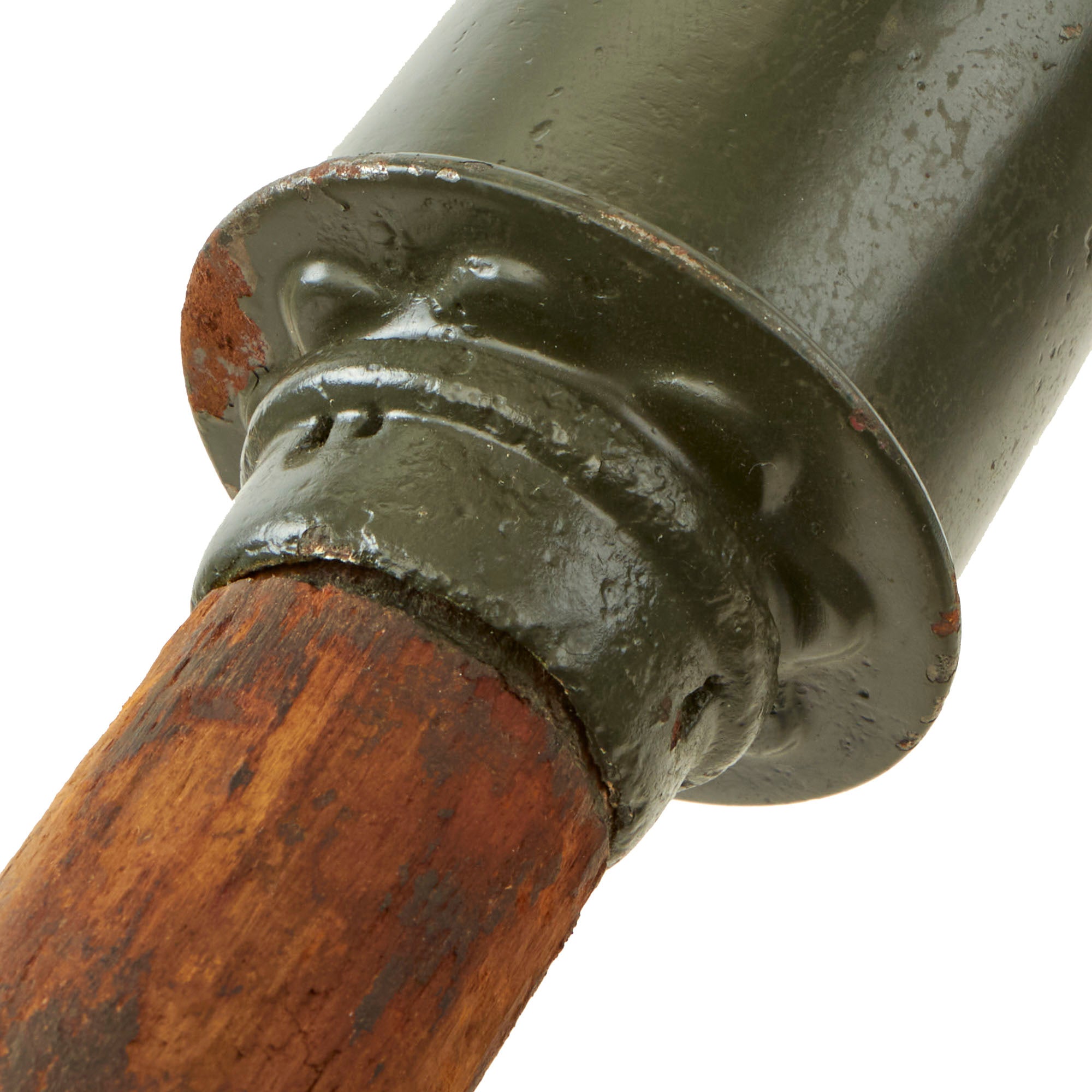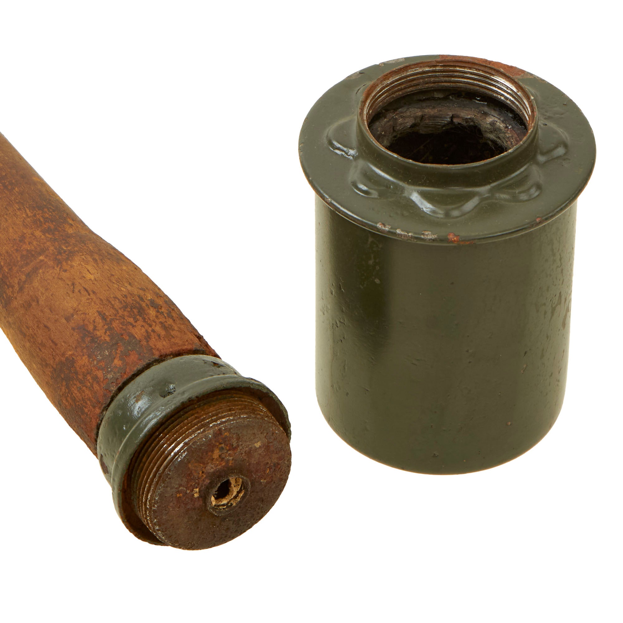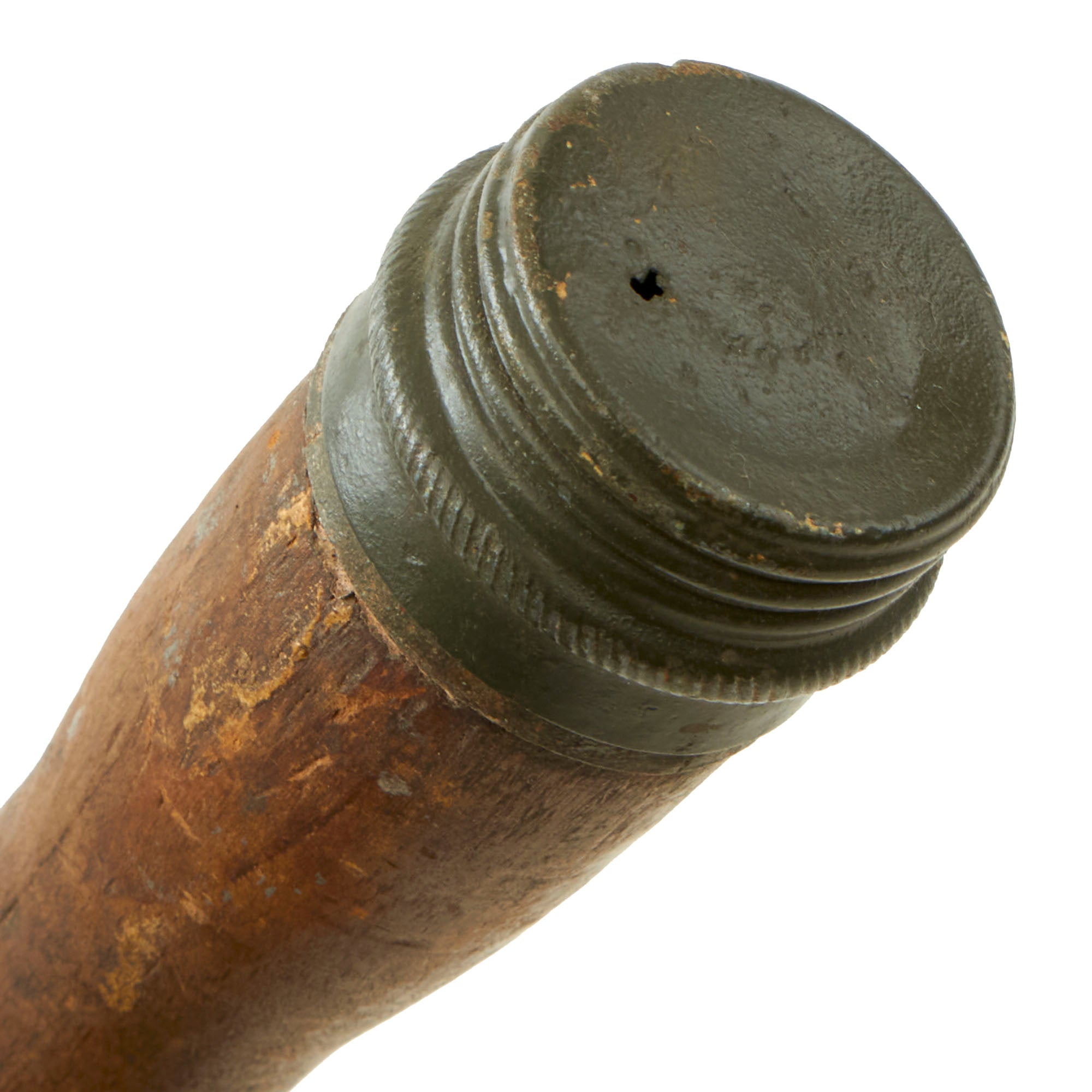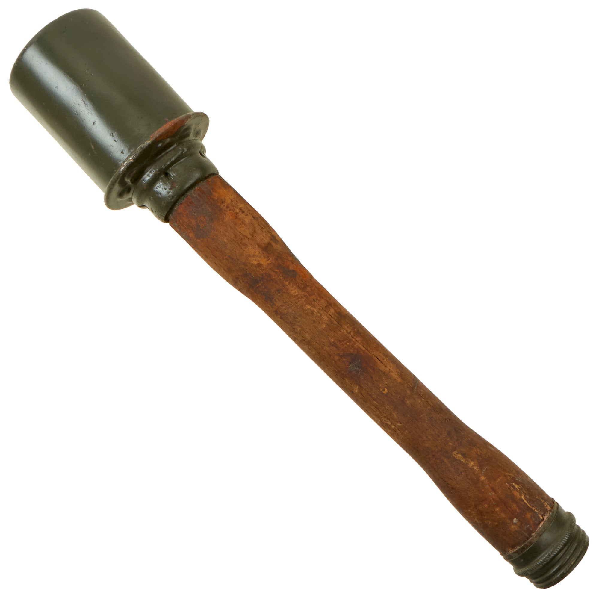 Original Item: Only One Available. This is a nice representative example of a WWII German M-1924 German Stick Grenade. This example has been demilitarized according to specifications by the BATF. The head and cap of the grenade have been repainted, and are void of markings. The shaft is heavily worn and is also void of markings.Unloaded or dummy grenades, artillery shell casings, and similar devices, which are cut or drilled in an BATF-approved manner so that they cannot be used as ammunition components for destructive devices, are not considered NFA weapons. This example is in total compliance and is NOT AVAILABLE FOR EXPORT.Warhead is demilitarized; it does unscrew from the shaft showing the heavily oxidized interior. The head is entirely repainted in green, and the stencil on the front is entirely gone, but for historical purposes it was as follows: VOR GEBRAUCH SPRENGKAPSEL EINSETZEN (Before use insert detonator). The top of the warhead may have been stamped with a maker marking, but due to the repainting, we cannot check.The wood shaft was originally stamped with a maker’s code, but it is no longer visible. The bottom cap unscrews, but there is no bead or pull string inside. There is also some material loss to the cap, so it likely had oxidation before being repainted.This is a fine original example without any markings, but guaranteed original to the period. Ready to display.