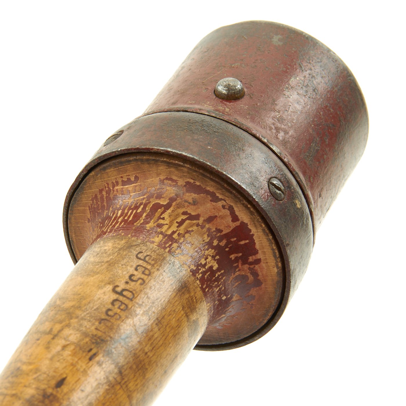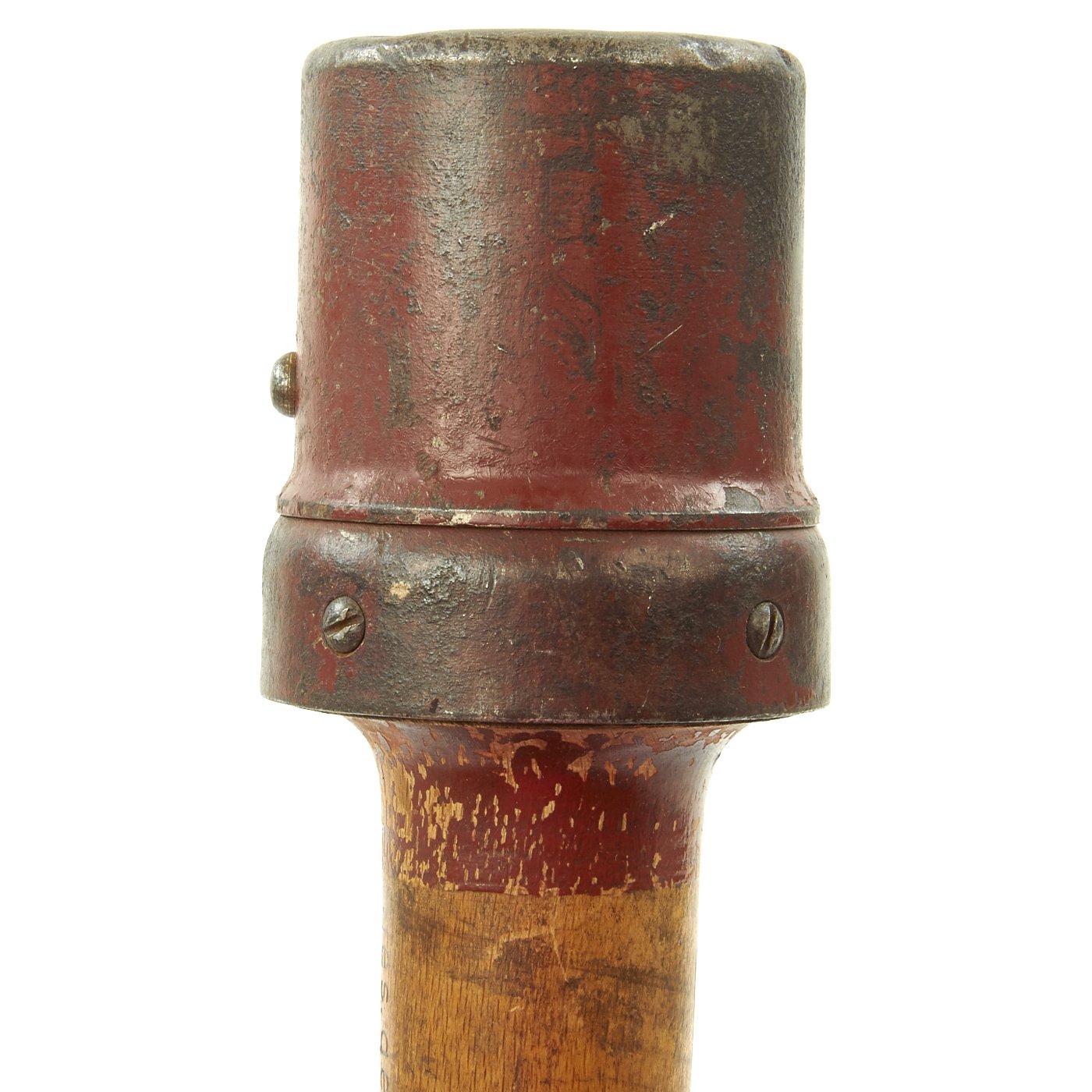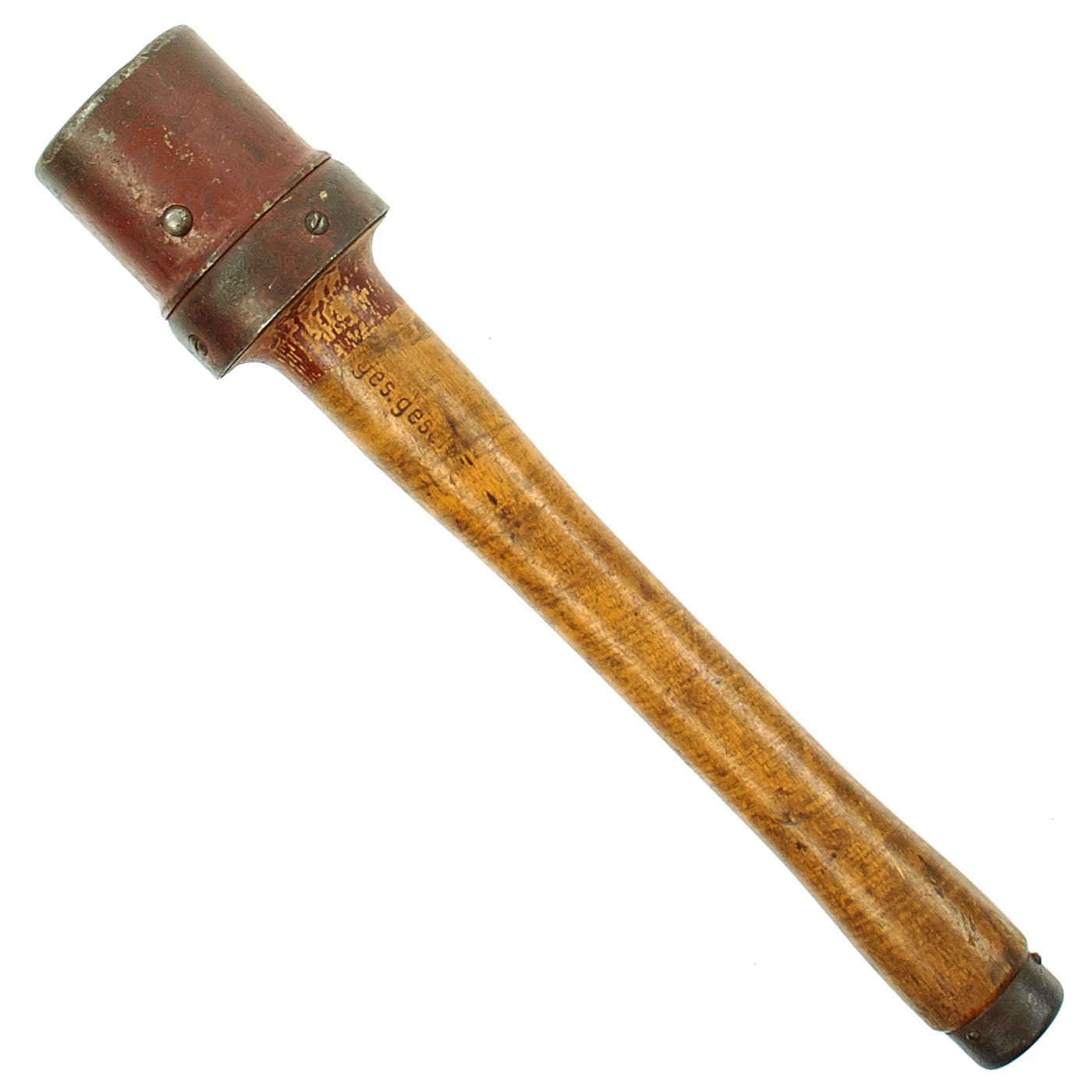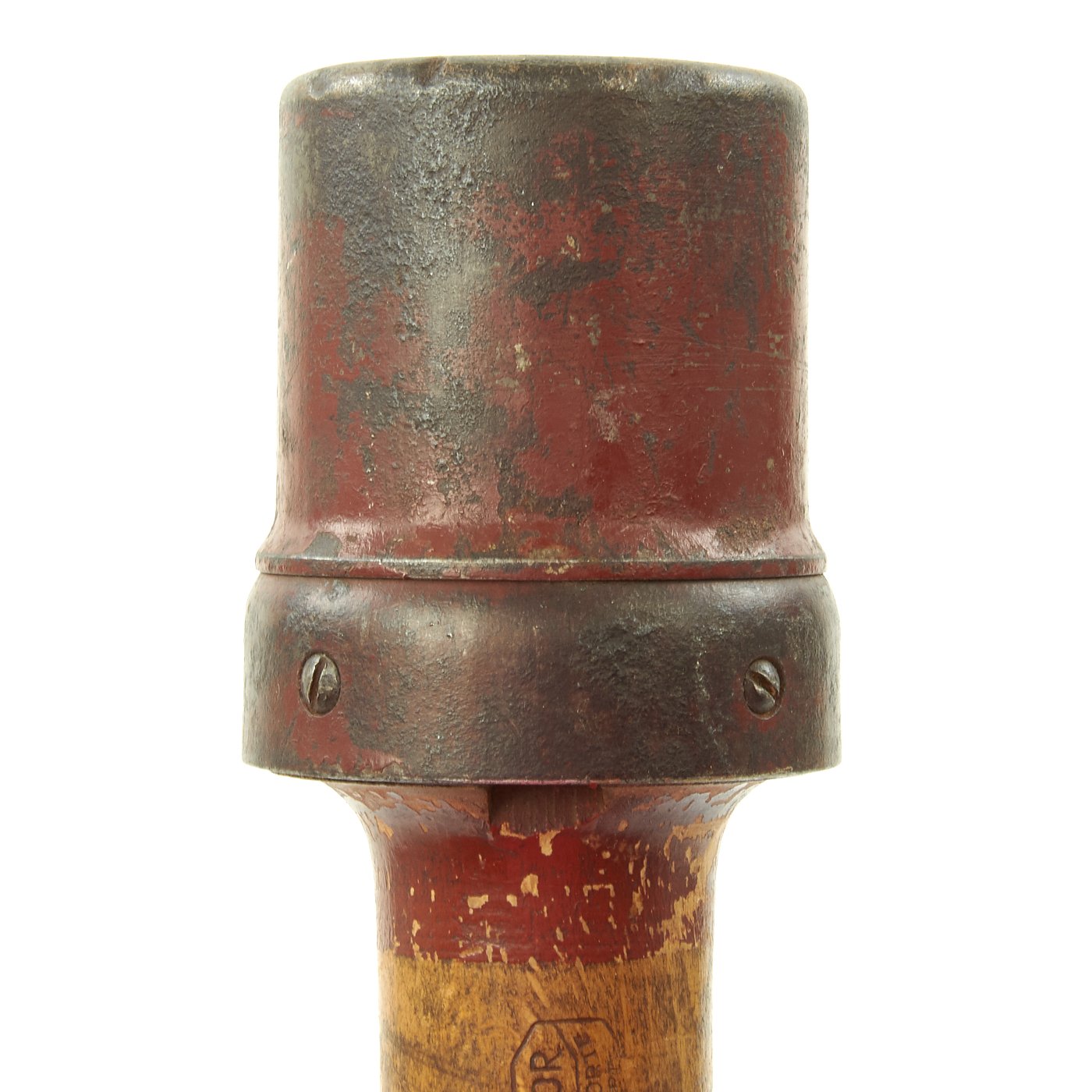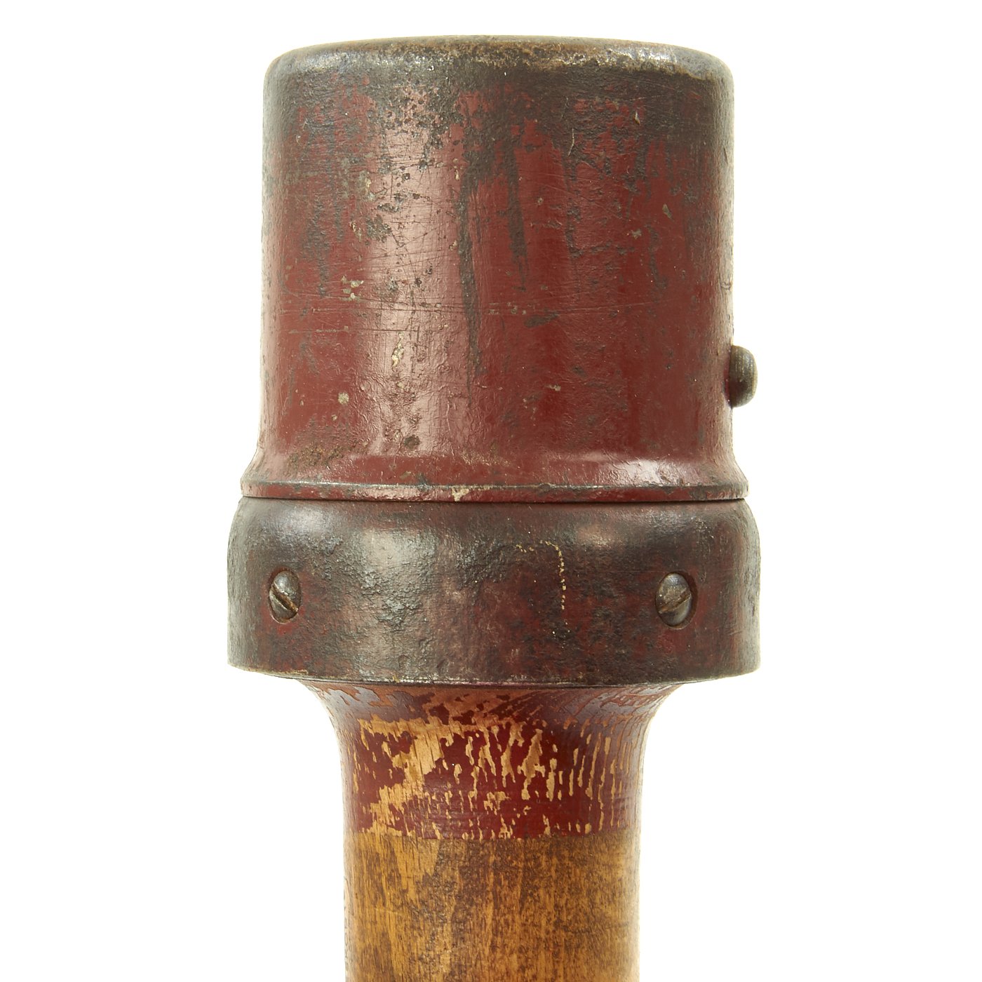 Original Item: Only One Available. This is an extremely rare excellent example of a practice training M1924, M24, or Stielhandgranate 24 ("stalk hand grenade") German Stick Grenade, often called a "potato masher". They are officially termed Übungshandgranate, which literally means Exercise Hand Grenade. This variant is one that we have not seen before and definitely has some interesting features that separate it from the others we have seen by Richard Rinker. Most likely, the designs were not officially patterned, so certain design elements were left up to the supplier.