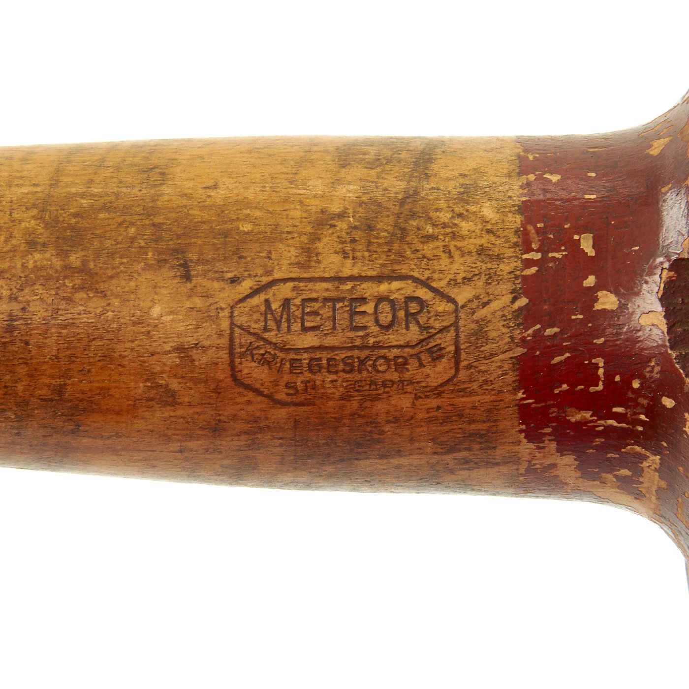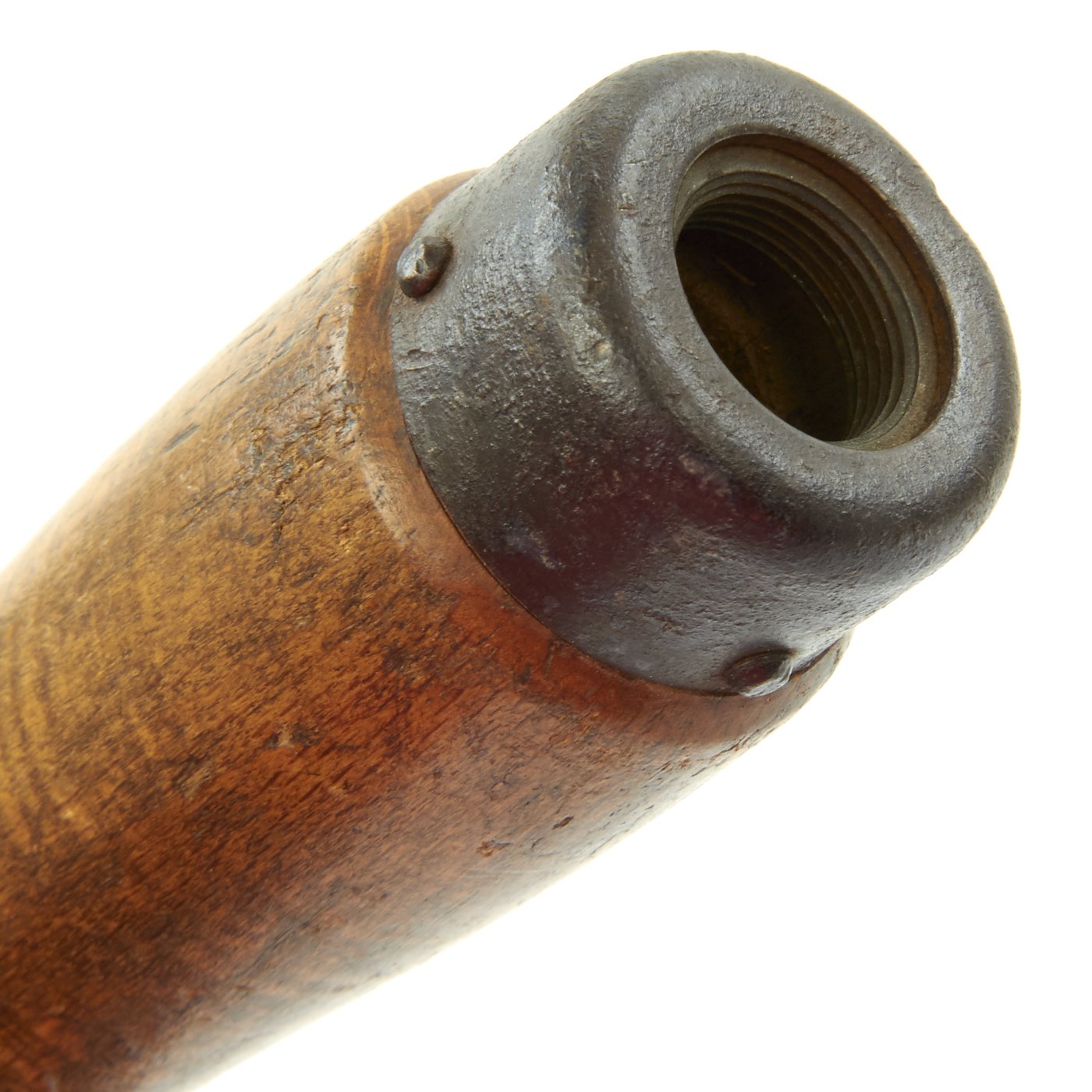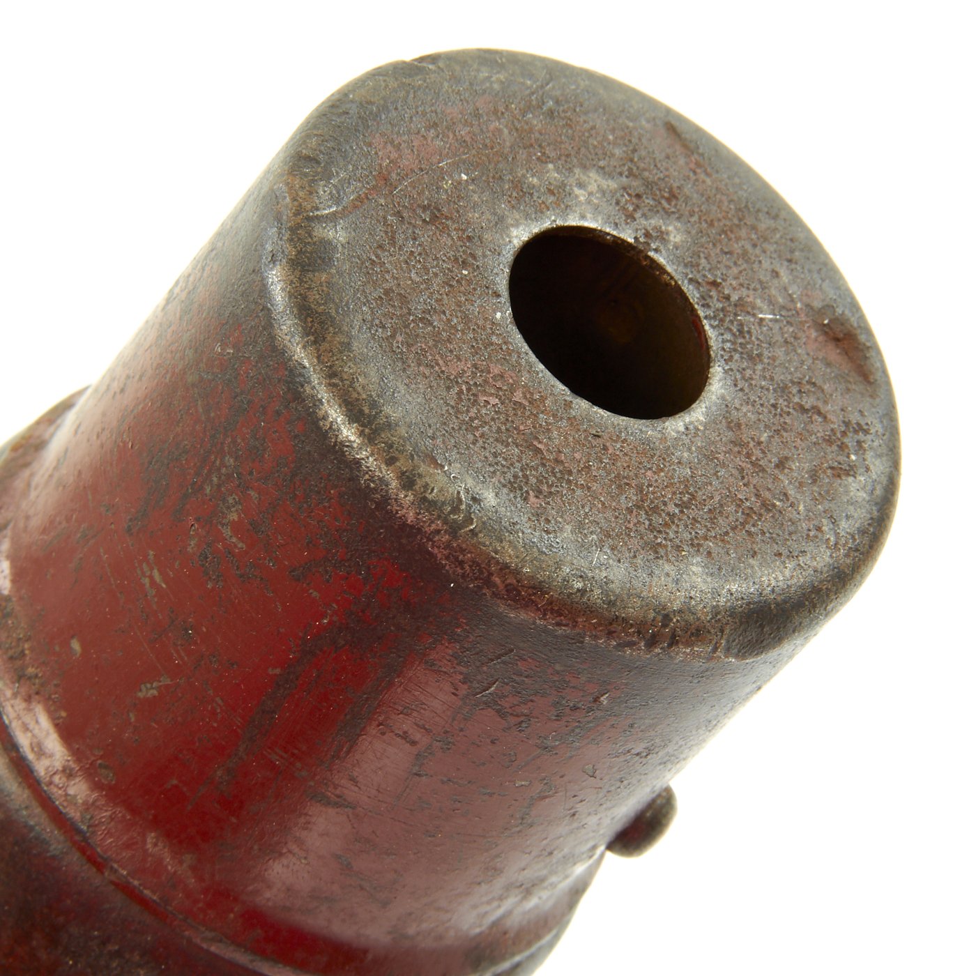 This very nice example was recently acquired from a large ordnance collection in the U.S.. It does not appear to have had a bottom cap like most practice grenades, but does have a threaded hole where the fuse would be pulled. The explosive head has a single hole on the top, and most interestingly, has a removable cover, which is held on by a spring pin. The wooden handle extends all the way into the warhead. It still has much of the original red paint on the head of the grenade, as well as on the top of the shaft. It was not painted red under the head's "cover".