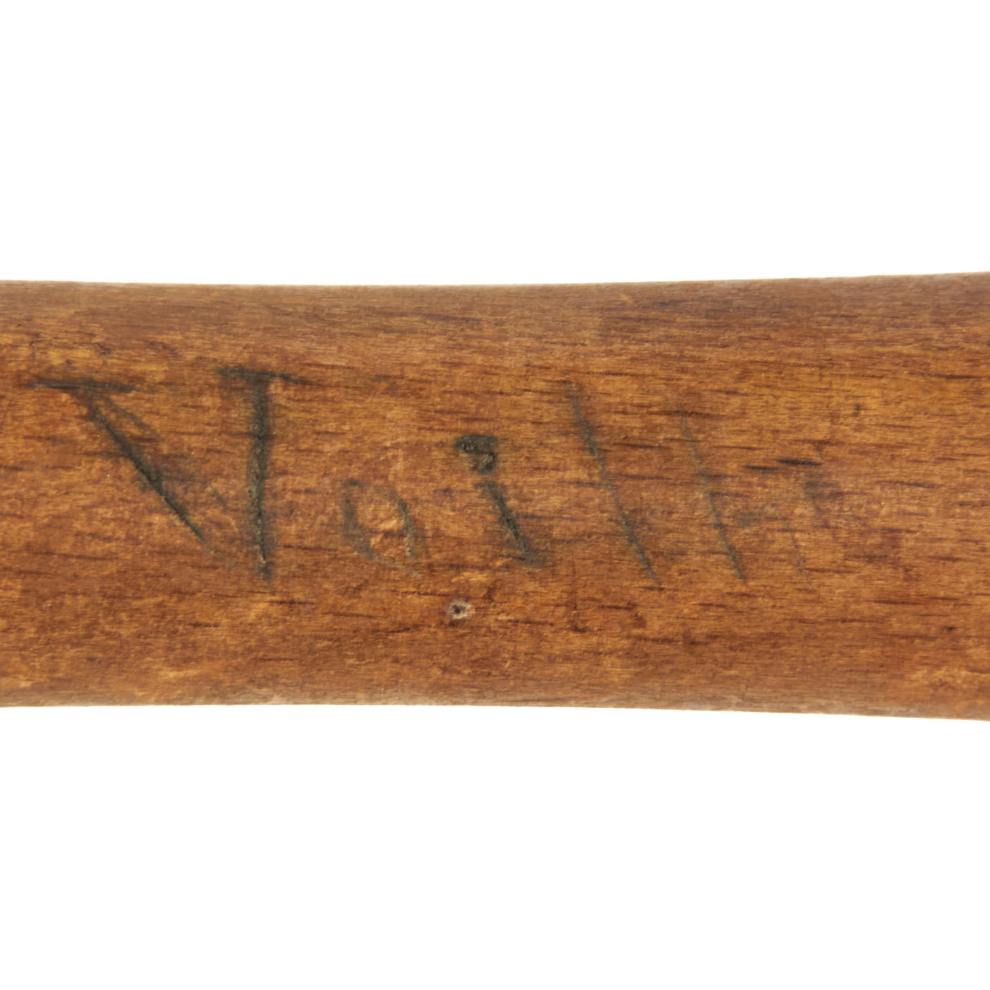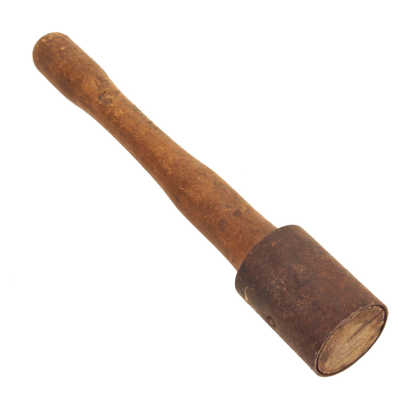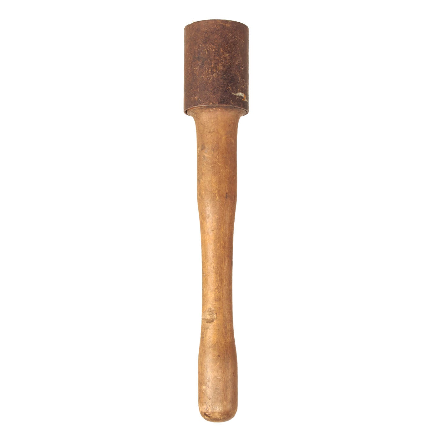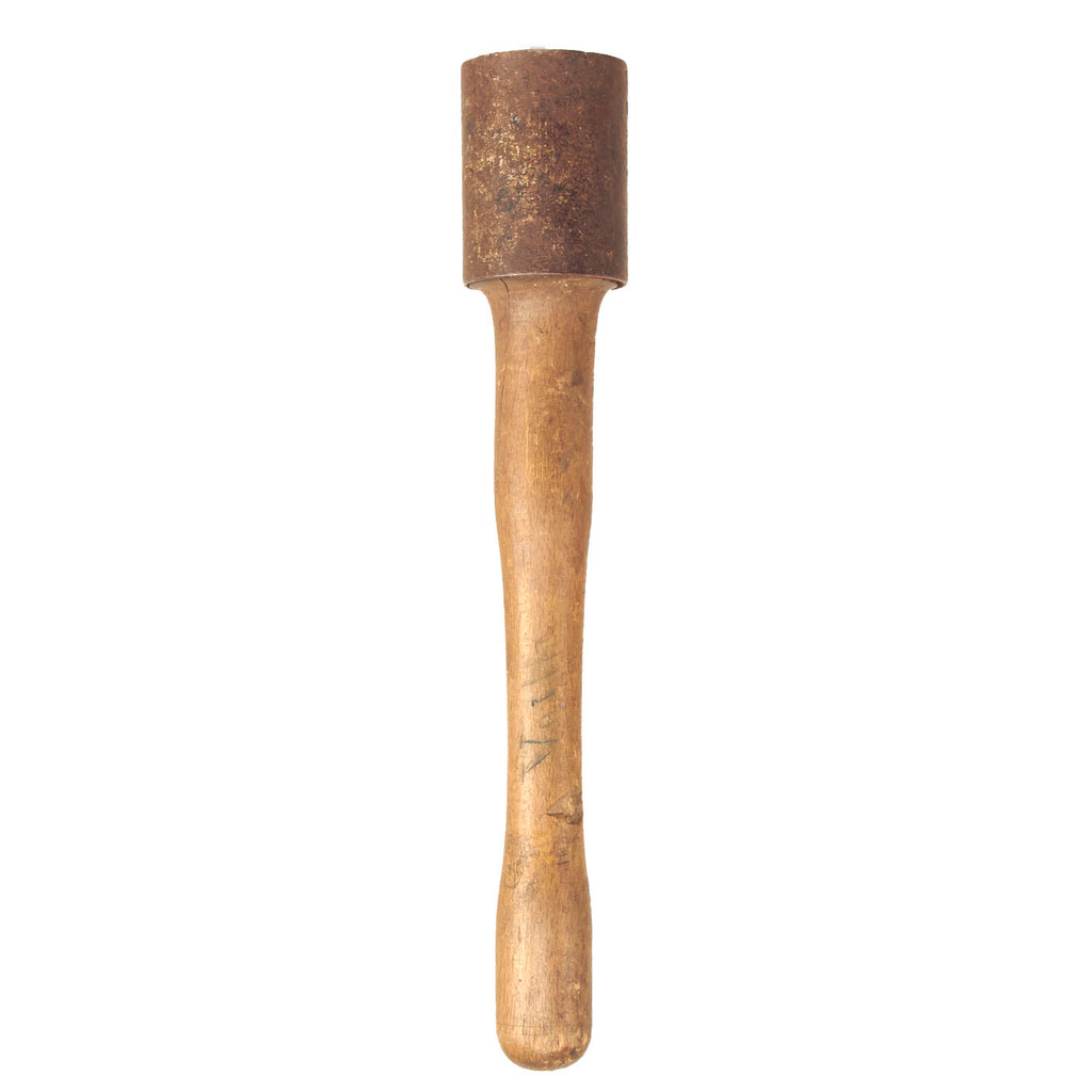 These training hand grenades provided a low cost and realistic option for instructing soldiers in the proper and safe handling of hand grenades. This example is completely solid and made of wood with the similar appearance and size of an actual stick grenade. The top has a 1/16” thick steel sleeve to give it a more realistic feel and look.