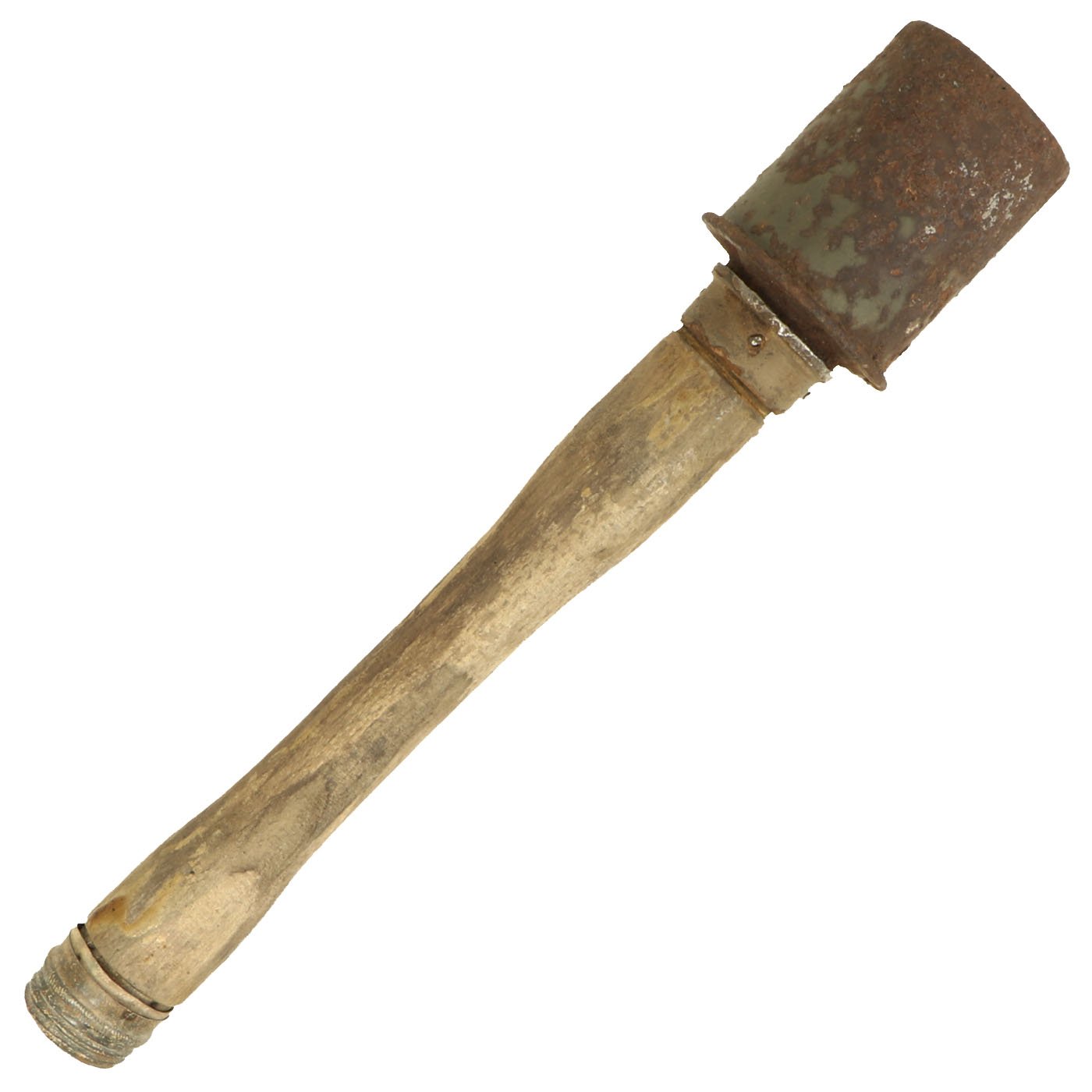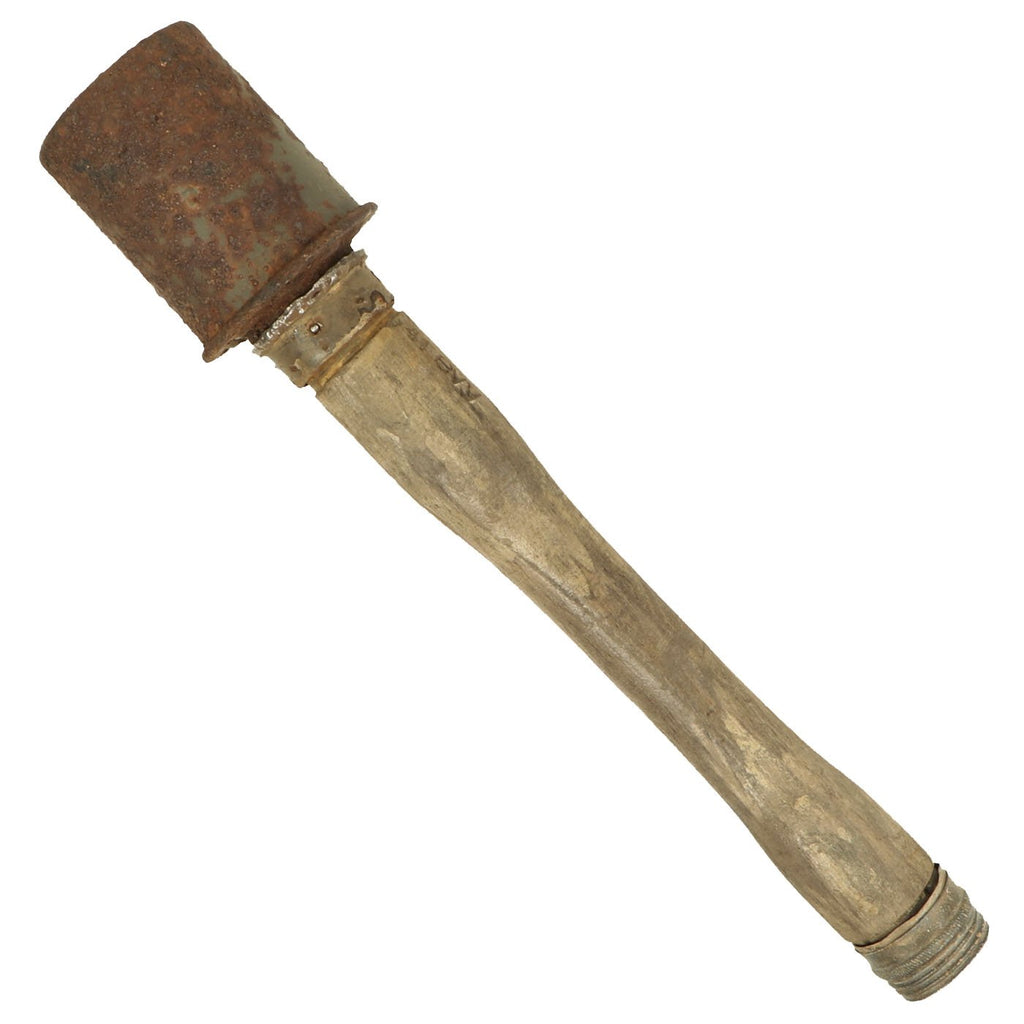 Original Item: Only One Available. This is an extremely rare M1924, M24, or "Stielhandgranate (stalk hand grenade) 24" German Stick Grenade, often called a "potato masher". This example, acquired from the family of a WWII veteran, has been demilitarized according to specifications by the BATF. The warhead still unscrews, though the detonator is not included. It still retains its original paint, and the original markings can be seen on the handle of the grenade.