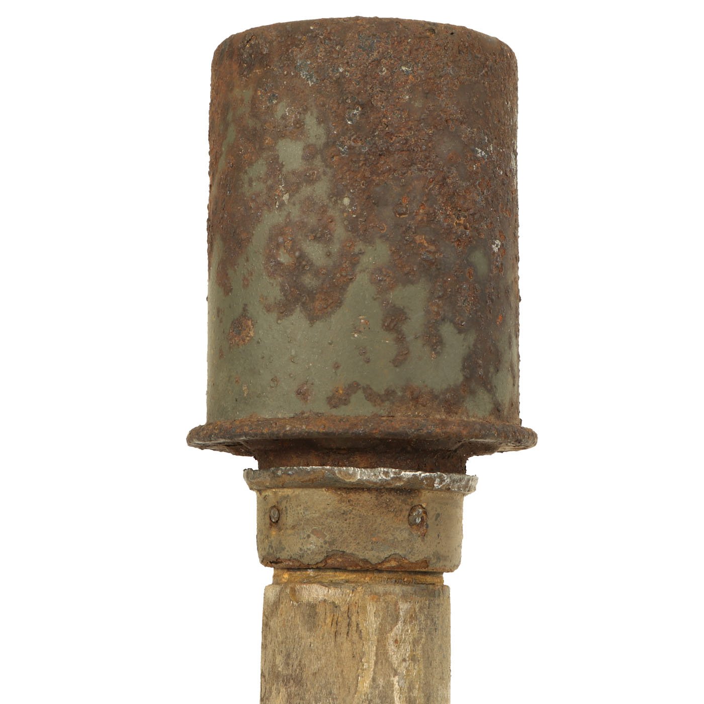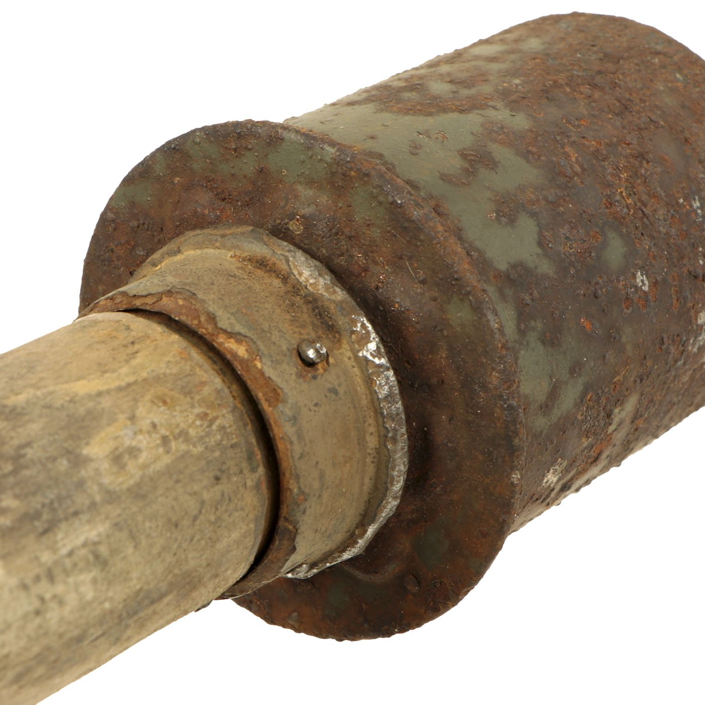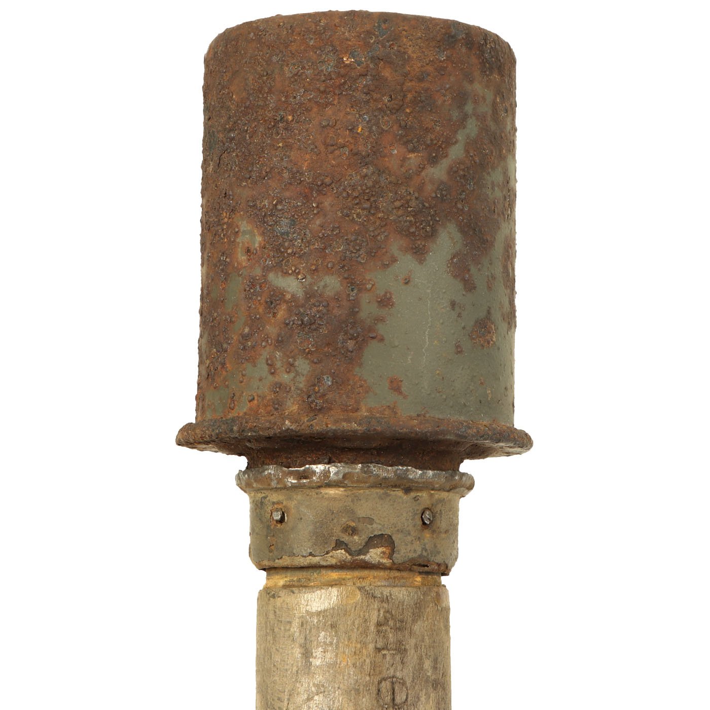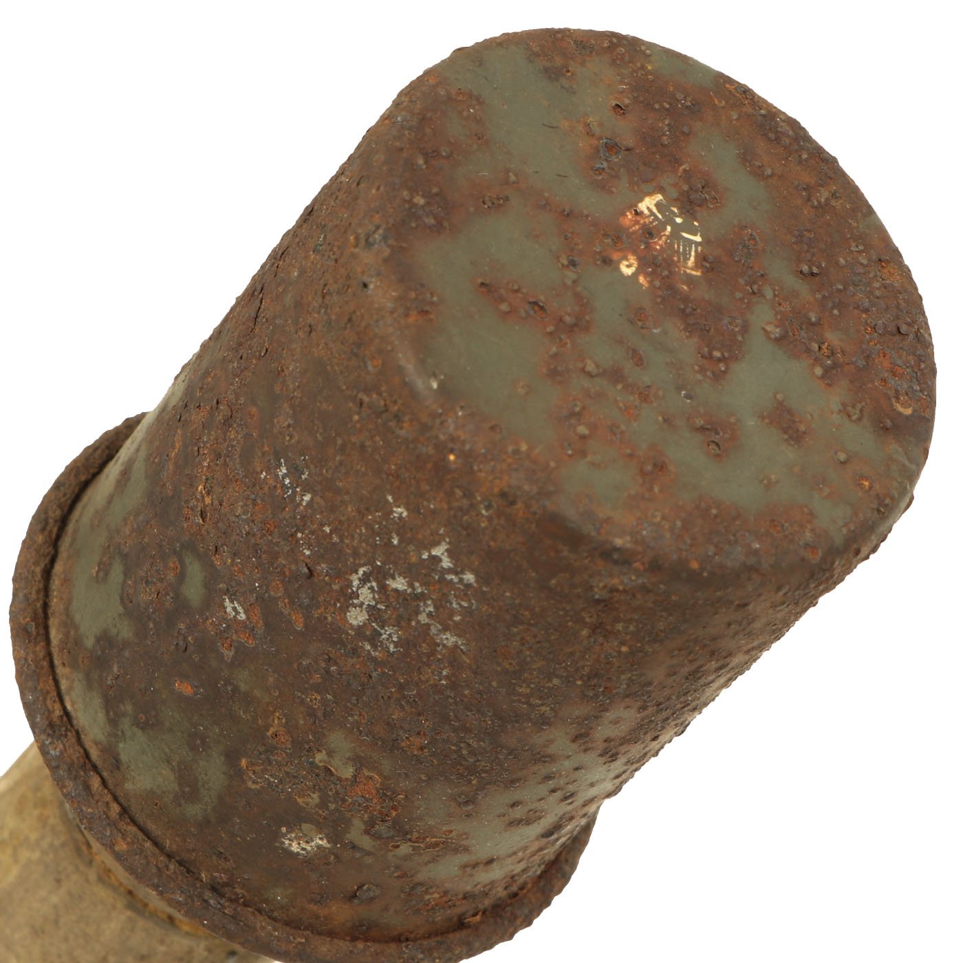 The warhead is in very nice condition and easily unscrews from the shaft. It still has most of the original green paint, and the top of the grenade does have markings, but due to paint bubbling some are obscured. However the 1938 date is still clear.