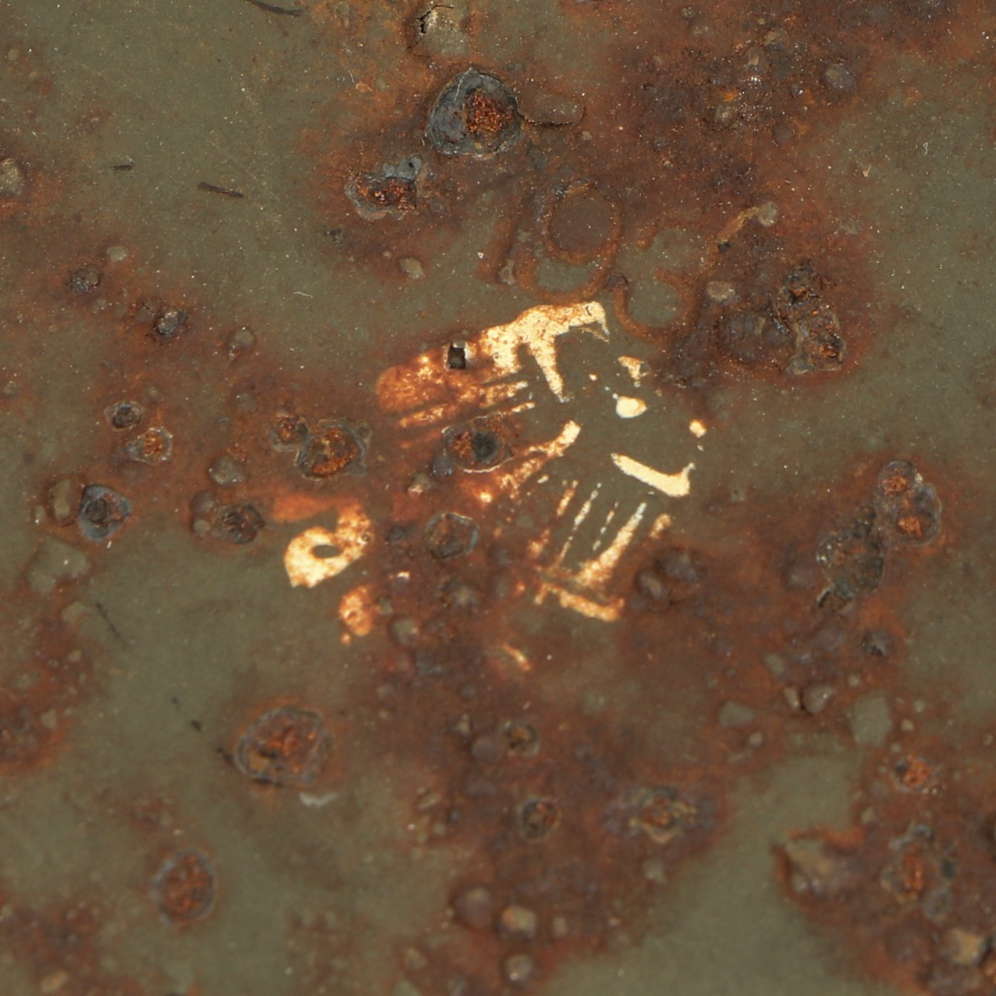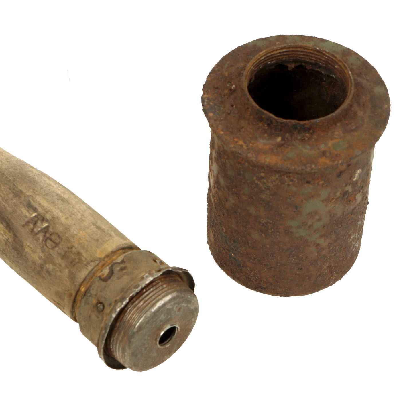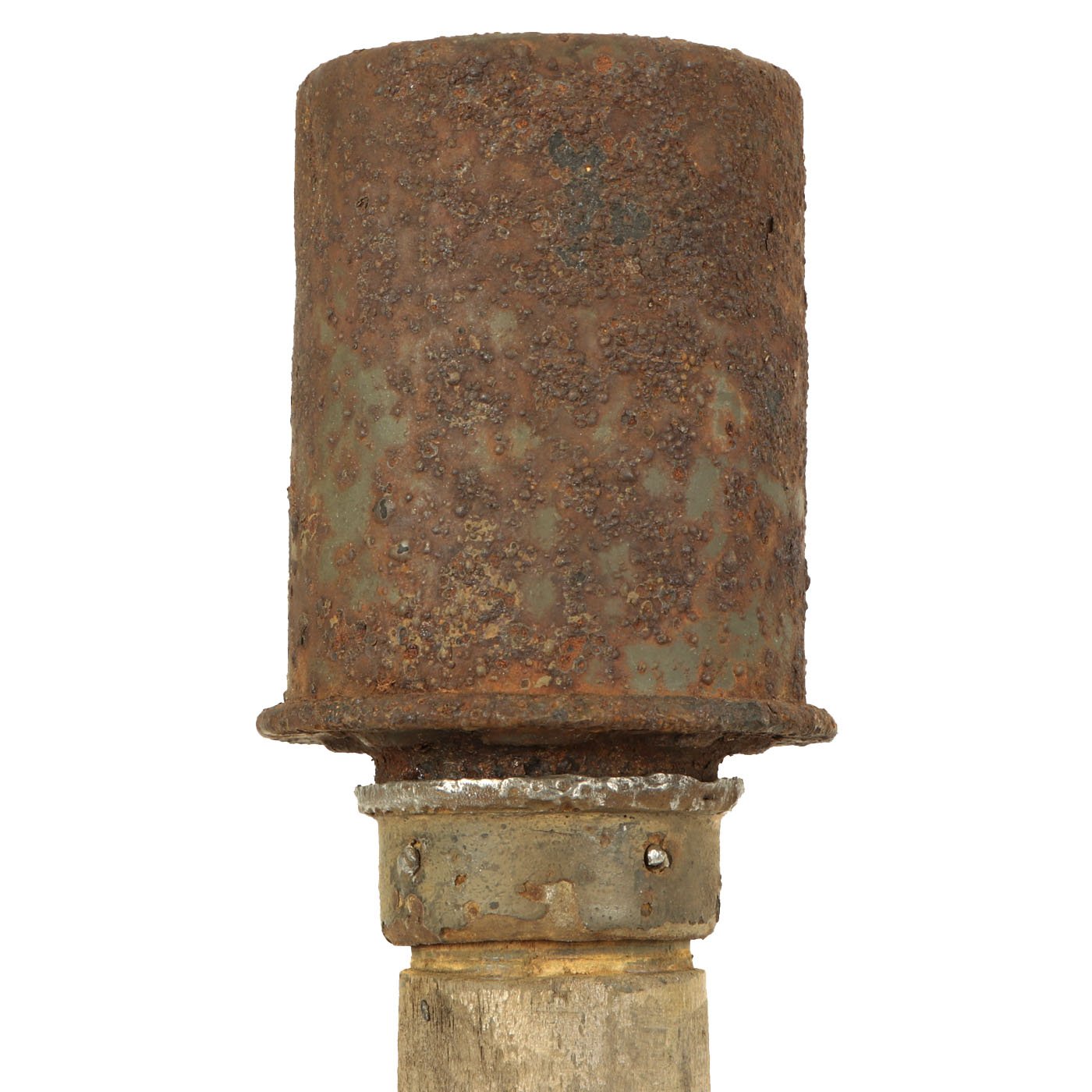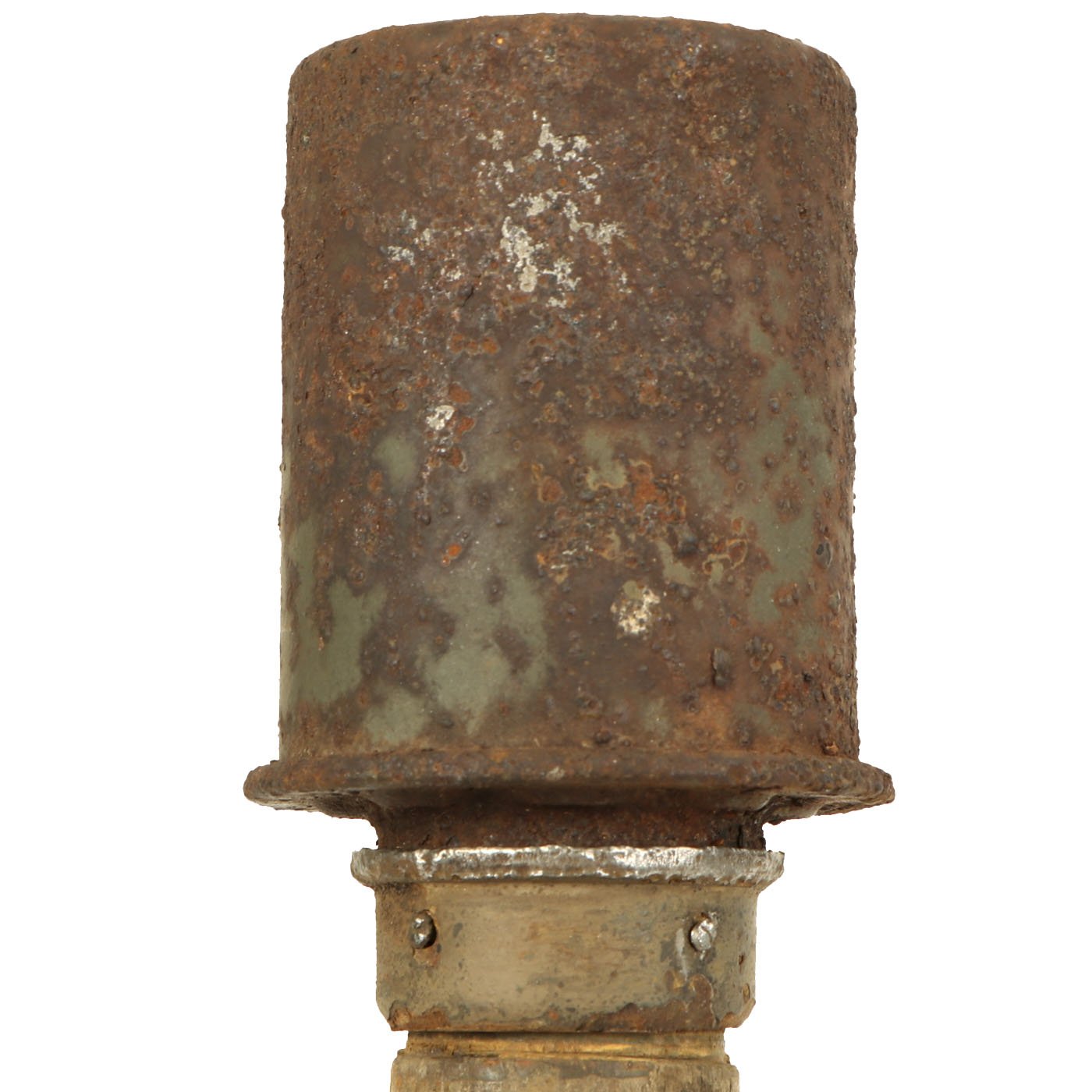 The warhead is in very nice condition and easily unscrews from the shaft. It still has most of the original green paint, and the top of the grenade does have markings, but due to paint bubbling some are obscured. However the 1938 date is still clear.