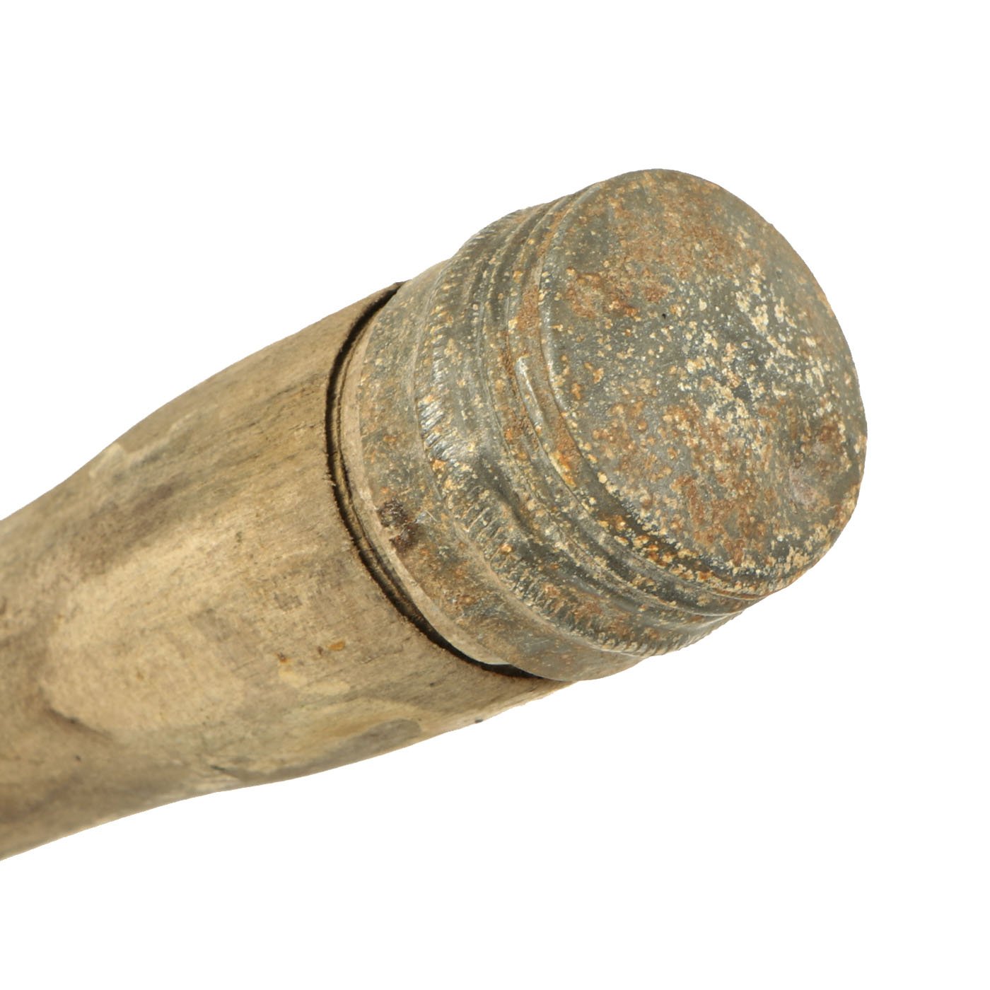 The wood shaft handle is very nice, with the wood in good shape, though there is discoloration and wear, as shown. It is maker marked near the top with 41 evy, indicating manufacture by Witwe Wilhelm von Hagen, Iserlohn Westfalen, in 1941. This firm is a metalworking business who manufactured grenades and artillery shell fuses during the war.