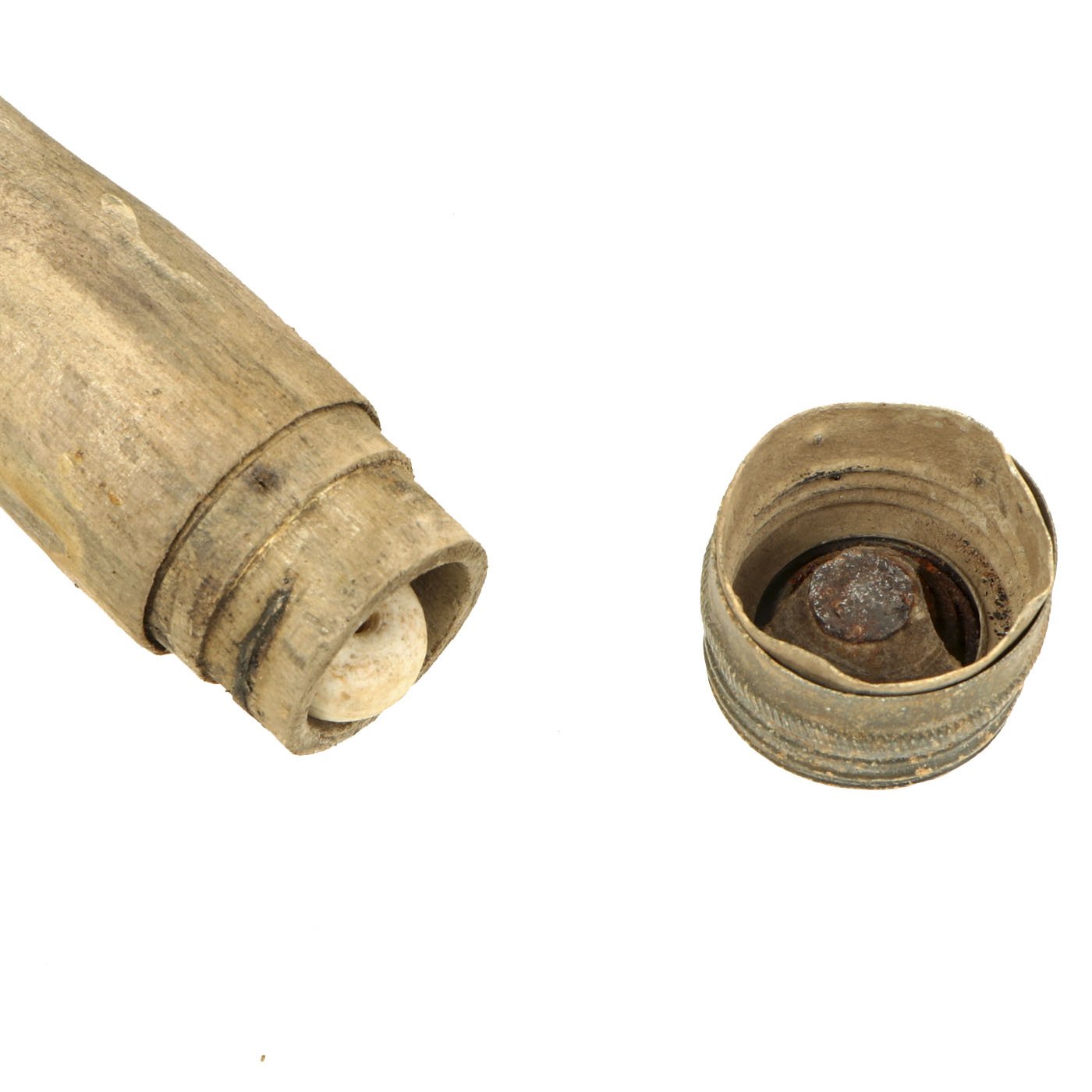 The lower screw cap is complete and unscrews, though it is definitely worn from age and use. It still has the original "spring" inside, but the pressed paper plunger is more than half missing. The shaft is correctly hollow to allow the internal components and porcelain "donut" bead with pull string. This example is missing the string, but still has the original pull bead intact! We very rarely see these anymore!