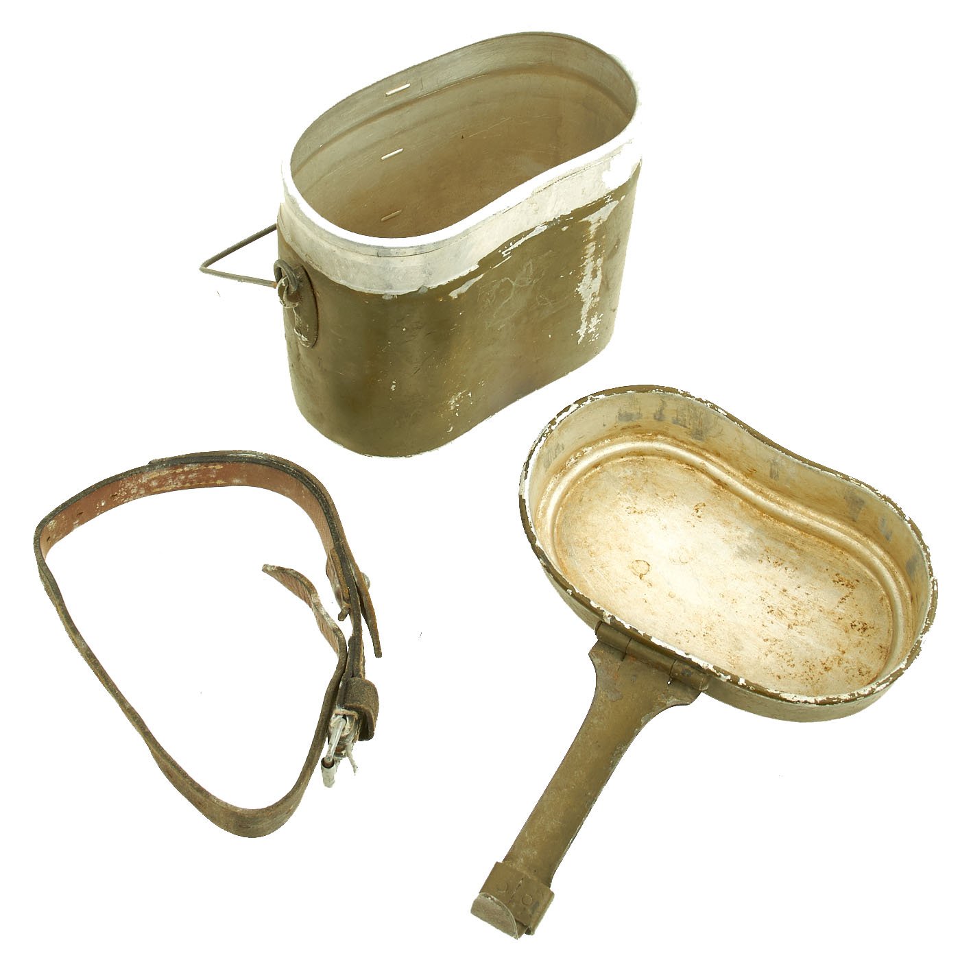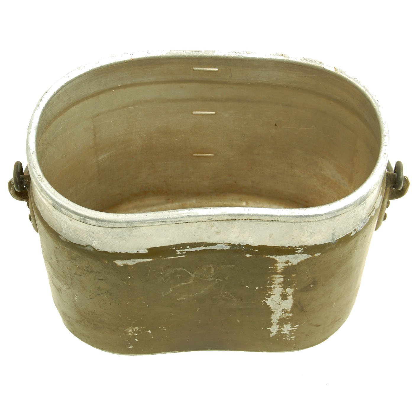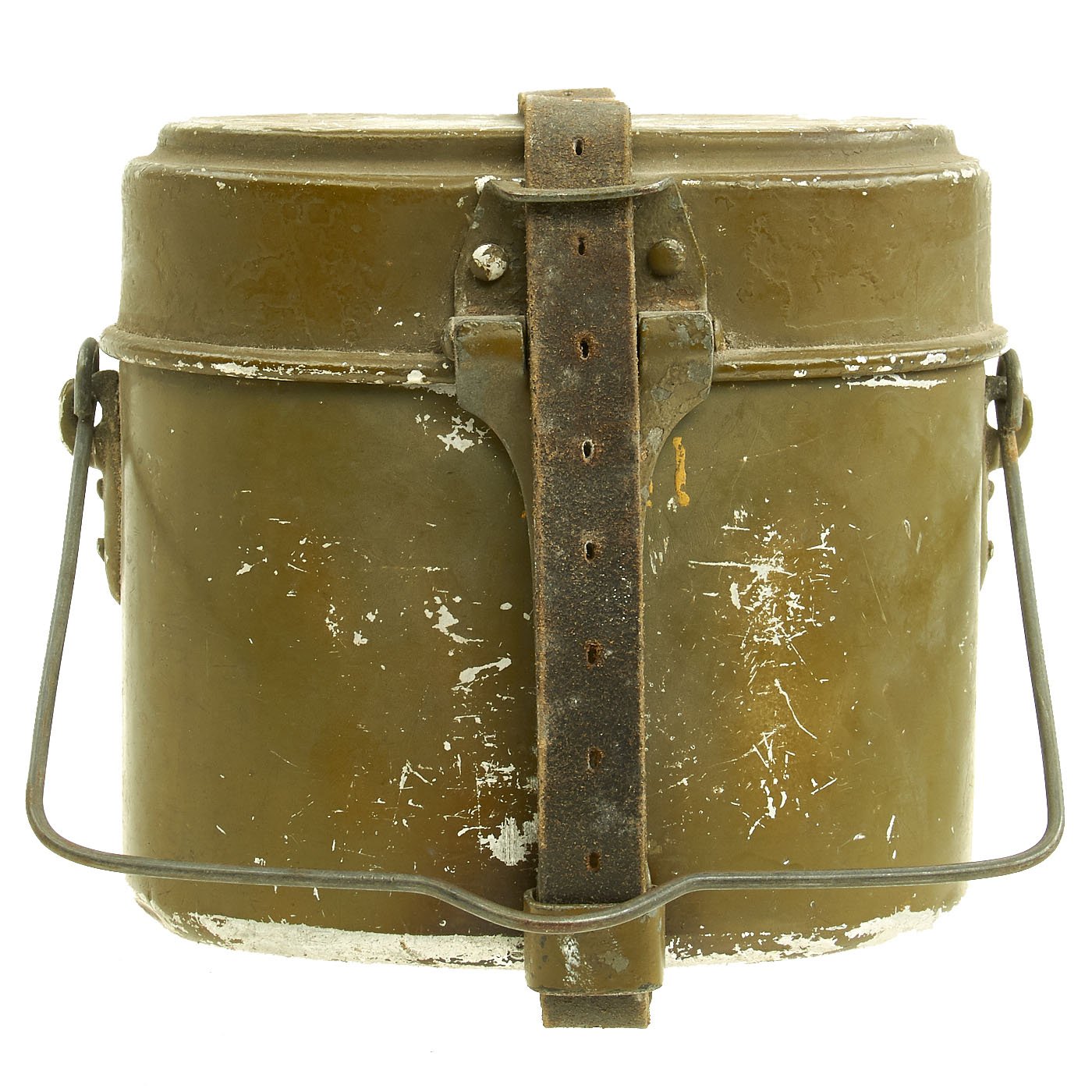 Early in the war, these were made entirely from aluminum. As the war progressed, they moved to steel handles on the lids, and eventually were made entirely of steel, such as this example. It is painted in the standard Green color, with a red primer base coat. The interior is coated with red enamel. It is maker marked MKL / 41 on the lid hinge and FEF 43 on one of the the fittings for the pot handle. Condition is very good, with the usual service wear to the outside, with some paint damage.