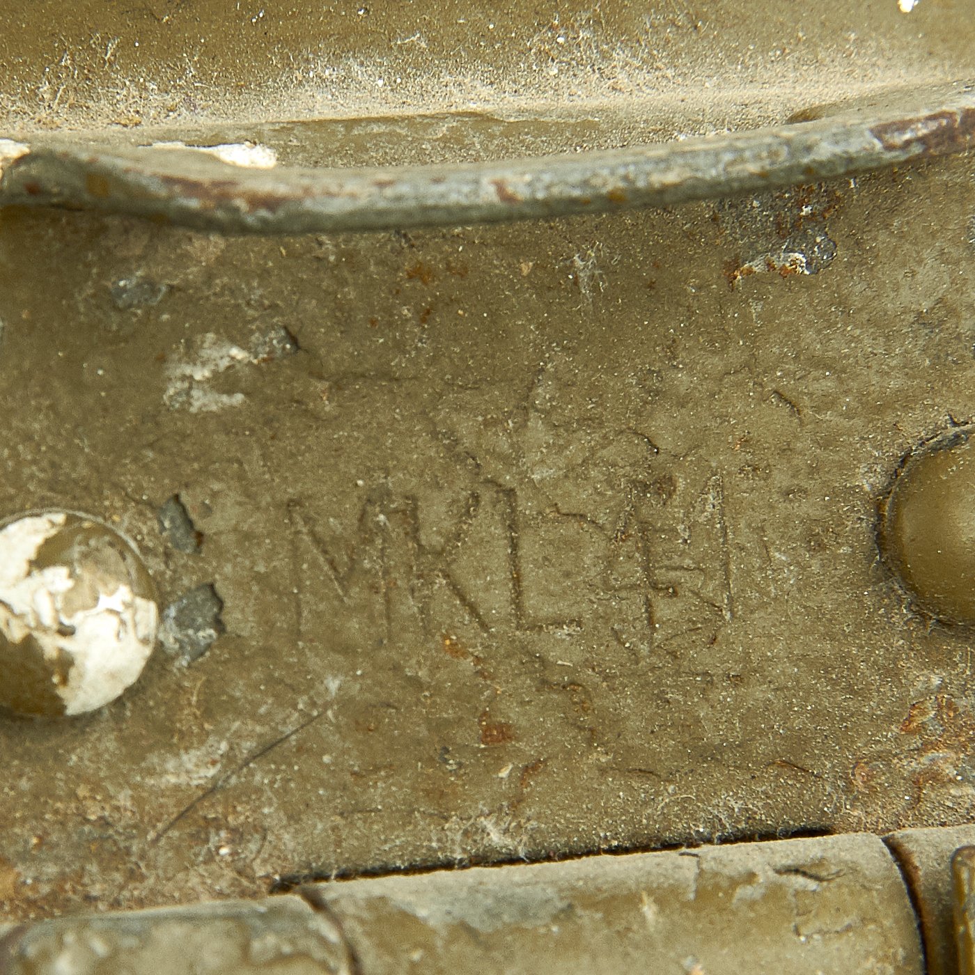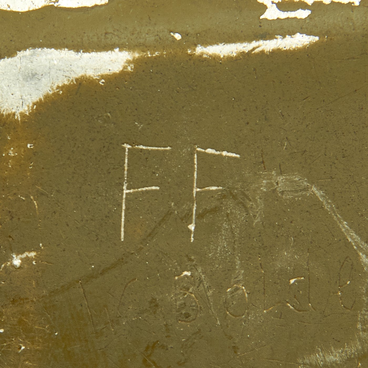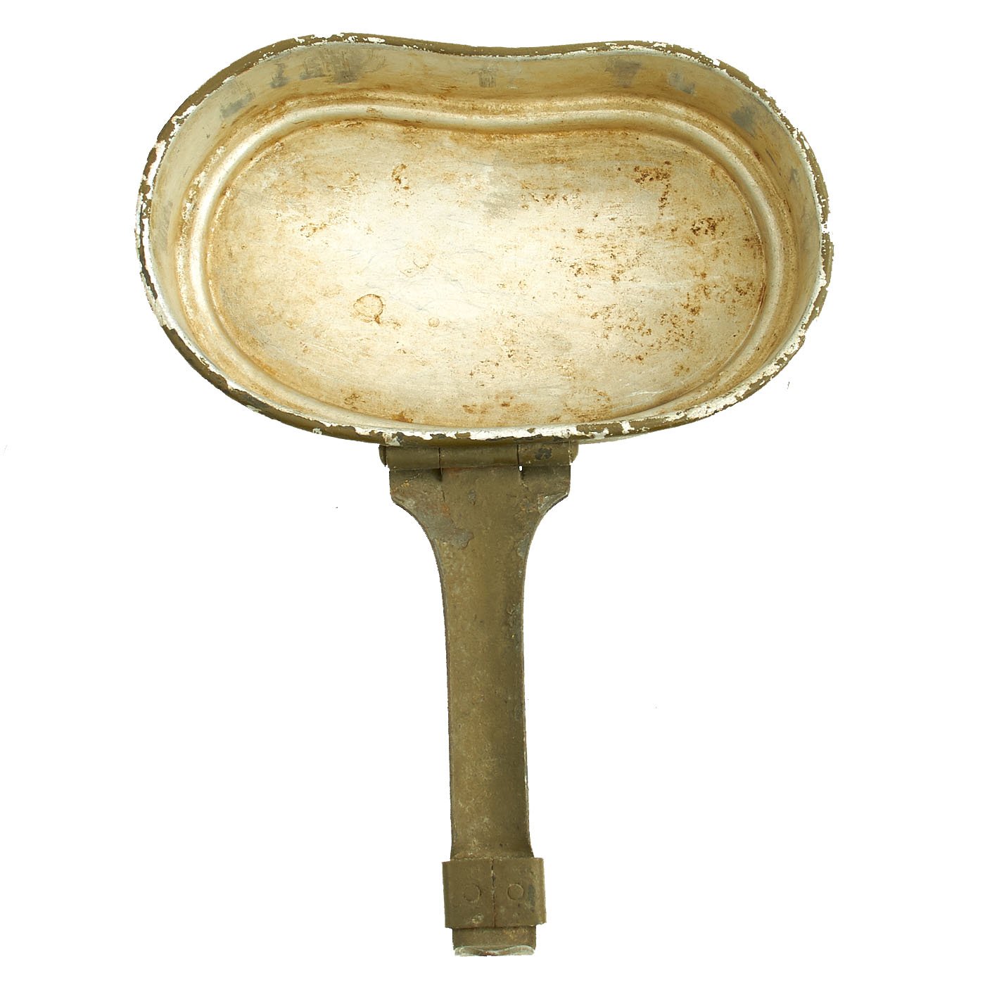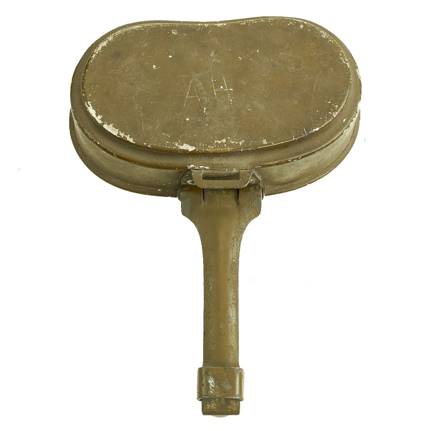 Early in the war, these were made entirely from aluminum. As the war progressed, they moved to steel handles on the lids, and eventually were made entirely of steel, such as this example. It is painted in the standard Green color, with a red primer base coat. The interior is coated with red enamel. It is maker marked MKL / 41 on the lid hinge and FEF 43 on one of the the fittings for the pot handle. Condition is very good, with the usual service wear to the outside, with some paint damage.