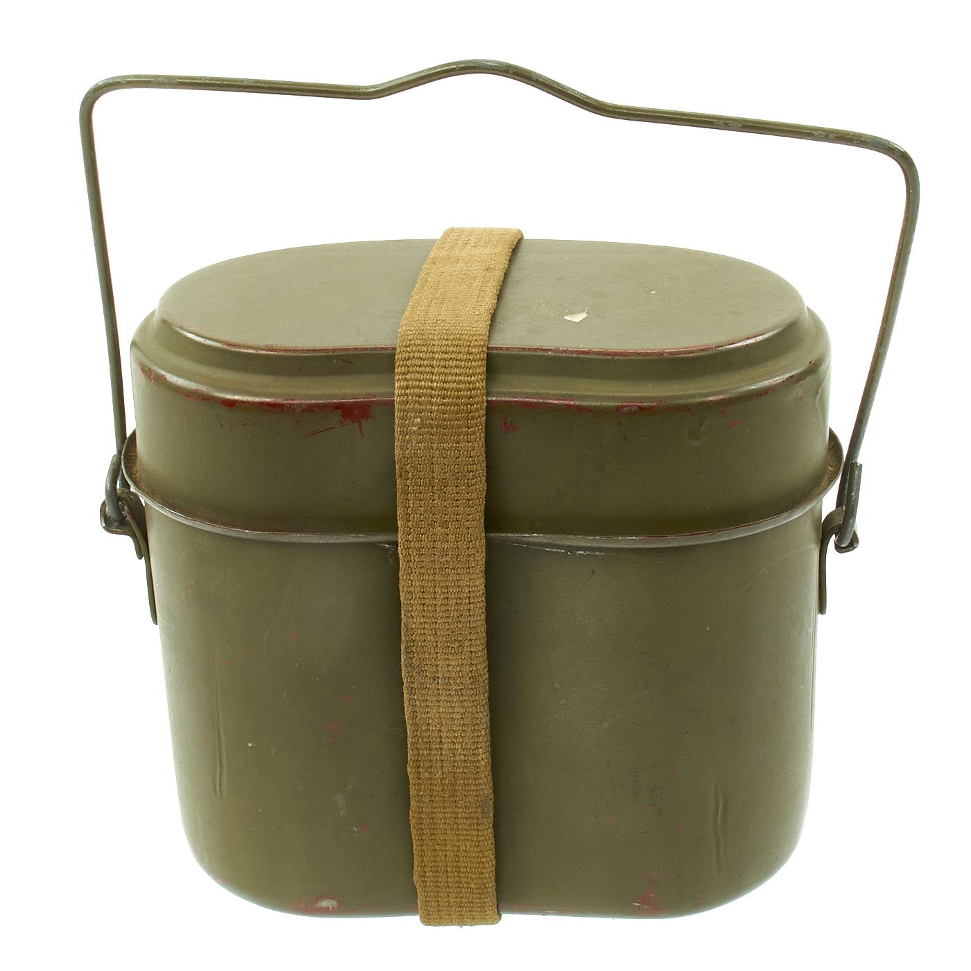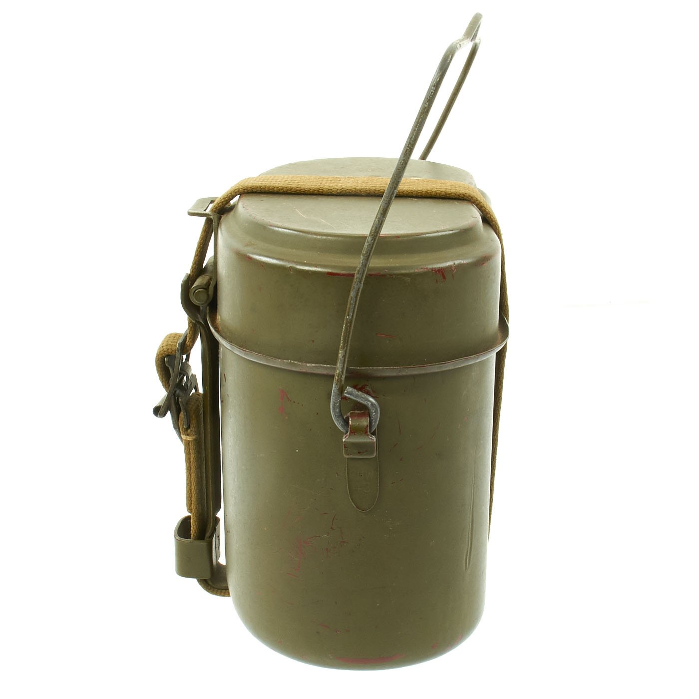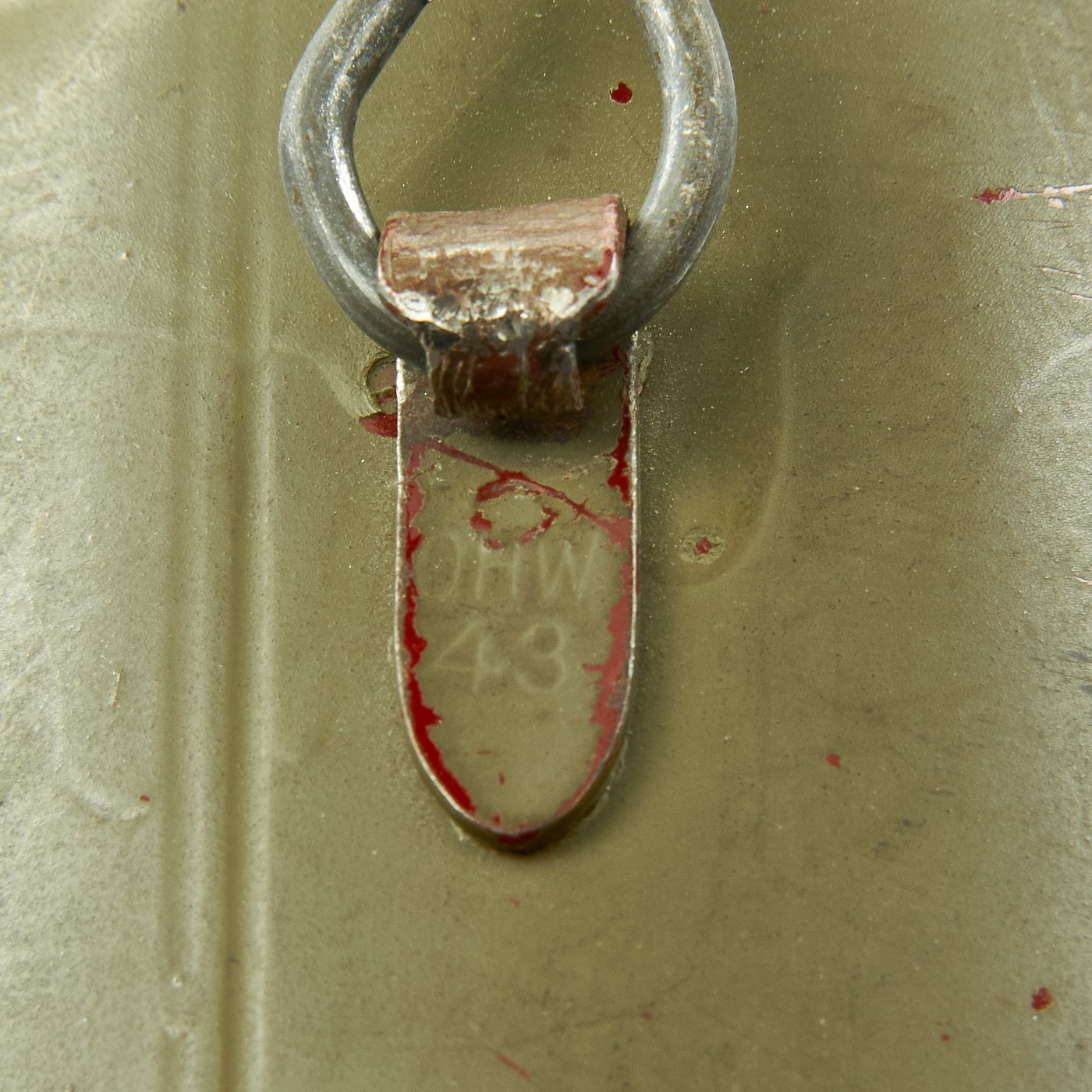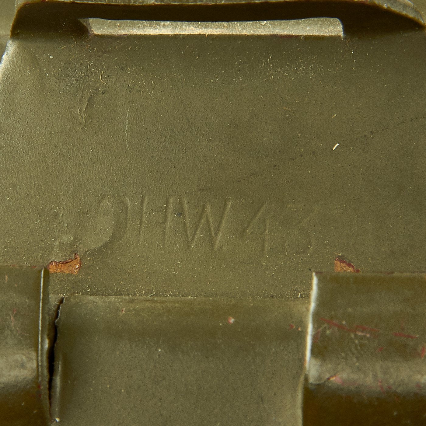 Early in the war, these were made entirely from aluminum. As the war progressed, they moved to steel handles on the lids, and eventually were made entirely of steel, such as this example. It is painted in the standard Green color, with a red primer base coat. The interior is coated with red enamel. It is maker marked DHW / 43 on both the lid hinge and on the fittings for the pot handle. Condition is very good, with just light wear to the outside, with some paint damage. There also was damage to one of the handle fittings, which was then field repaired.