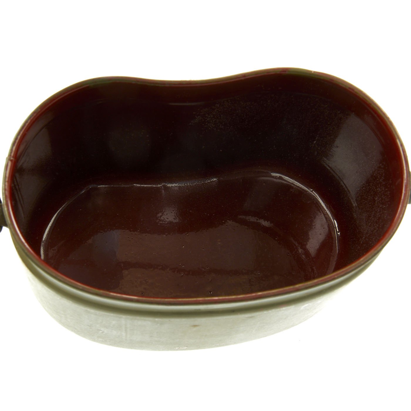 Original Item: Only one available. This is a very nice late war example of a German Mess Tin M31 or Kochgeschirr Modell 1931 (cooking pot Model 31). A scaled down version of the earlier M1910, it it is a kidney shaped cooking pot with a total capacity of 1.7 liters. It cconsists of 2 parts: the pot with the wire handle, and a cover with a handle to use as a plate.