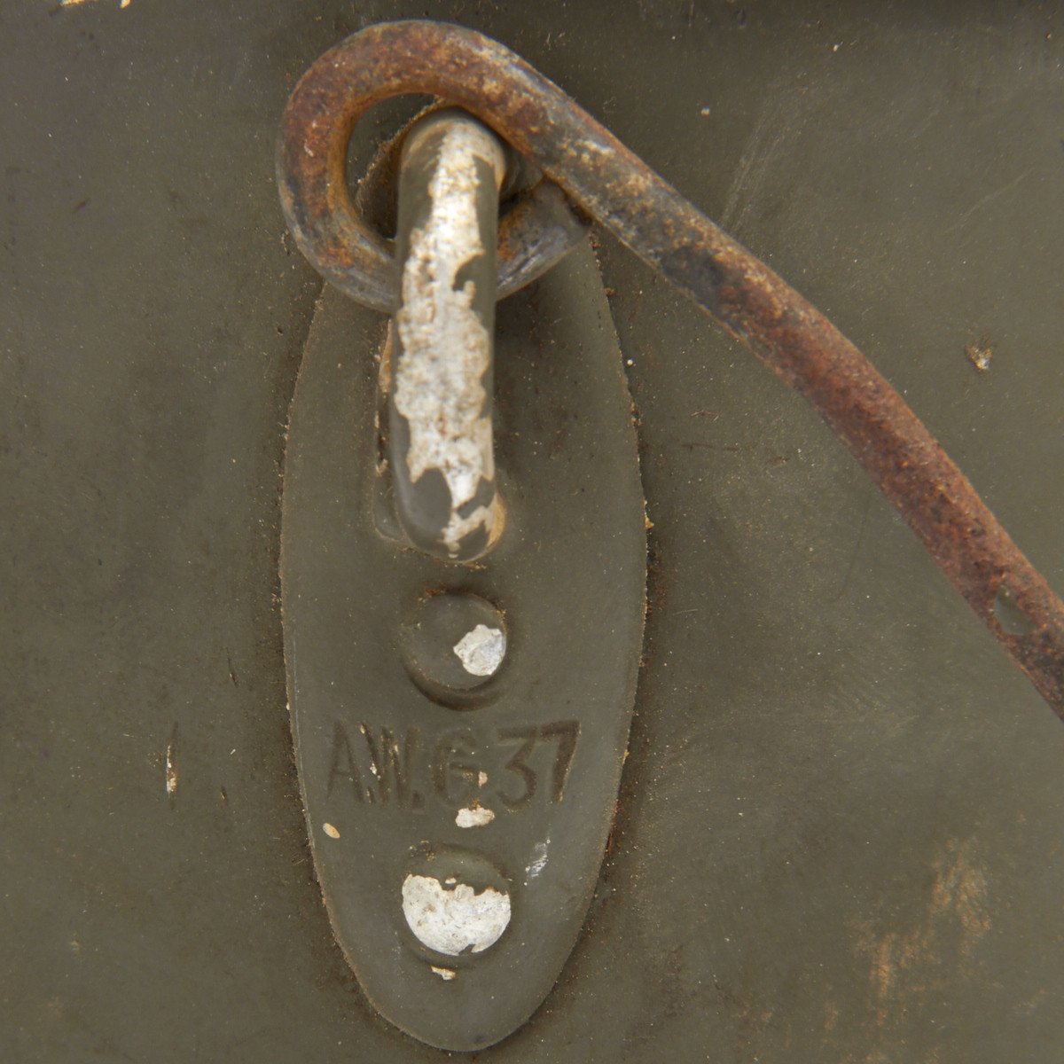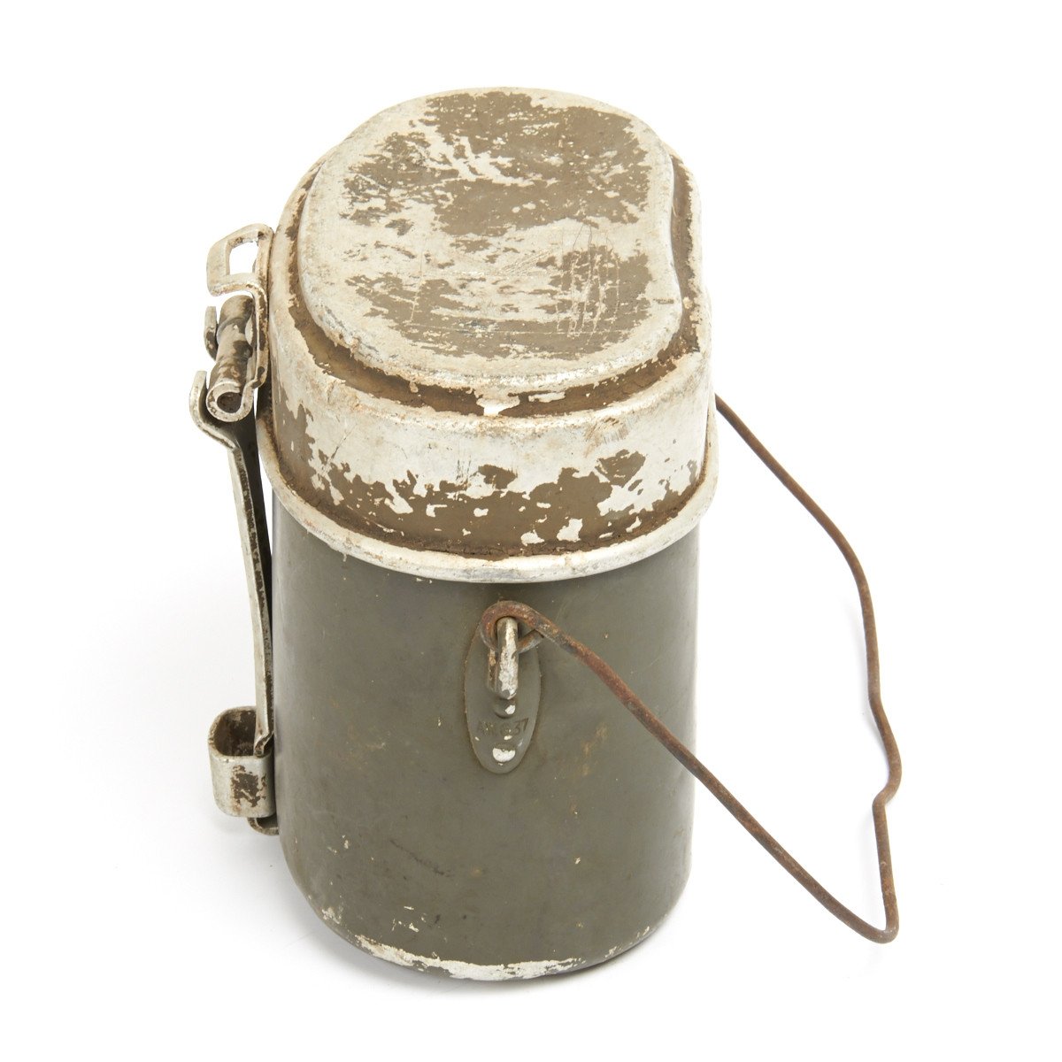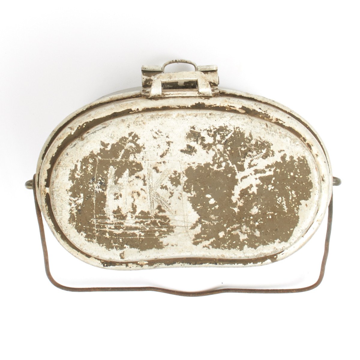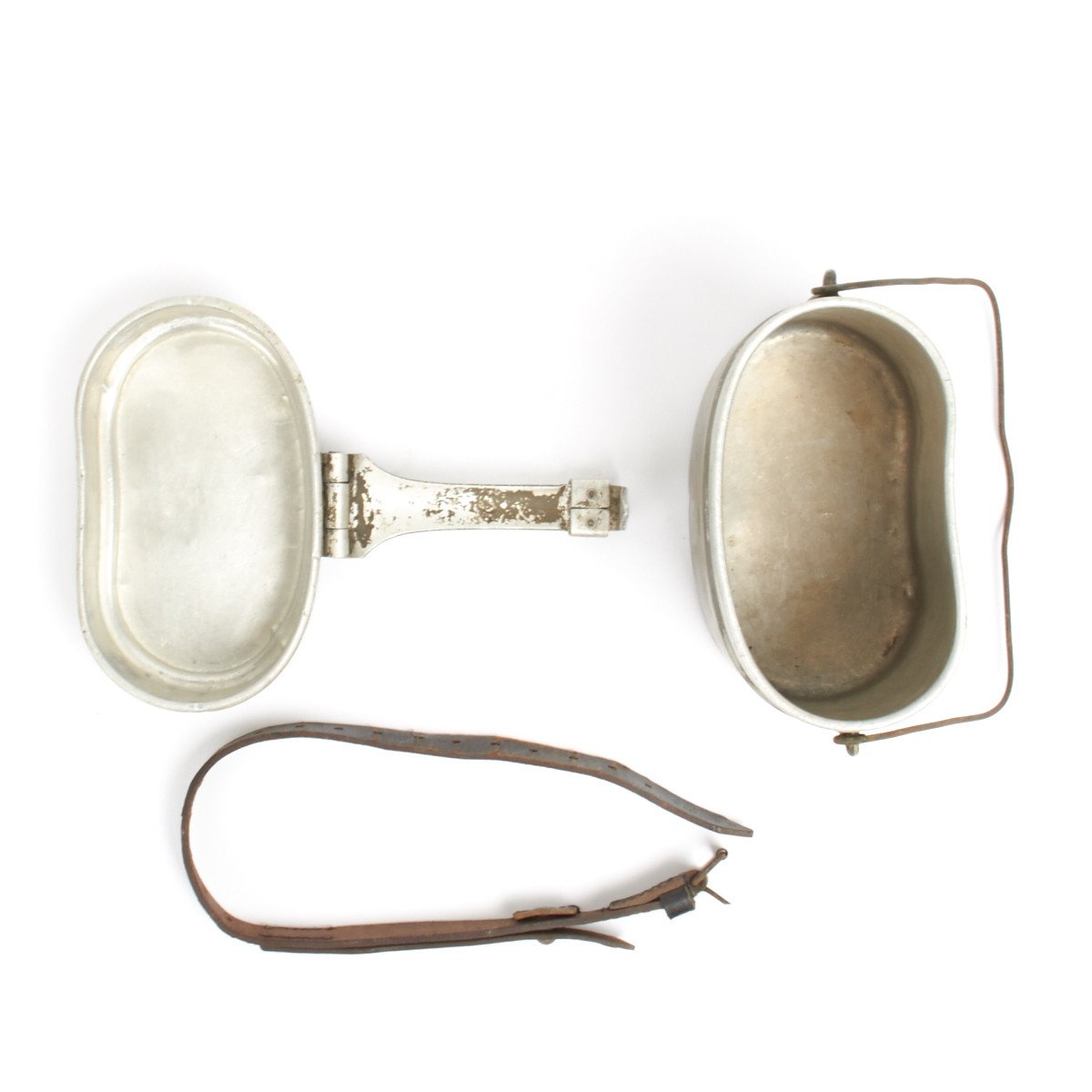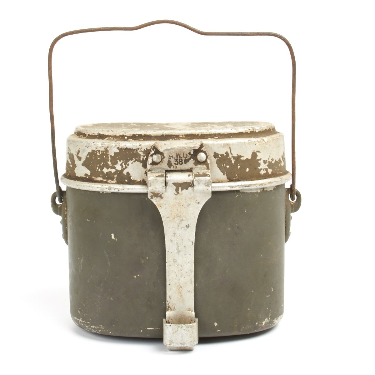 Original Item: The Mess Tin M31 or Kochgeschirr Modell 1931 (cooking pot Model 31) was a kidney shaped cooking pot with a total capacity of 1.7 litres. It consisted of 2 parts: the pot with the wire handle, and a cover with steel handle. This nice example is constructed of Aluminum, and is marked on the lid: