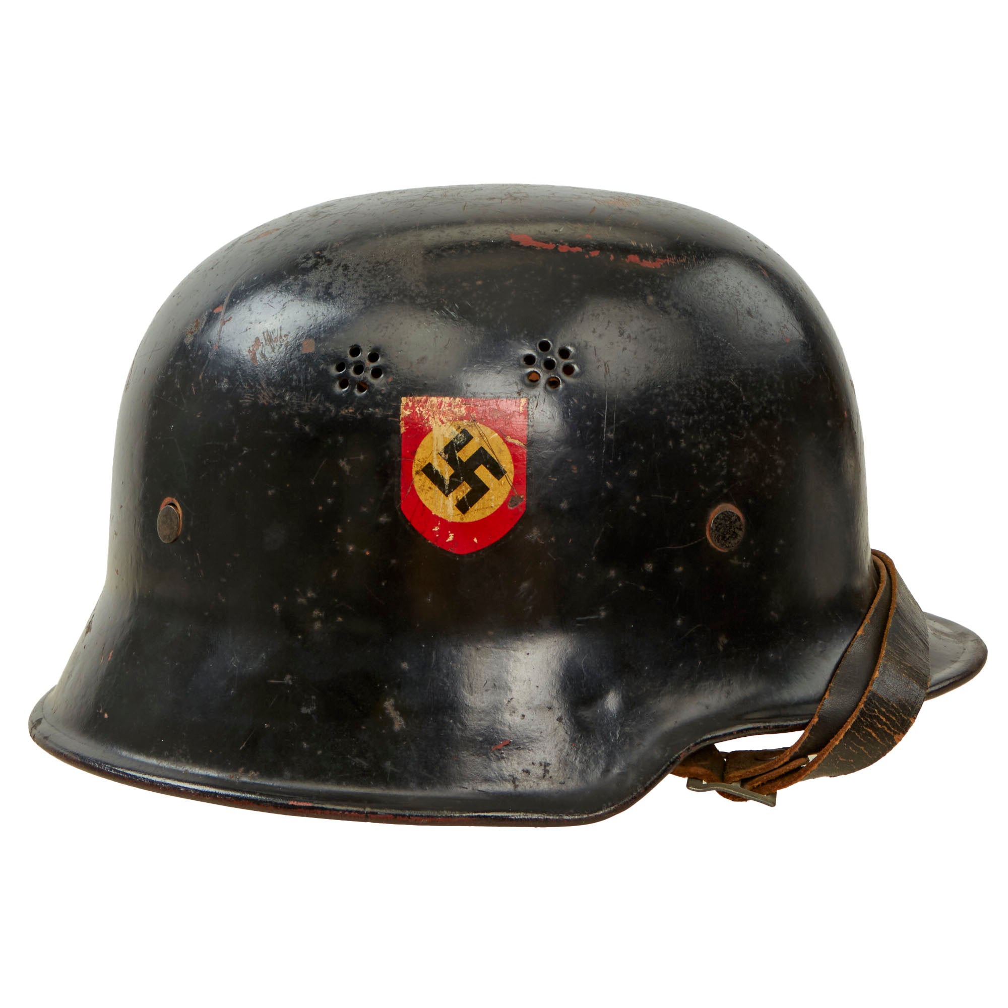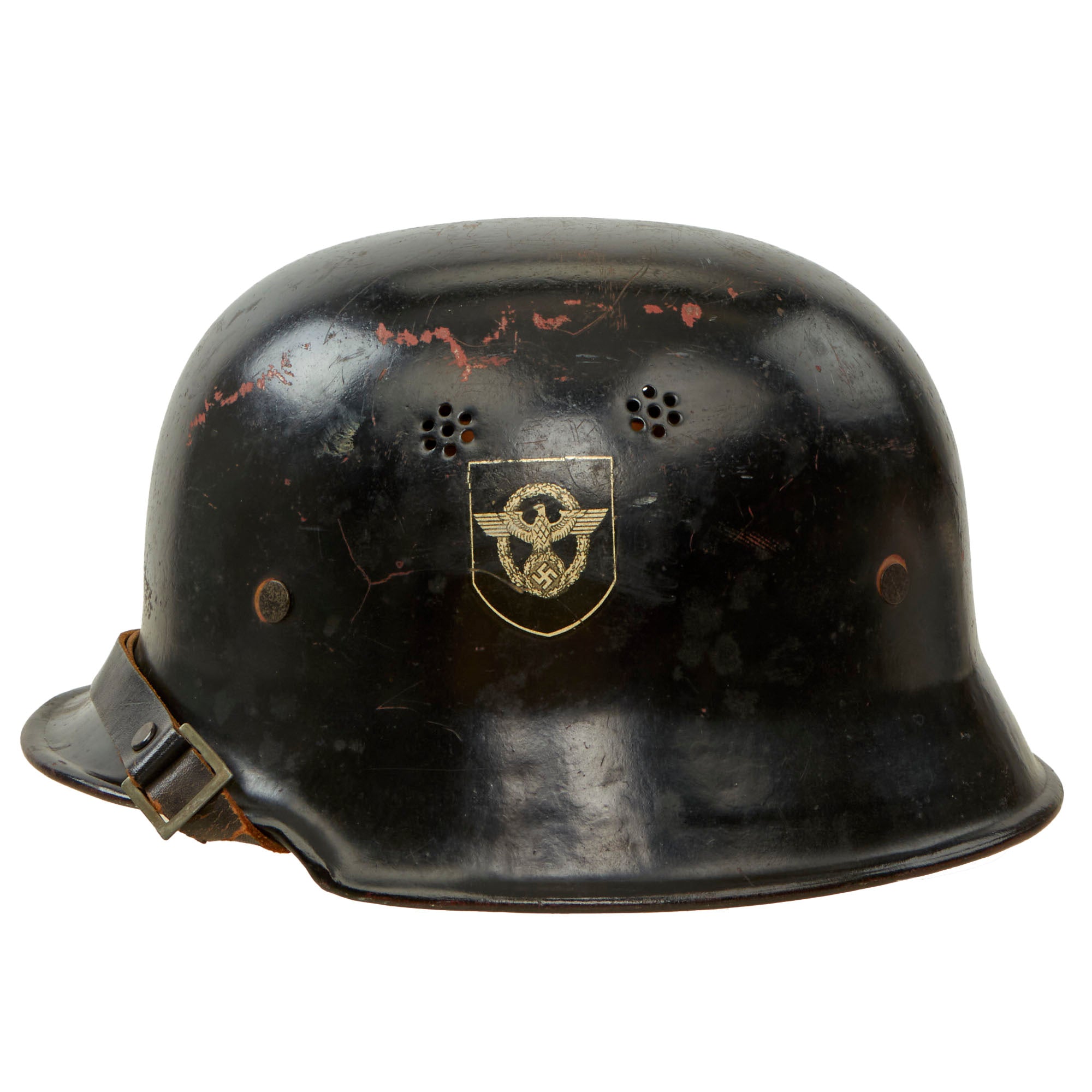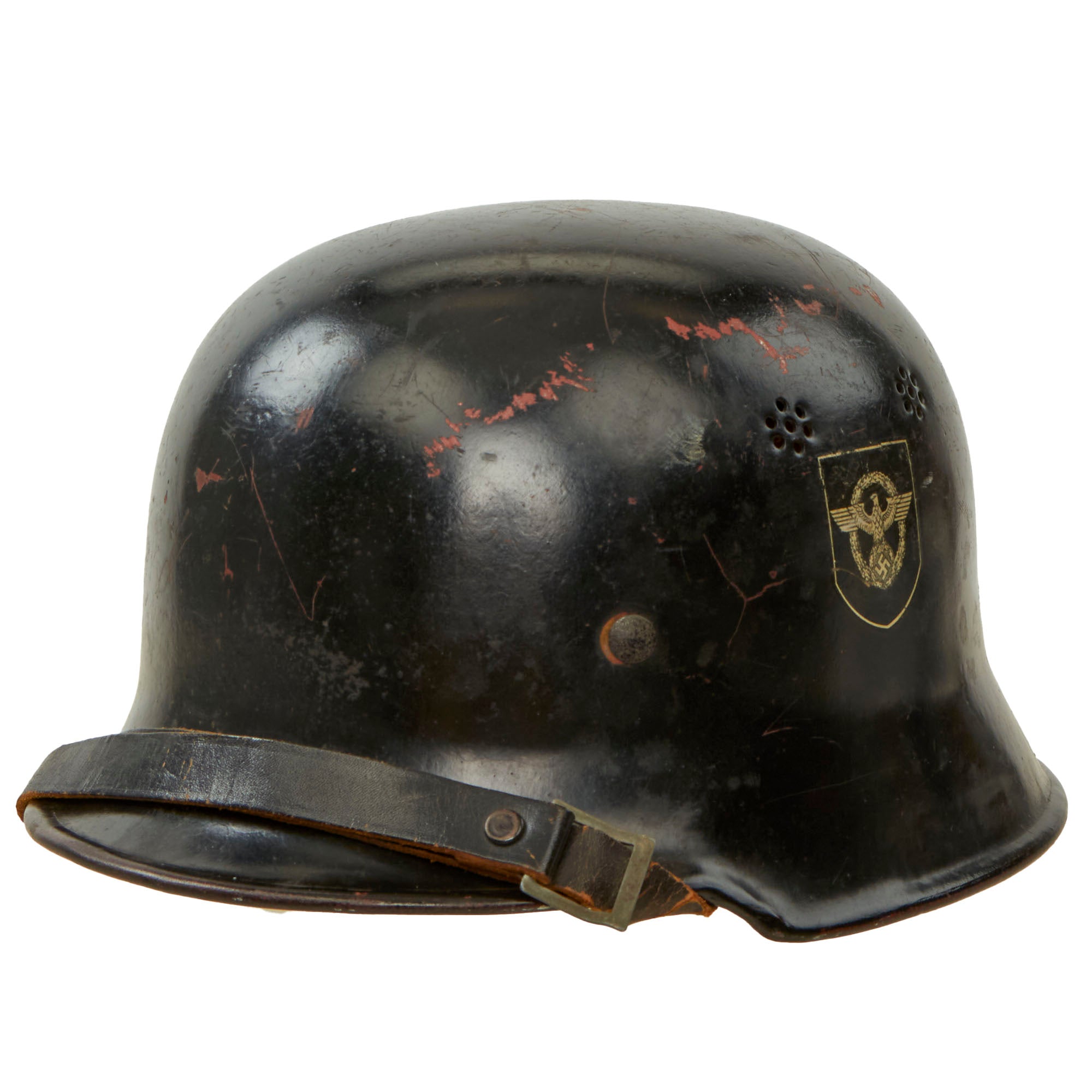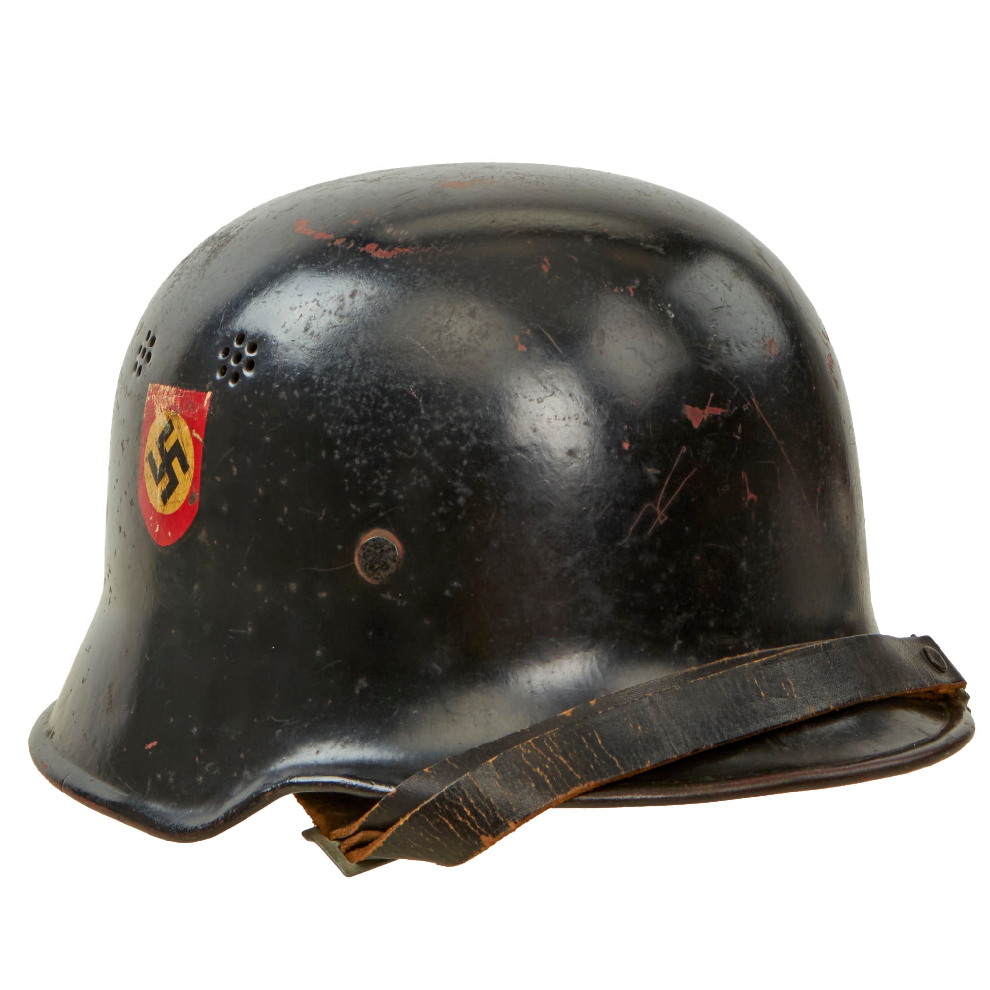 Original Item: Only One Available. This is a nice, genuine steel construction M34 "Square Dip" Third Reich helmet, outfitted for German WW2 Ordnungspolizei civic police issue. Features genuine double decals of civic eagle and NSDAP swas shield. Comes with a complete leather liner and chin strap, and all four original attachment split pins are intact, along with their cork spacers.