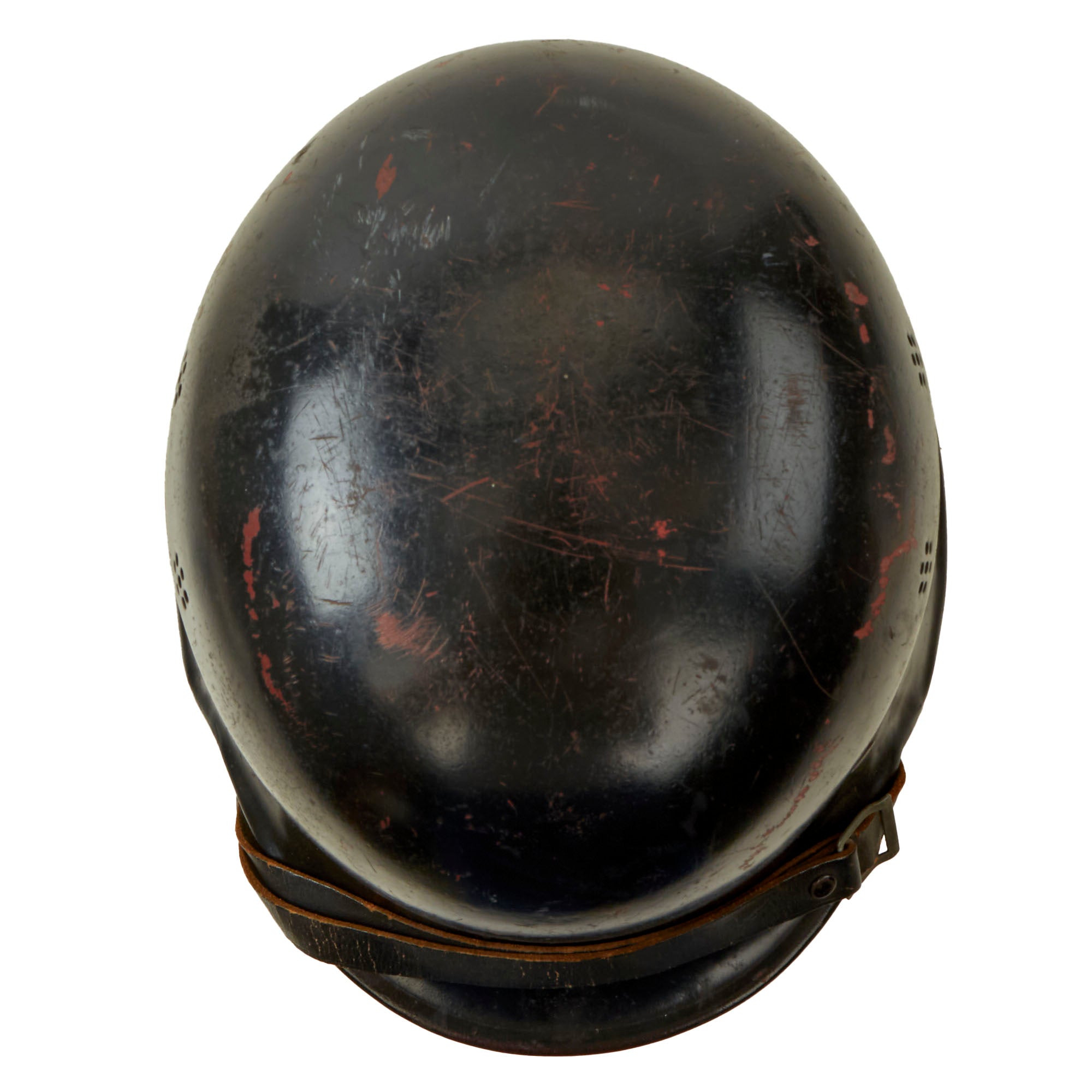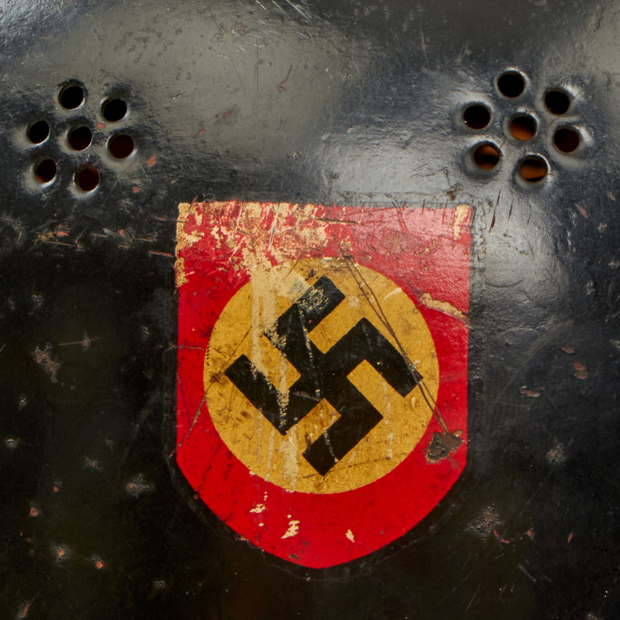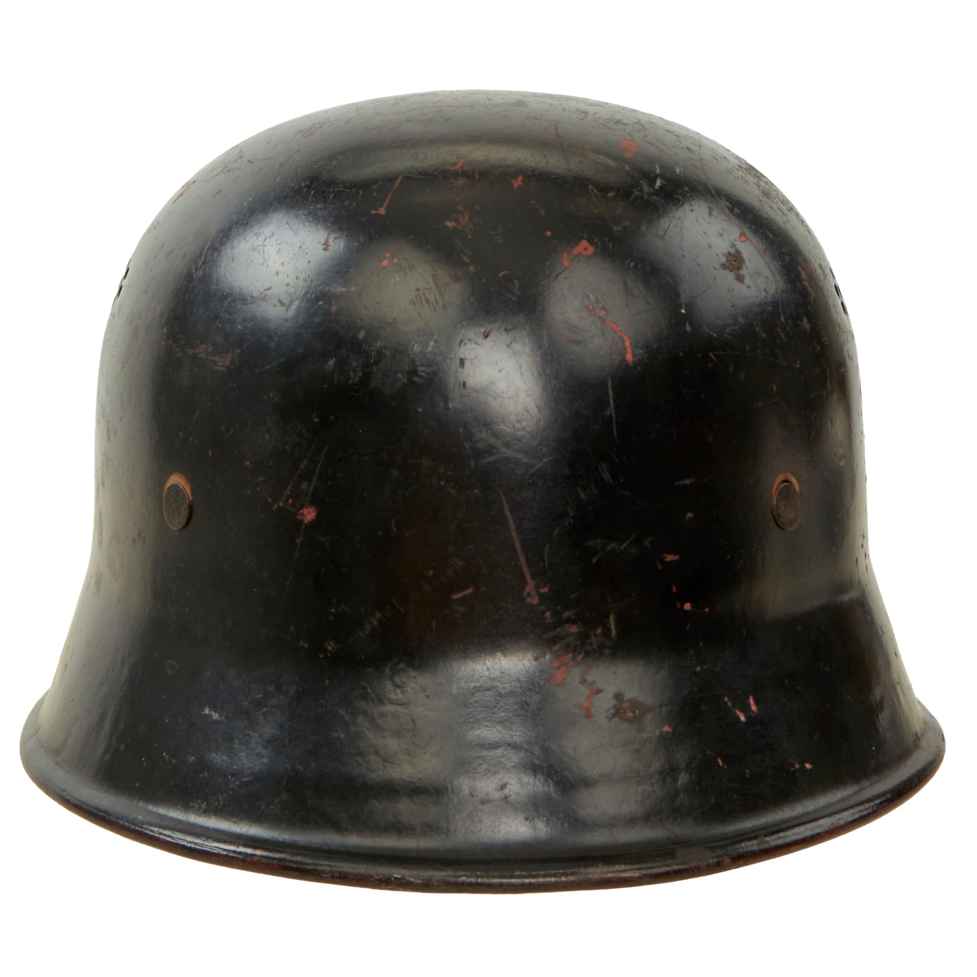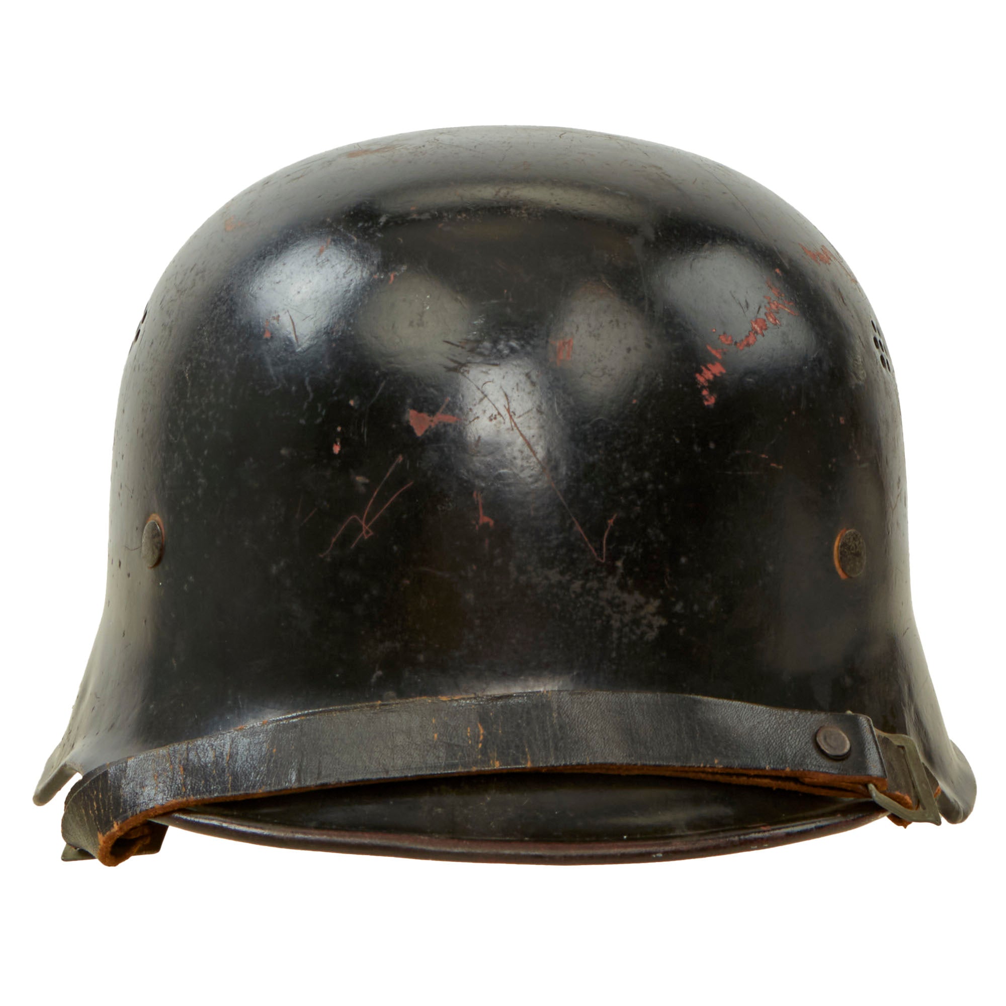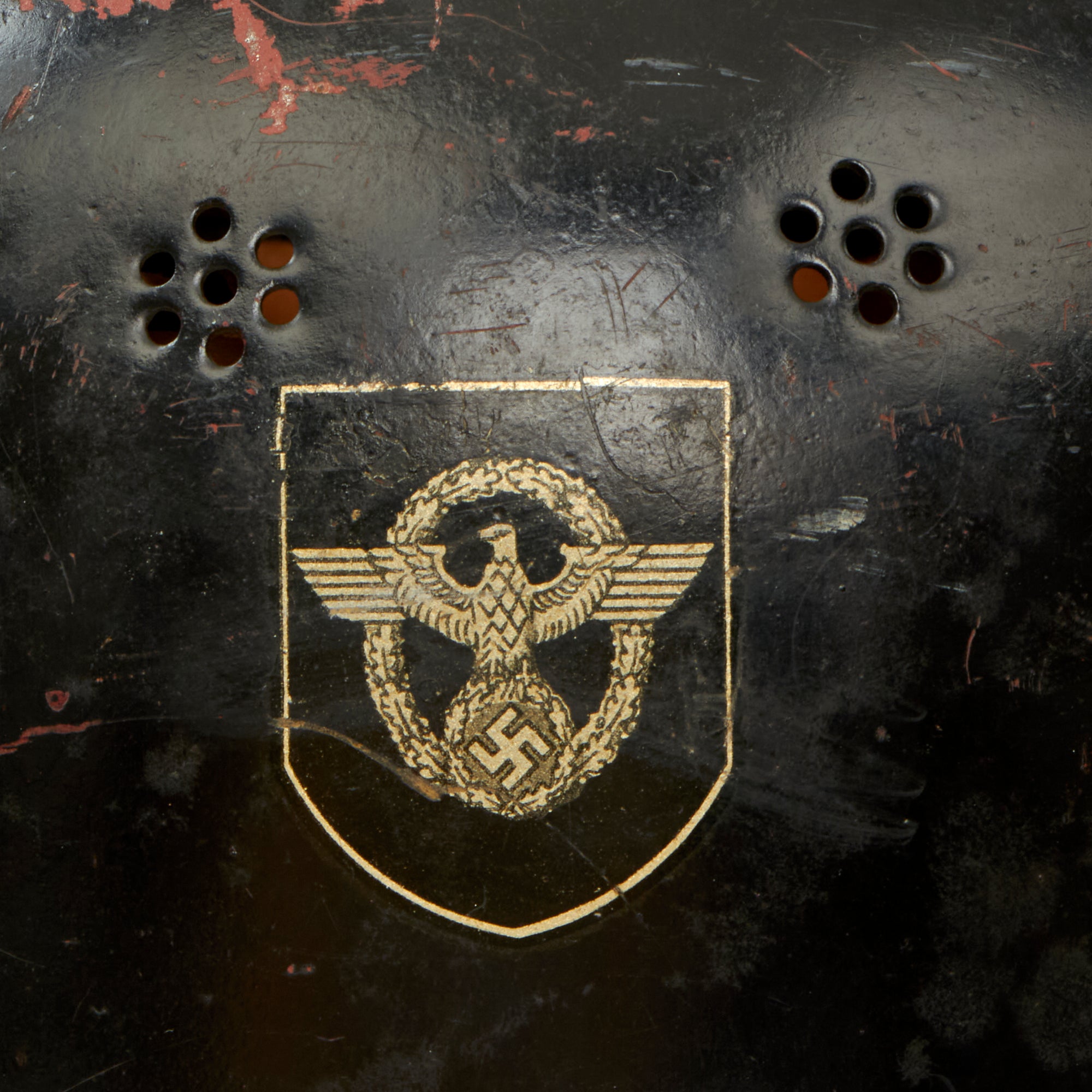 Original Item: Only One Available. This is a nice, genuine steel construction M34 "Square Dip" Third Reich helmet, outfitted for German WW2 Ordnungspolizei civic police issue. Features genuine double decals of civic eagle and NSDAP swas shield. Comes with a complete leather liner and chin strap, and all four original attachment split pins are intact, along with their cork spacers.