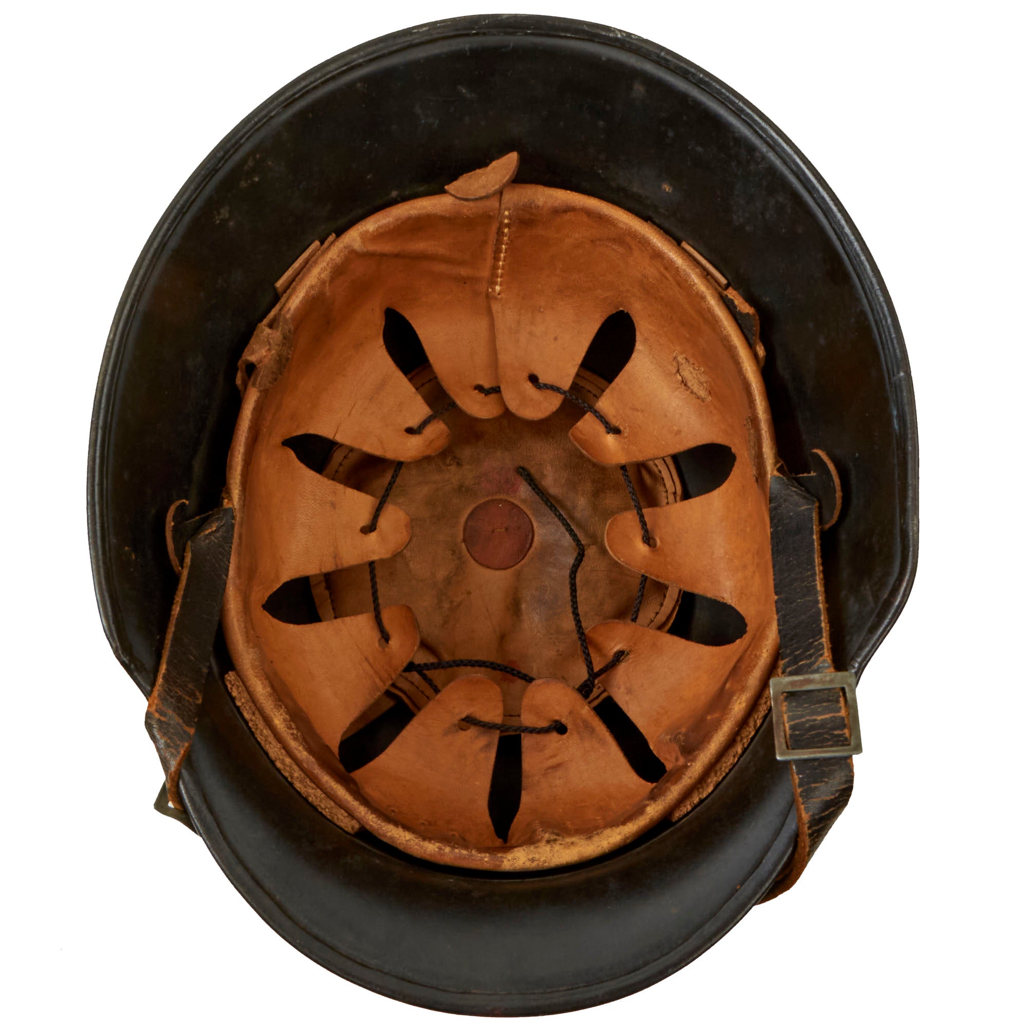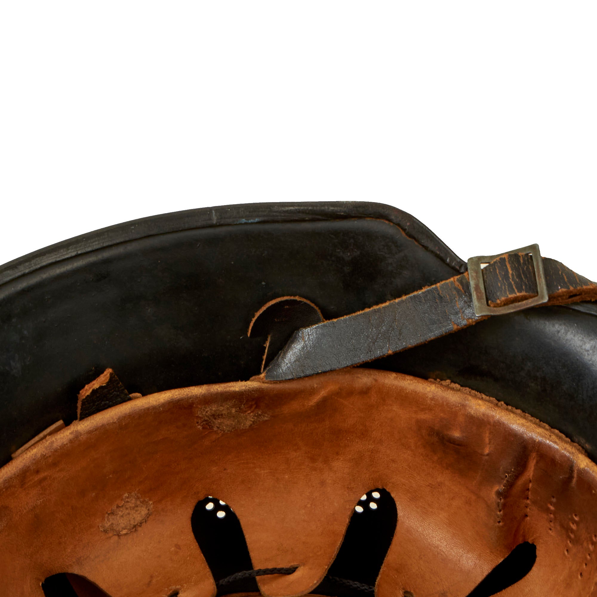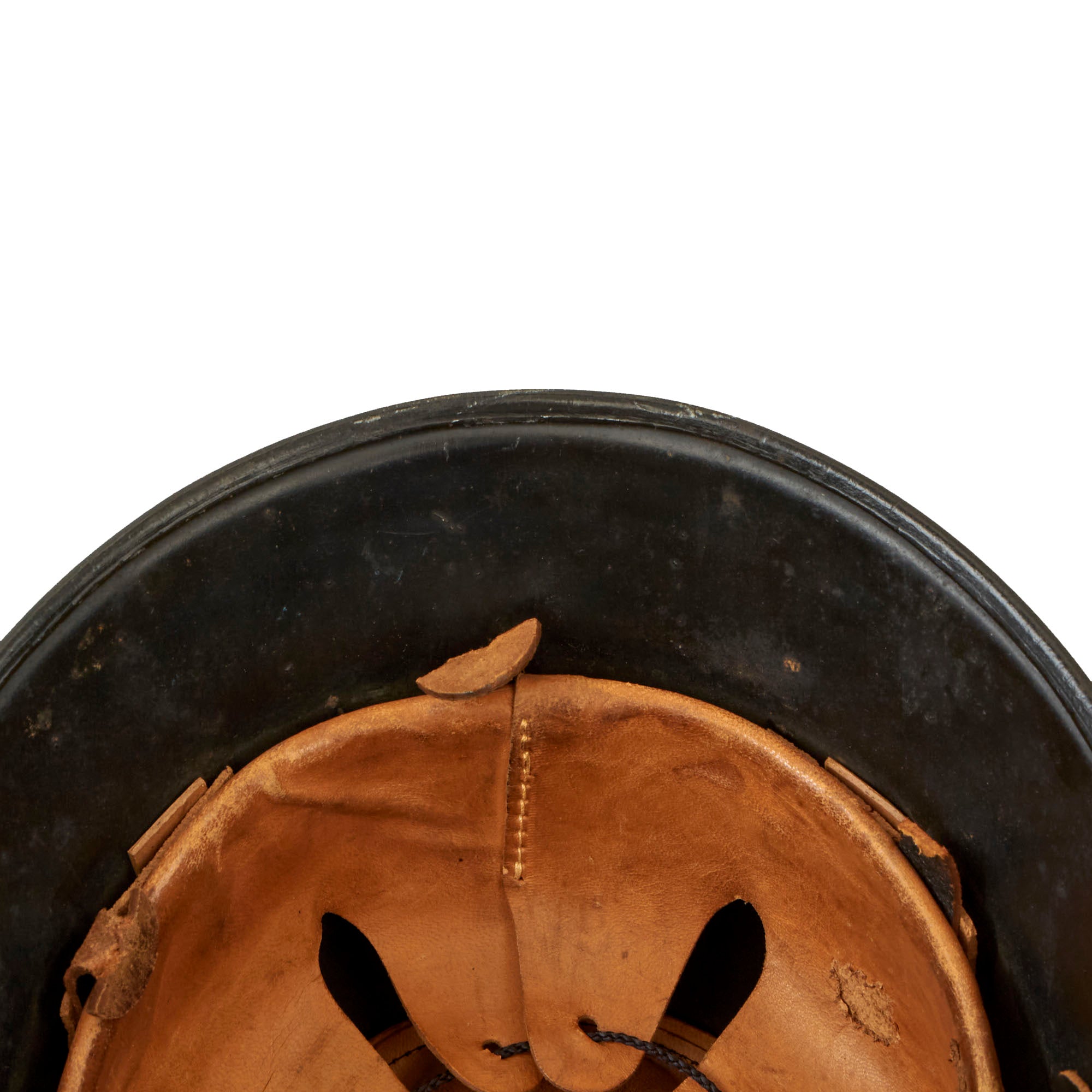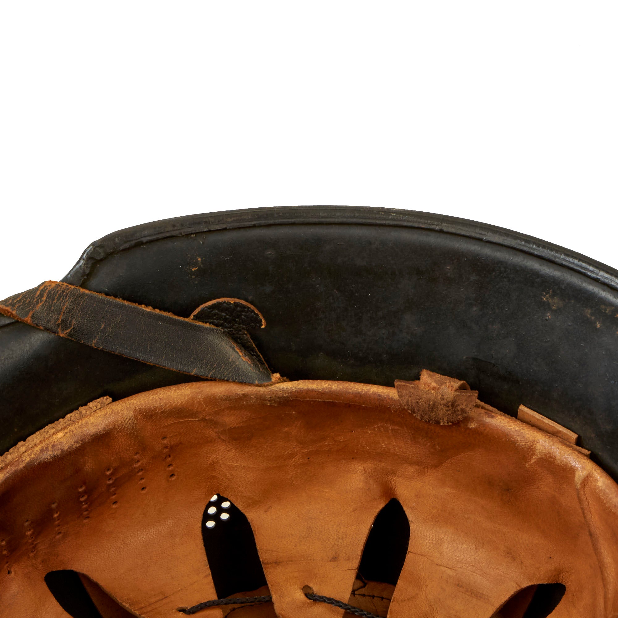 The exterior of this German helmet retains much of the original semigloss black paint on the exterior, with some larger scratches on the crown area, which have exposed the red primer used on this shell. We usually only see this on very early issued helmets, after which they stopped using the red primer. There are also smaller scratches present, along with scuffs and the usual wear from service. Both decals are retained at about 85%, with some nice age related discoloration, particularly on the NSDAP shield. Both show light overall wear and some minor chipping. The interior has retained the black paint very well, with just a bit of wear. We checked the inside of the shell, and we were not able to see any maker stamps, which is not uncommon.