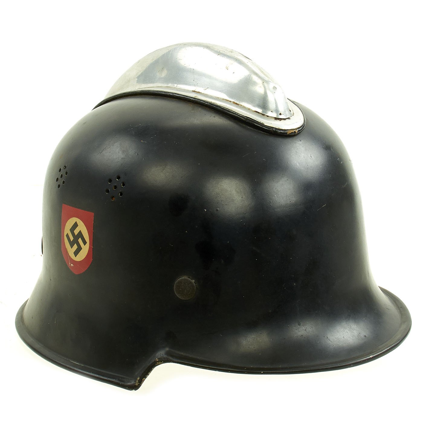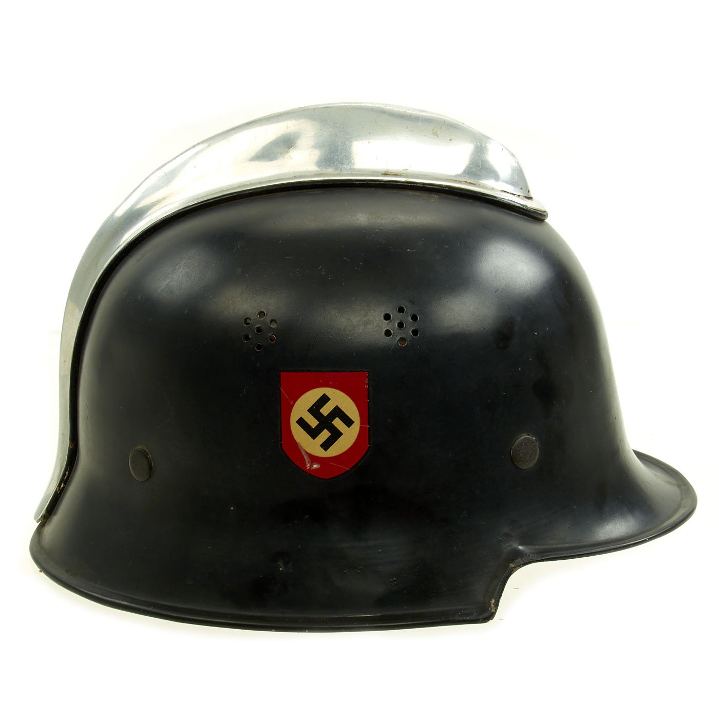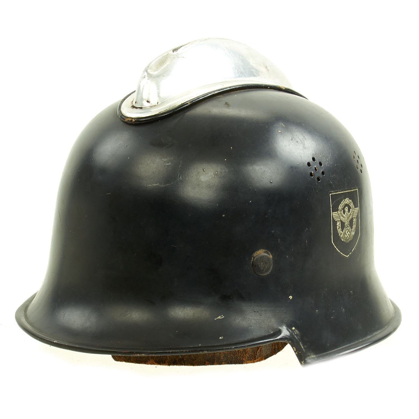 Original Item: Only One Available. This is a very rear all aluminum construction M34 "Square Dip" Third Reich helmet, outfitted for German WWII Fire Police (Feuerwehr) issue. Almost all of these that we have seen have a steel shell, however this shell aluminum, with an aluminum comb on top. Features genuine double decals of of a NSDAP Party Shield on the right, and NSDAP Civic Police Eagle on the left. Comes with a complete size 56 faintly marked leather liner with all split pins, though the foam rubber padding disintegrated long ago, typical for early types of rubber. The chin strap is partly missing, with probably about 3 inches from the right side missing. The remainder is in delicate condition. The liner still retains the five leather "tabs" that would allow attachment of the rear skirt.