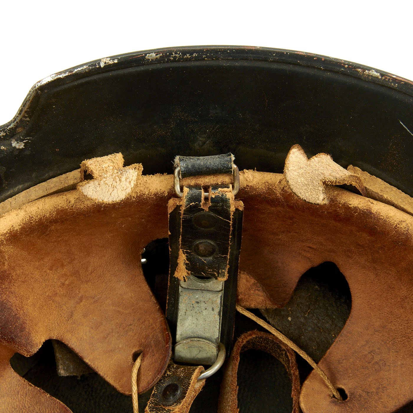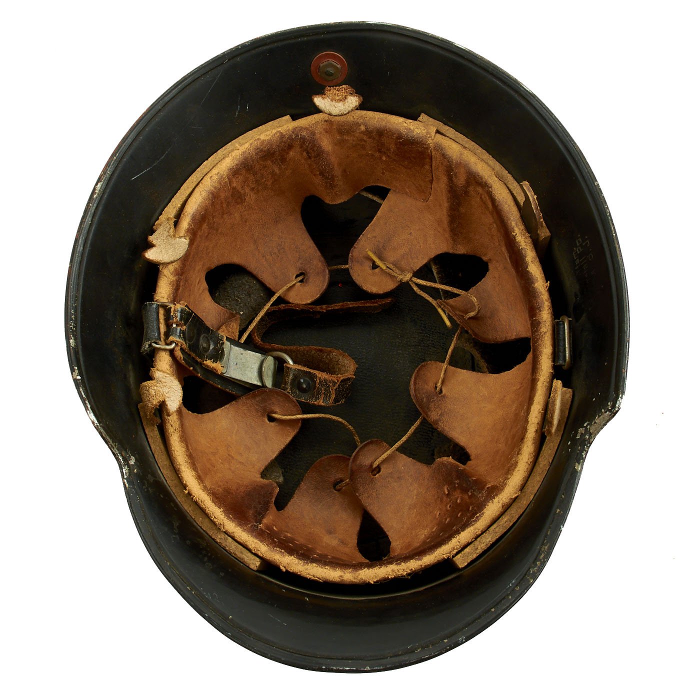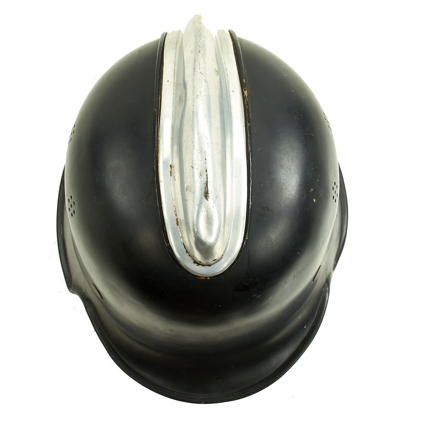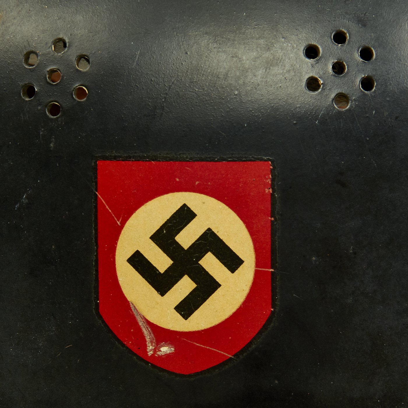 Original Item: Only One Available. This is a very rear all aluminum construction M34 "Square Dip" Third Reich helmet, outfitted for German WWII Fire Police (Feuerwehr) issue. Almost all of these that we have seen have a steel shell, however this shell aluminum, with an aluminum comb on top. Features genuine double decals of of a NSDAP Party Shield on the right, and NSDAP Civic Police Eagle on the left. Comes with a complete size 56 faintly marked leather liner with all split pins, though the foam rubber padding disintegrated long ago, typical for early types of rubber. The chin strap is partly missing, with probably about 3 inches from the right side missing. The remainder is in delicate condition. The liner still retains the five leather "tabs" that would allow attachment of the rear skirt.