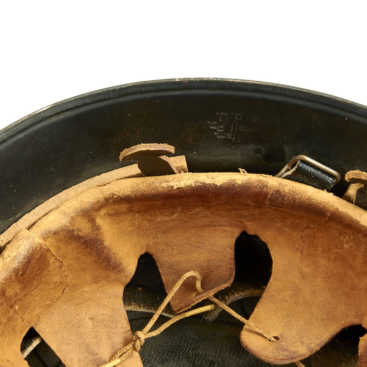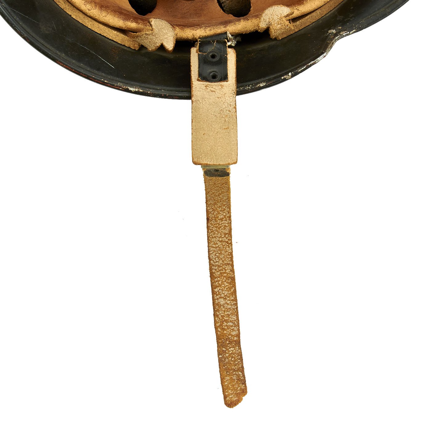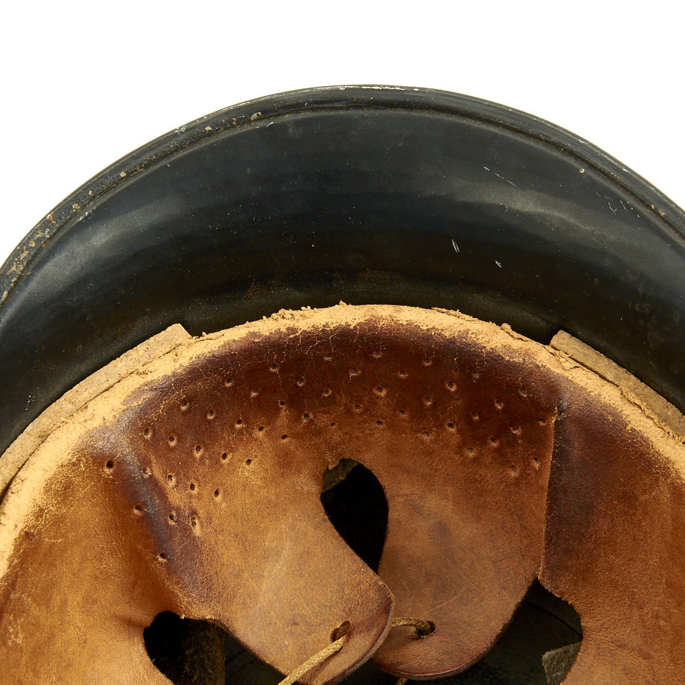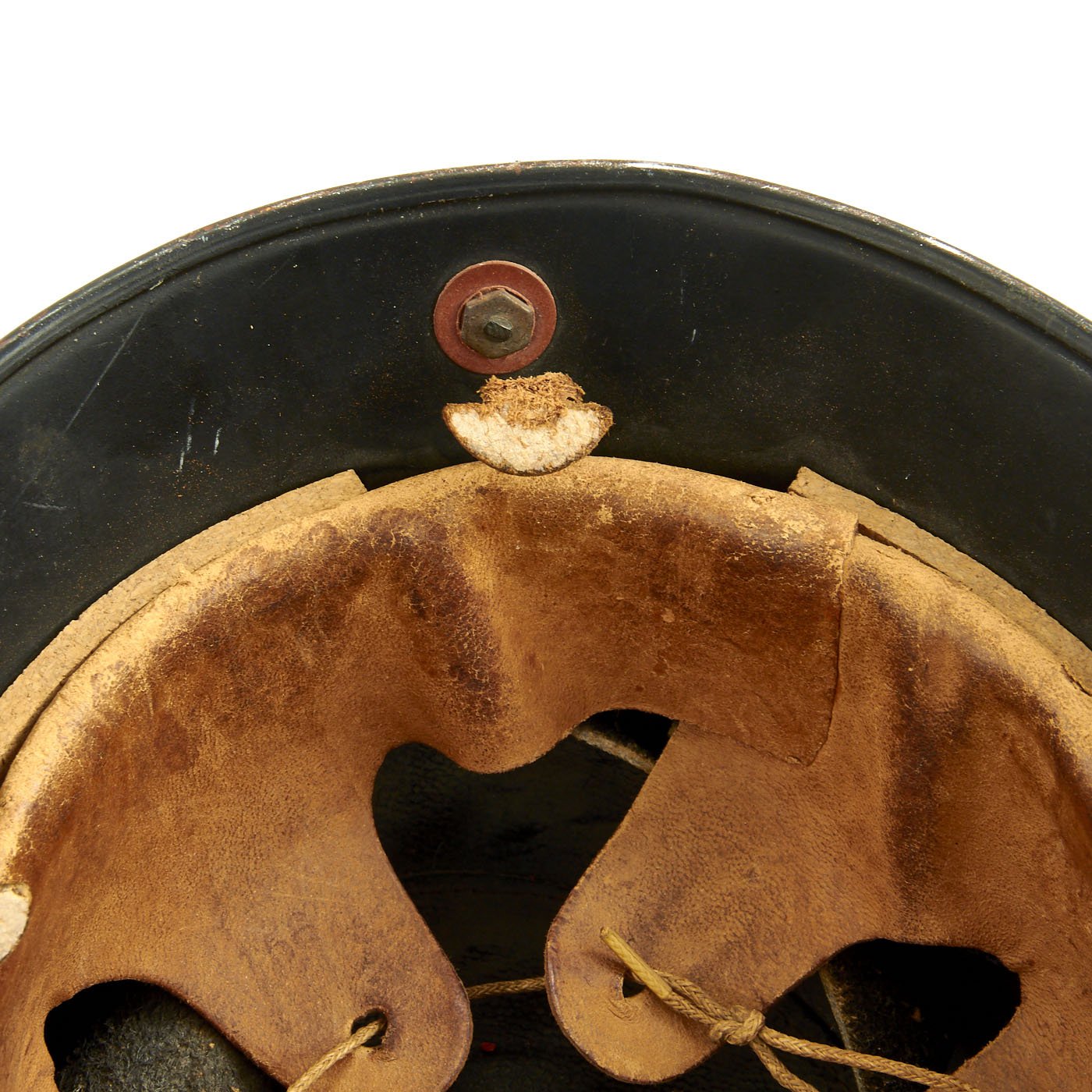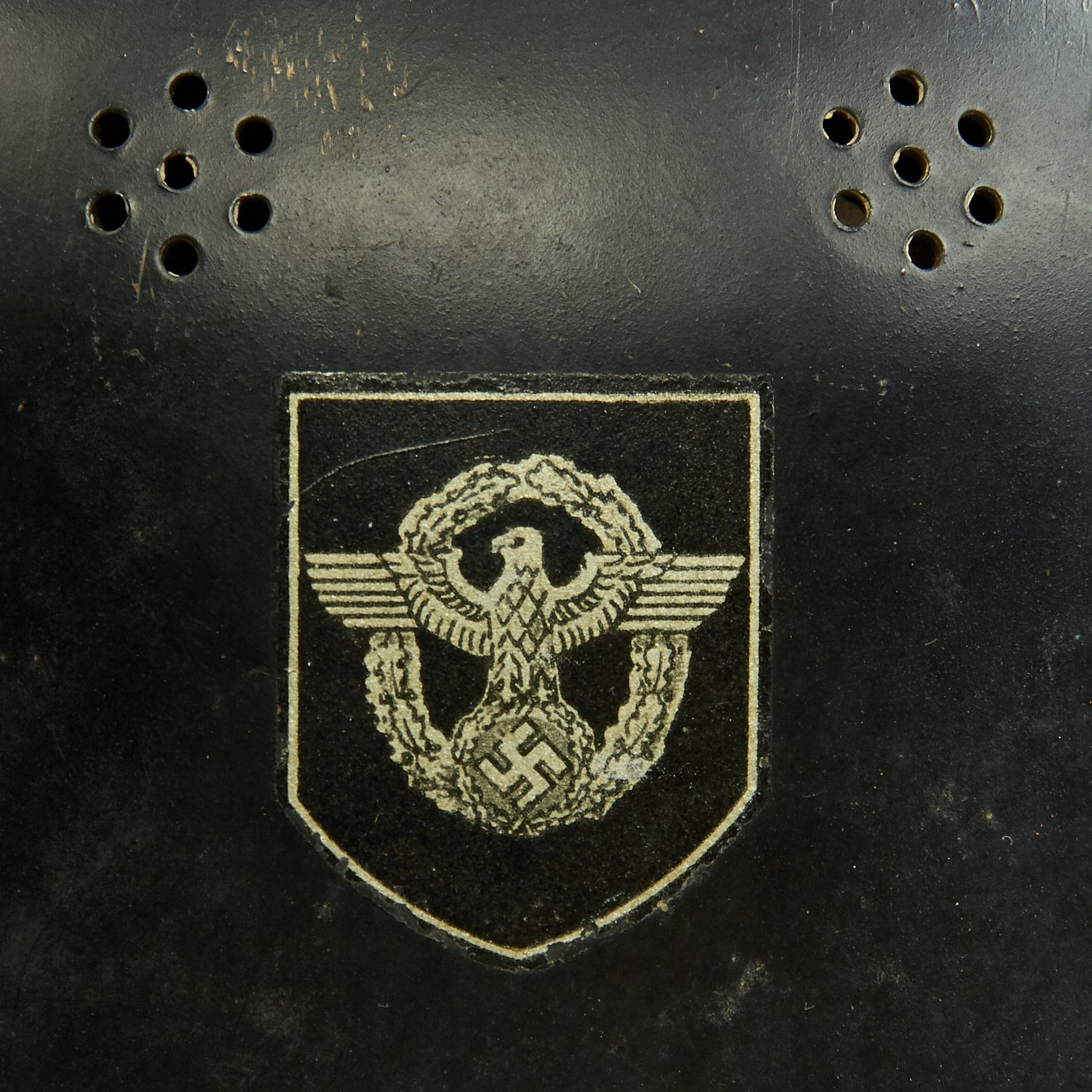 The exterior of this German helmet retains almost all of the original black paint, with some small chips and scratches, which show the aluminum material. The NSDAP Party Shield decal is about 95% complete, and the NSDAP Civic Police Eagle is just about 100%, with just a bit of deterioration. On the right side, the helmet bears a manufacturer stamp, which is stamped lightly on the upper left side: