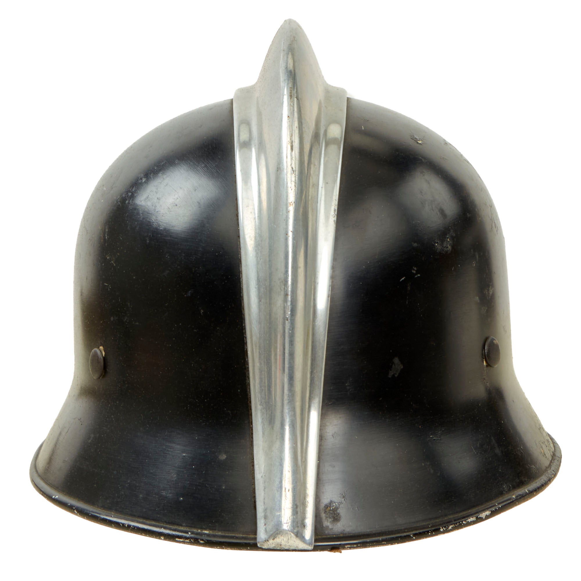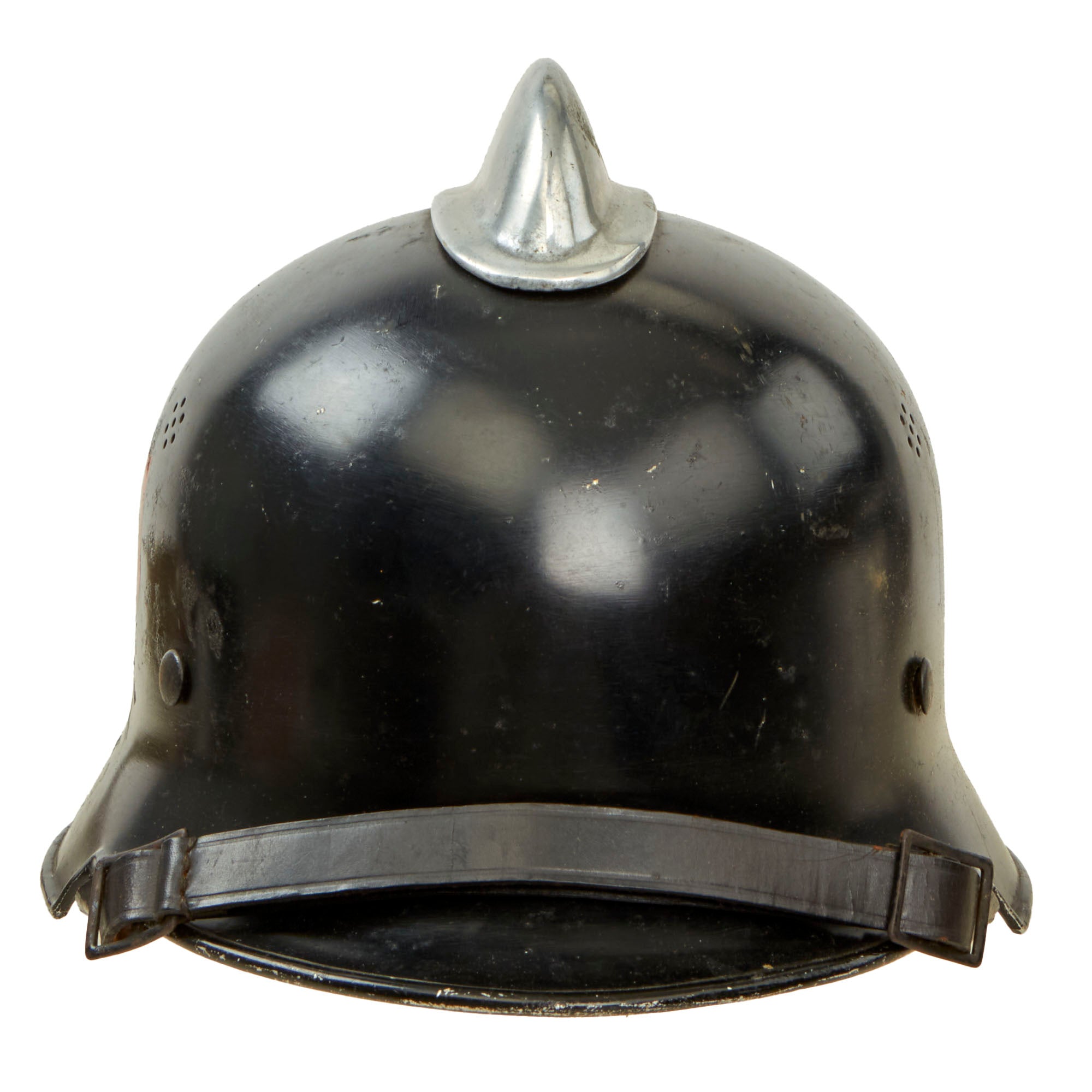 In 1929 a light-weight plastic fiber (Vulkanfiber) helmet was prototyped for general use by all fire-fighting units. The first models were issued in 1932 and proved unworthy of further consideration. As a result a second prototype was explored using light-weight steel alloy known as "Edelstahl." During this time leather fire-fighting helmets were slowly replaced with a combination of surplus World War I model steel helmets and privately manufactured versions in the “Austrian” pattern shell. These early helmets were generally painted black although some were left in their original field-gray World War I color.