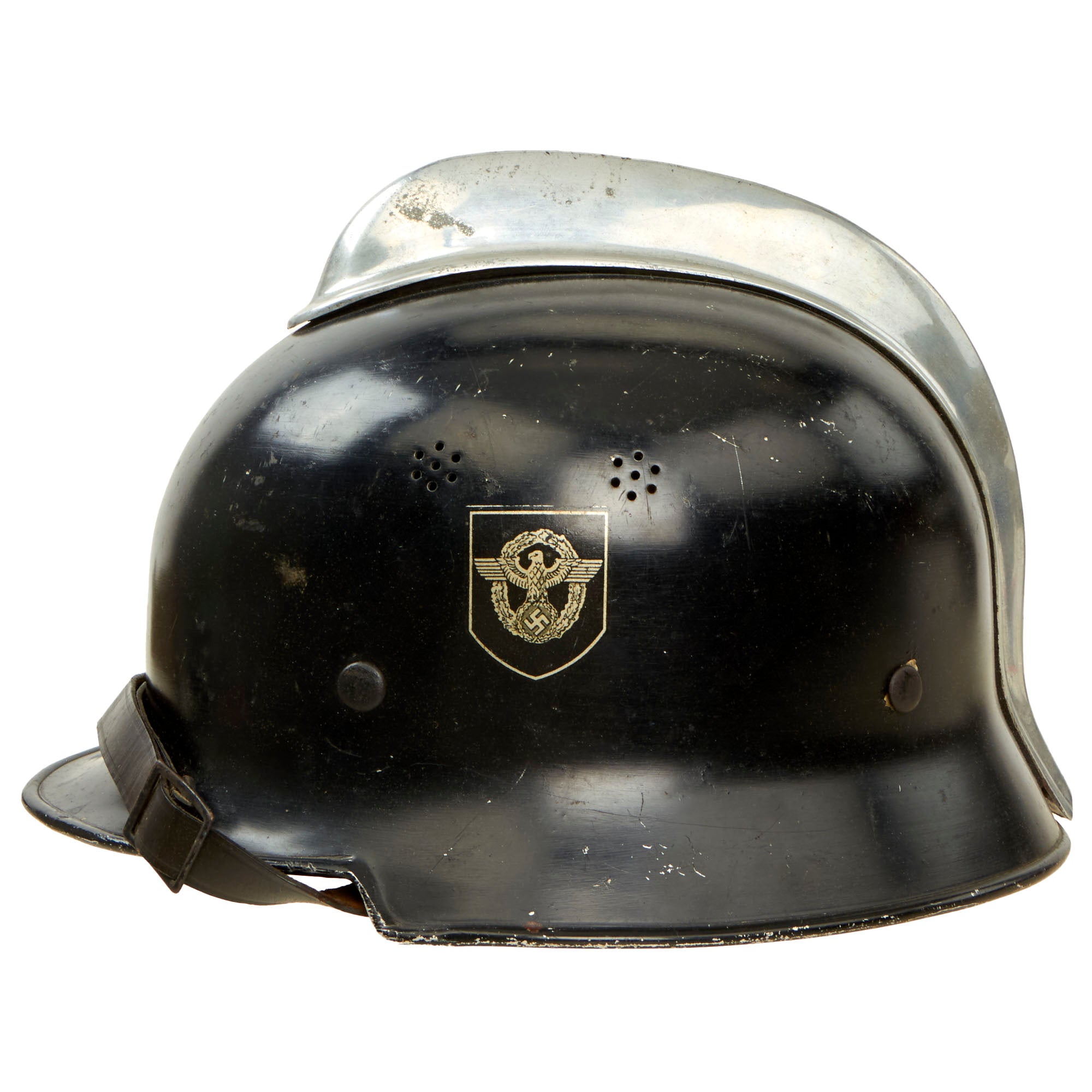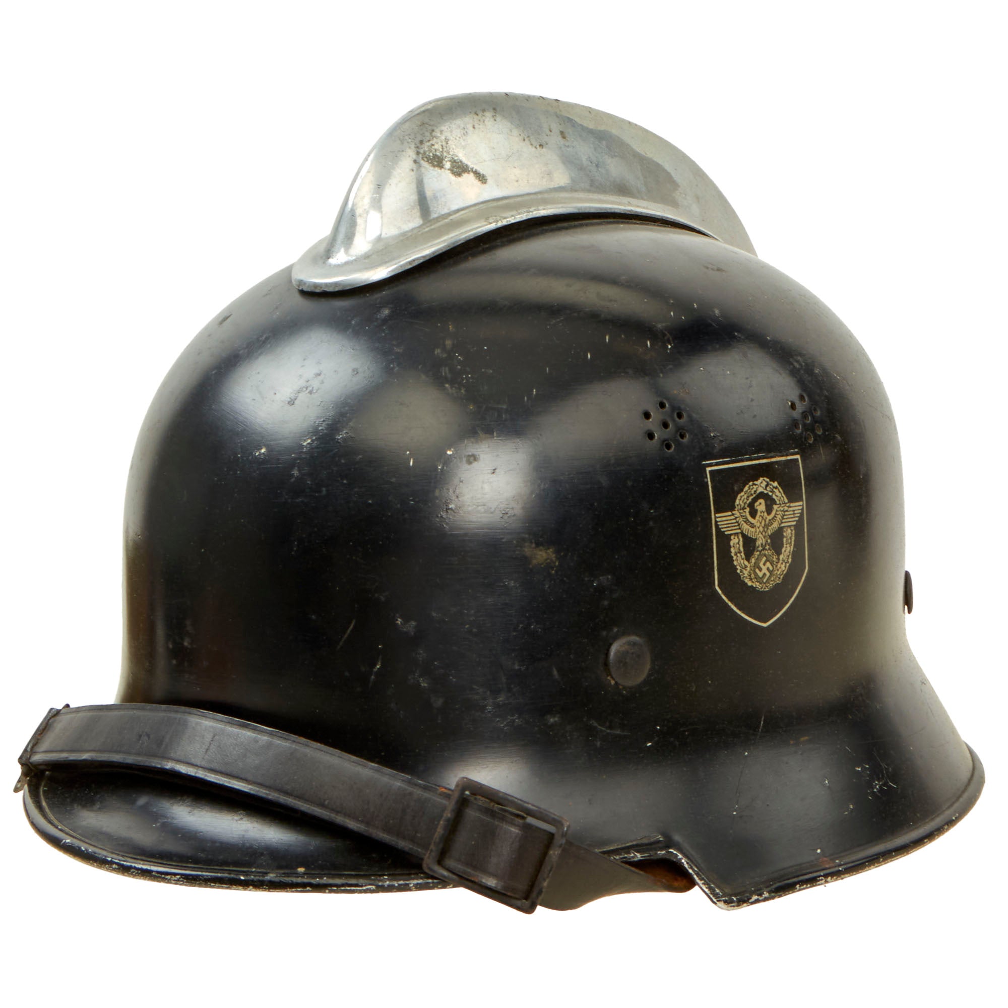 Original Item: Only One Available. This is a very nice rare all aluminum construction M34 "Square Dip" Third Reich helmet by BXF, outfitted for German WWII Fire police (Feuerwehr) issue. Almost all of these that we have seen have a steel shell, however this shell is aluminum, with a bright aluminum comb on top with padding underneath. Features genuine double decals of a NSDAP Party Shield on the right, and NSDAP Civic Police Eagle on the left. Comes with a leather liner with all four split pins present, though it is definitely worn and stained from service. The liner still retains all five of the leather "tabs" that would allow attachment of the rear skirt. The chinstrap is present, however it is degraded and shows cracking in the finish. It also looks to have been torn where it attaches to the liner, where it is now glued in place. Size seems to be about a 56cm.