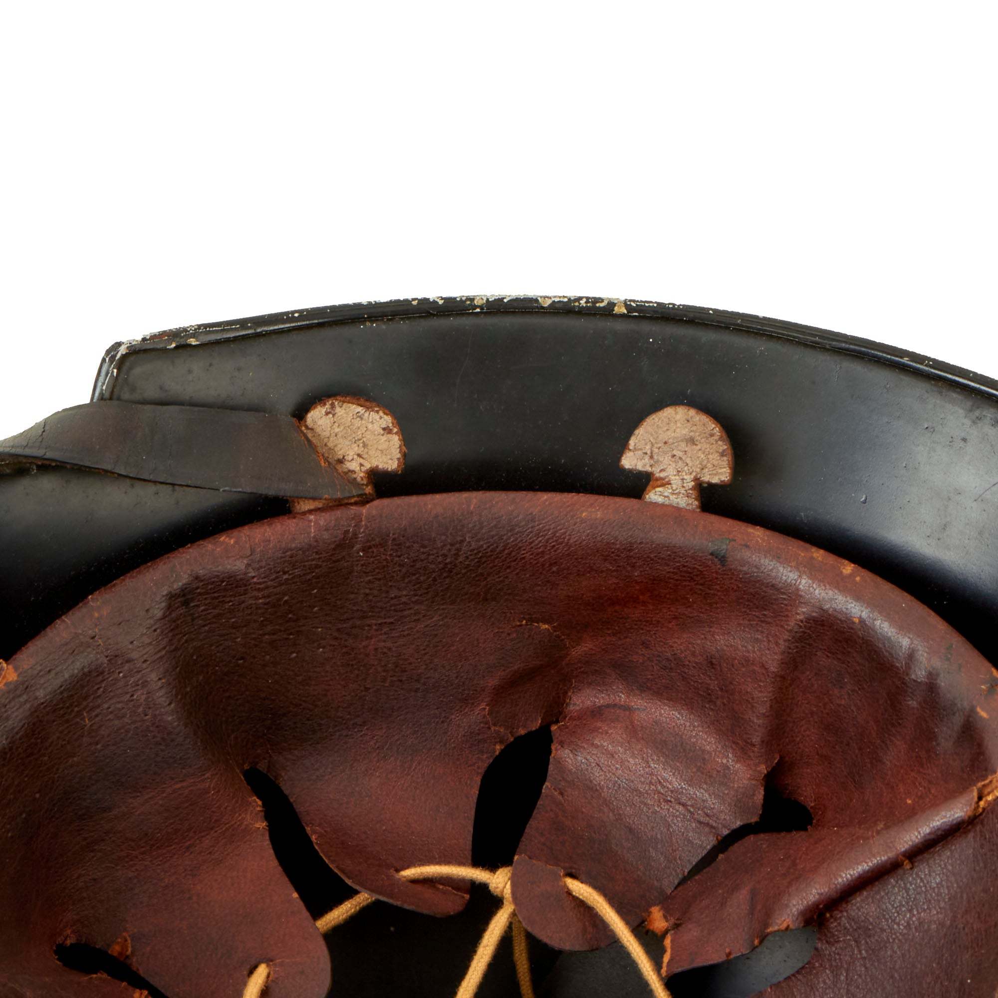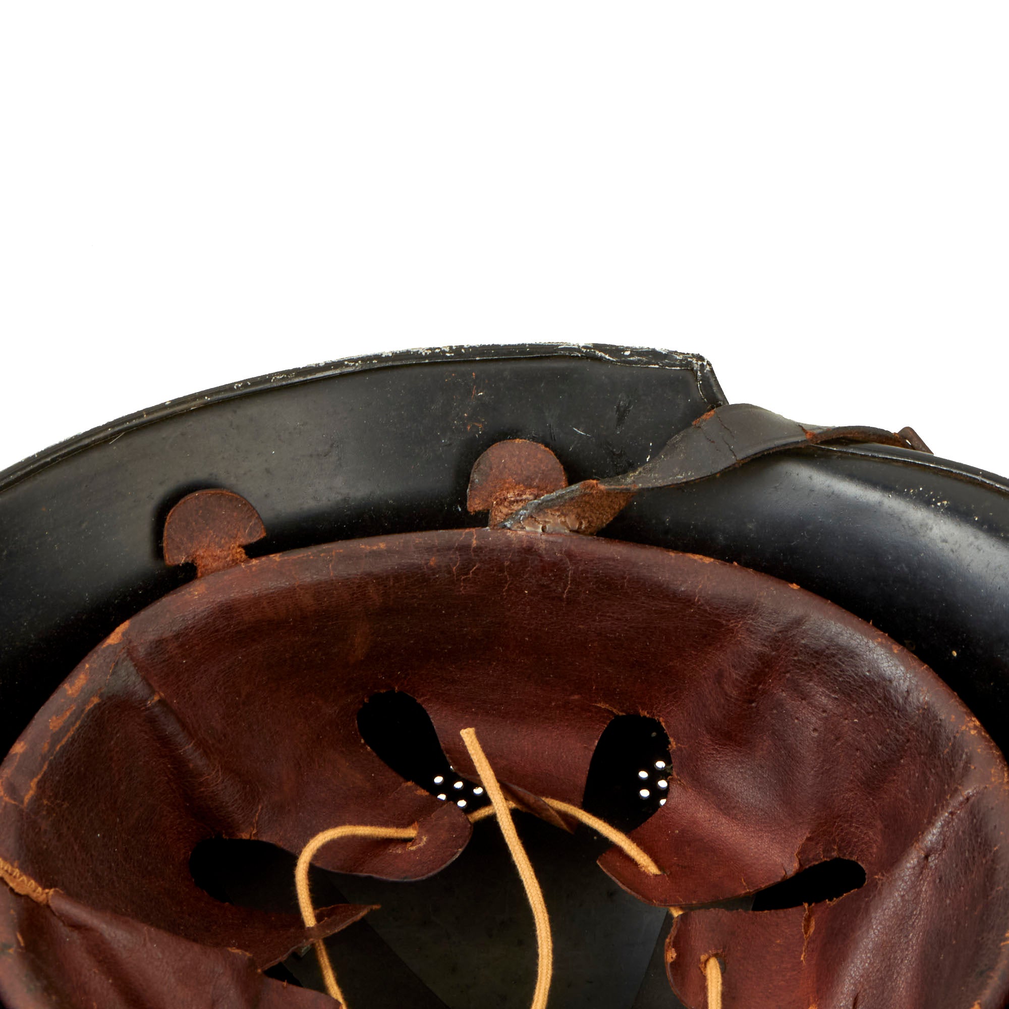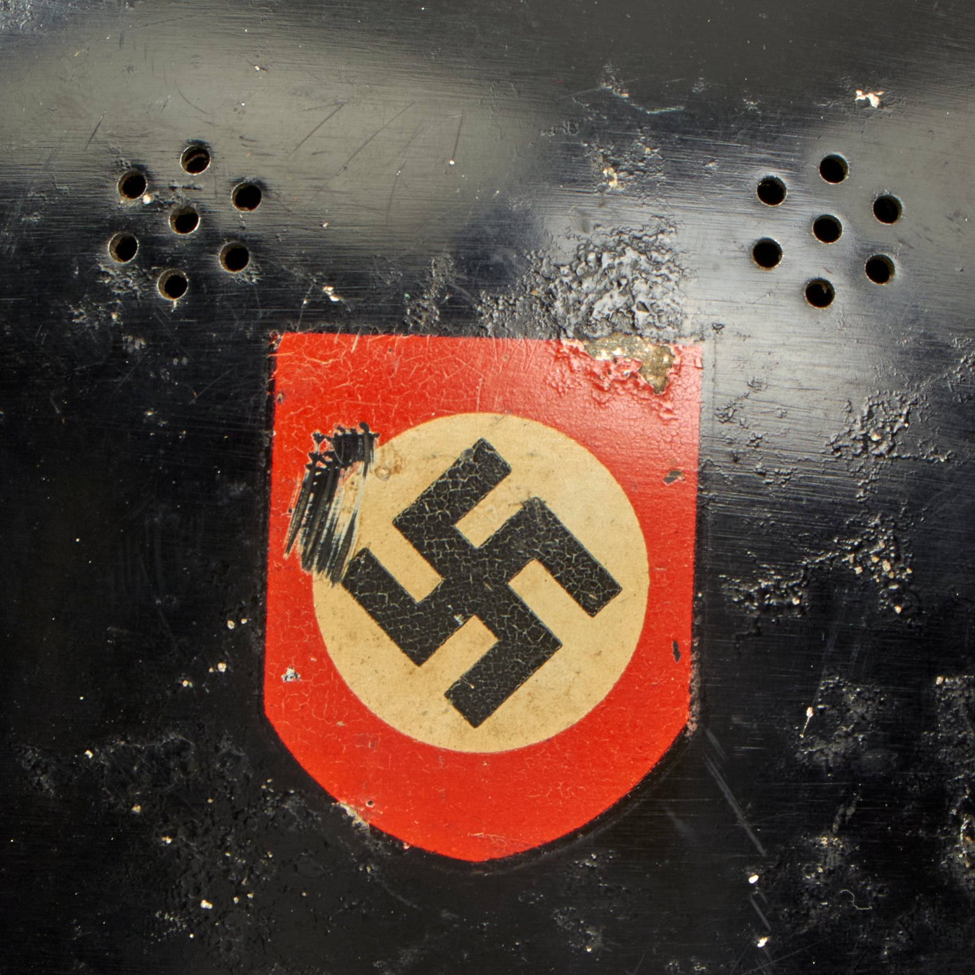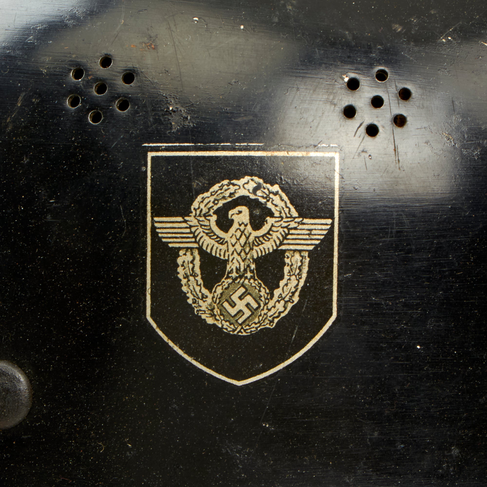 The exterior of this German helmet retains almost all of the original black paint, with some small chips and scratches, which show the aluminum material. These are particularly evident around the bottom rim of the helmet. The aluminum comb is unfinished and still mostly bright, with just a bit of oxidation present. The NSDAP Party Shield decal is about 90% complete with some small chips and a scuff, while the NSDAP Civic Police Eagle is close to 100%. Both have some nice yellowing due to age.