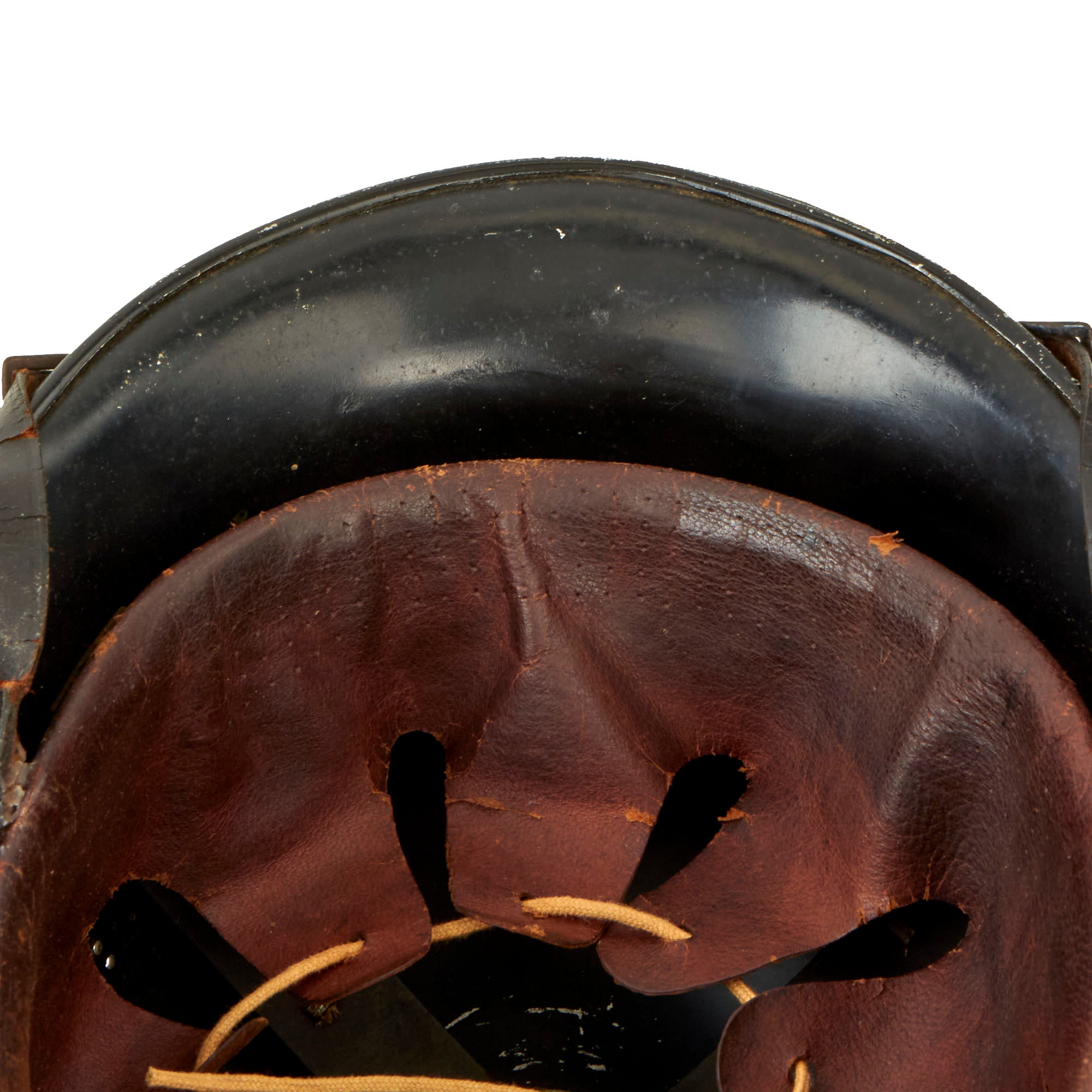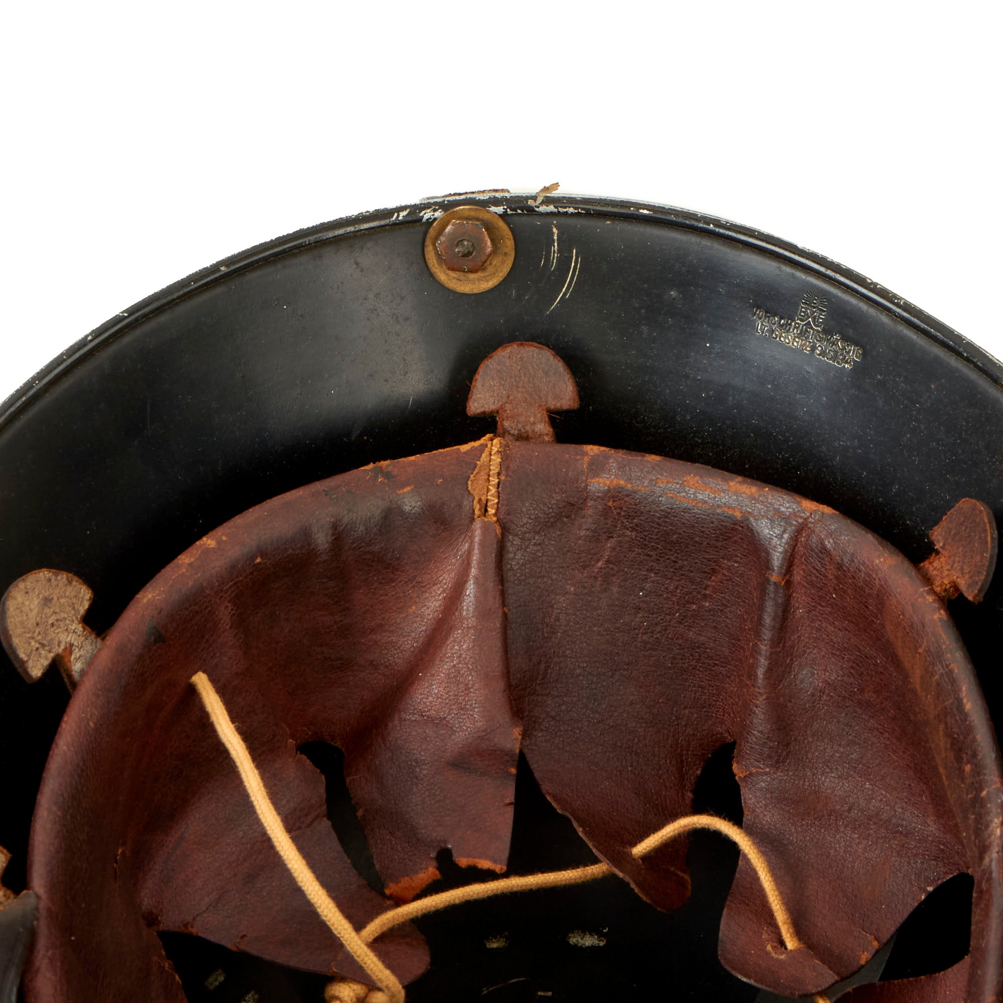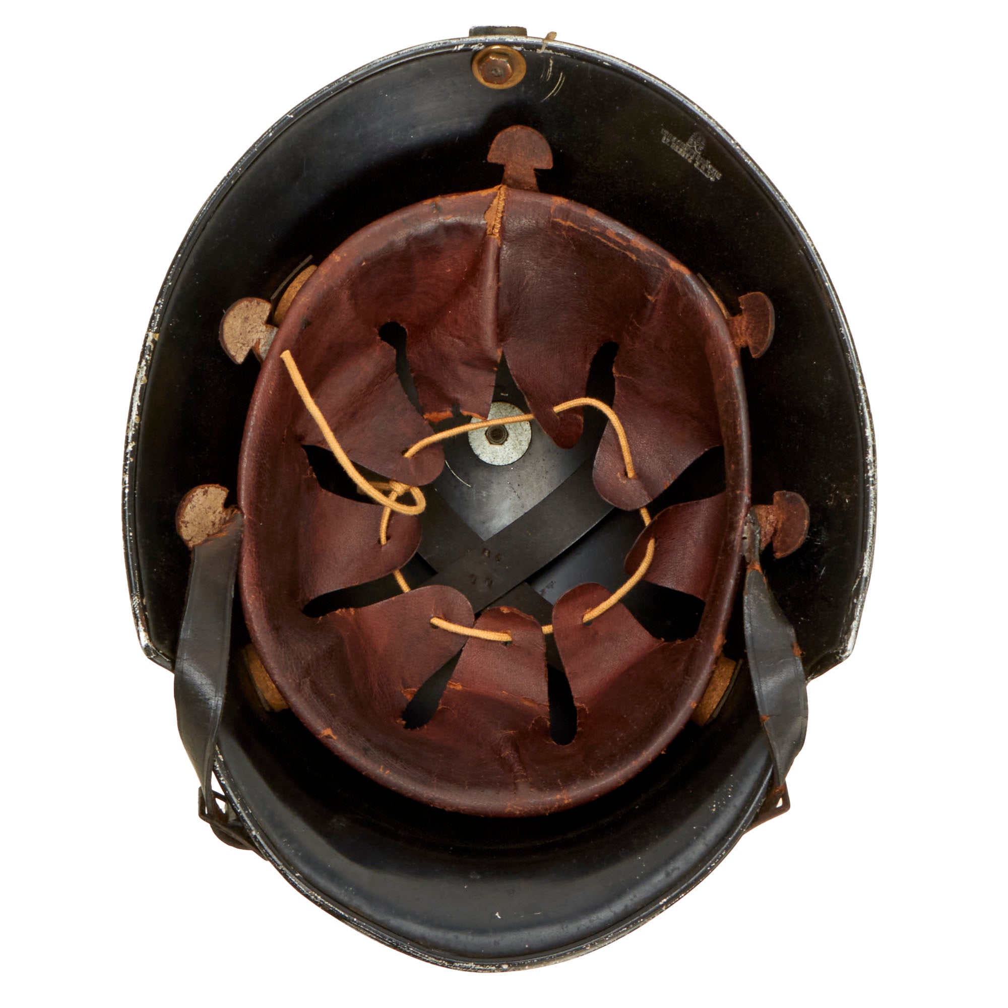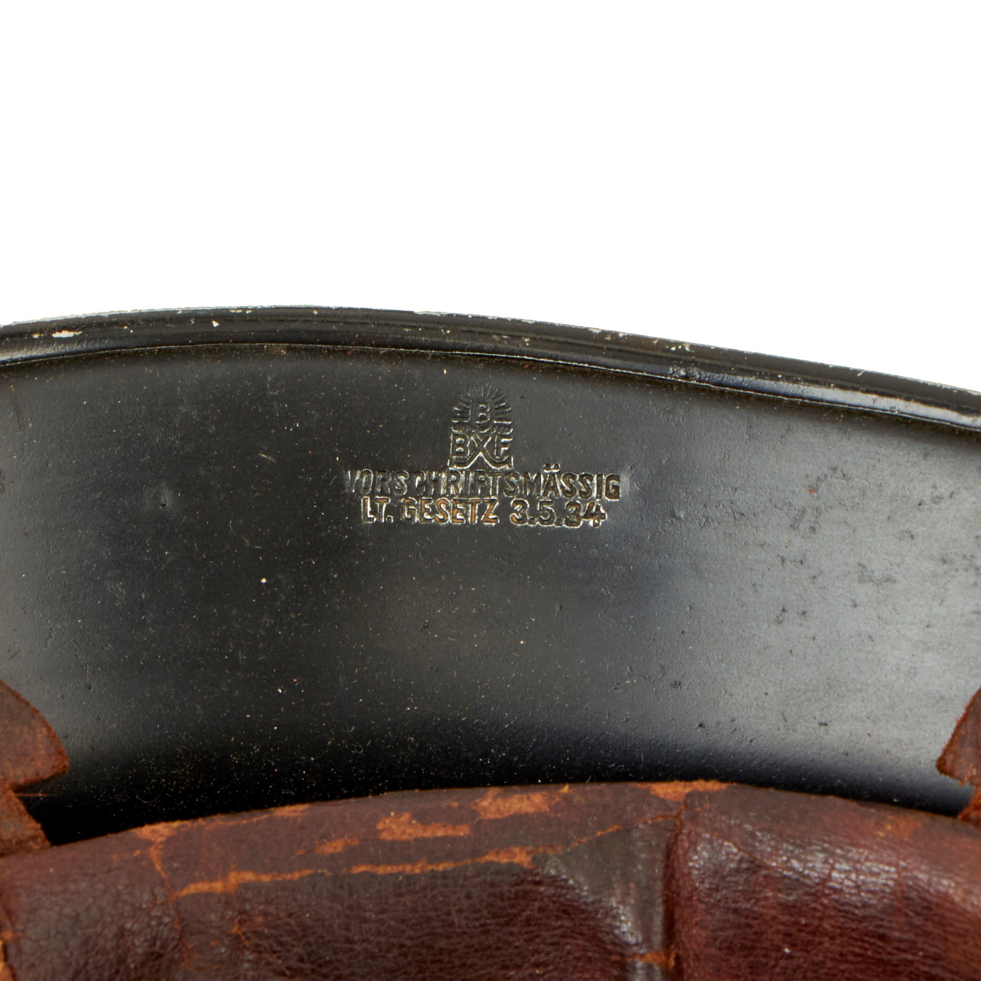 This means that maker BXF has made this helmet per the regulations set forth in the law passed 3.5.34. It is this marking that gave this style the nickname M-34. The top mounted aluminum comb is in great shape, with just a few small dents and scratches in the black painted finish.