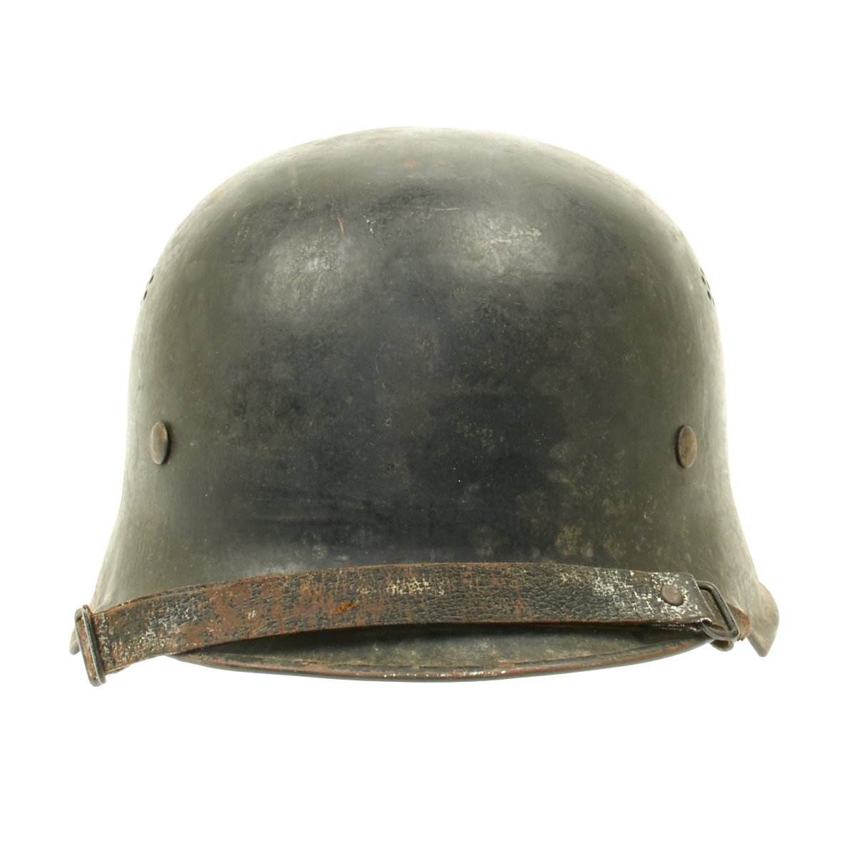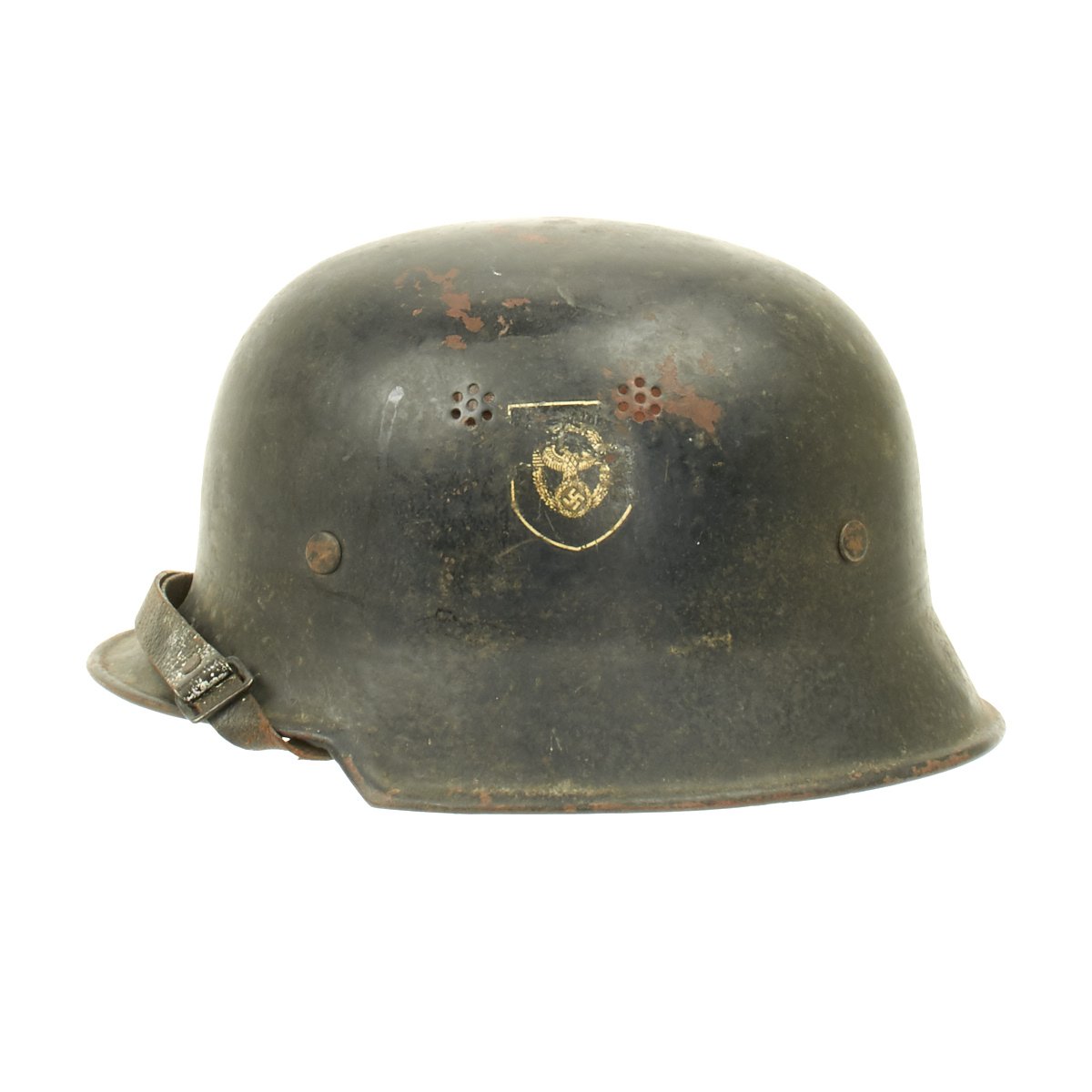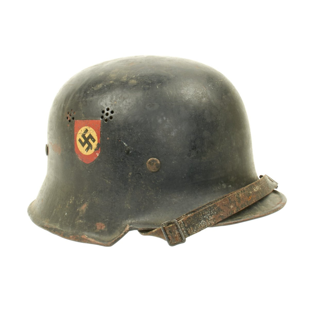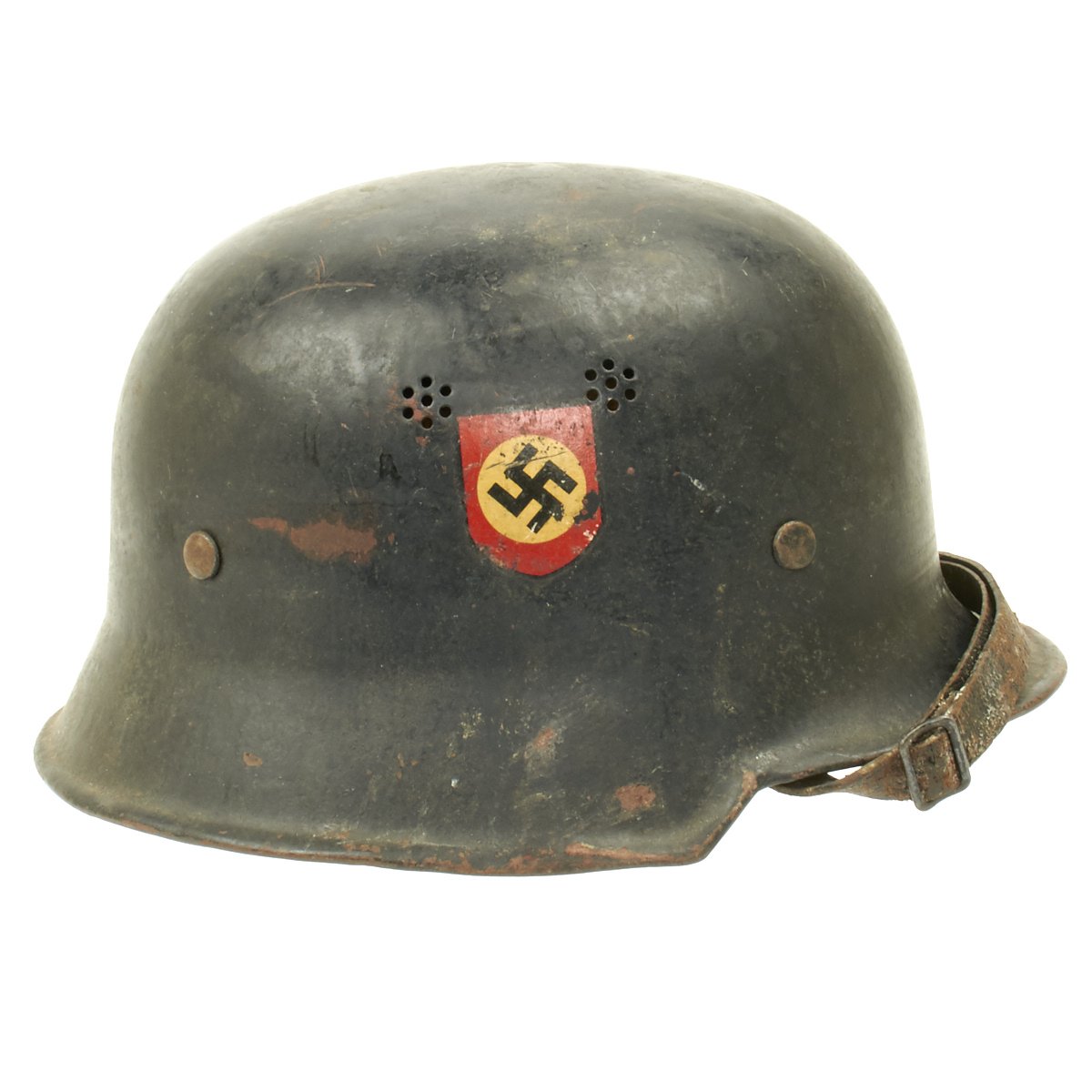 Original Item: Only One Available. Genuine steel construction M34 "Square Dip" Third Reich helmet. German WW2 civic police issue. Features genuine double decals of civic eagle and NSDAP swas. Comes with complete leather liner and cork washers still intact and tight with all split pins. The leather chin strap is still intact, though it is worn and missing significant amounts of finish, and shows some cracking.