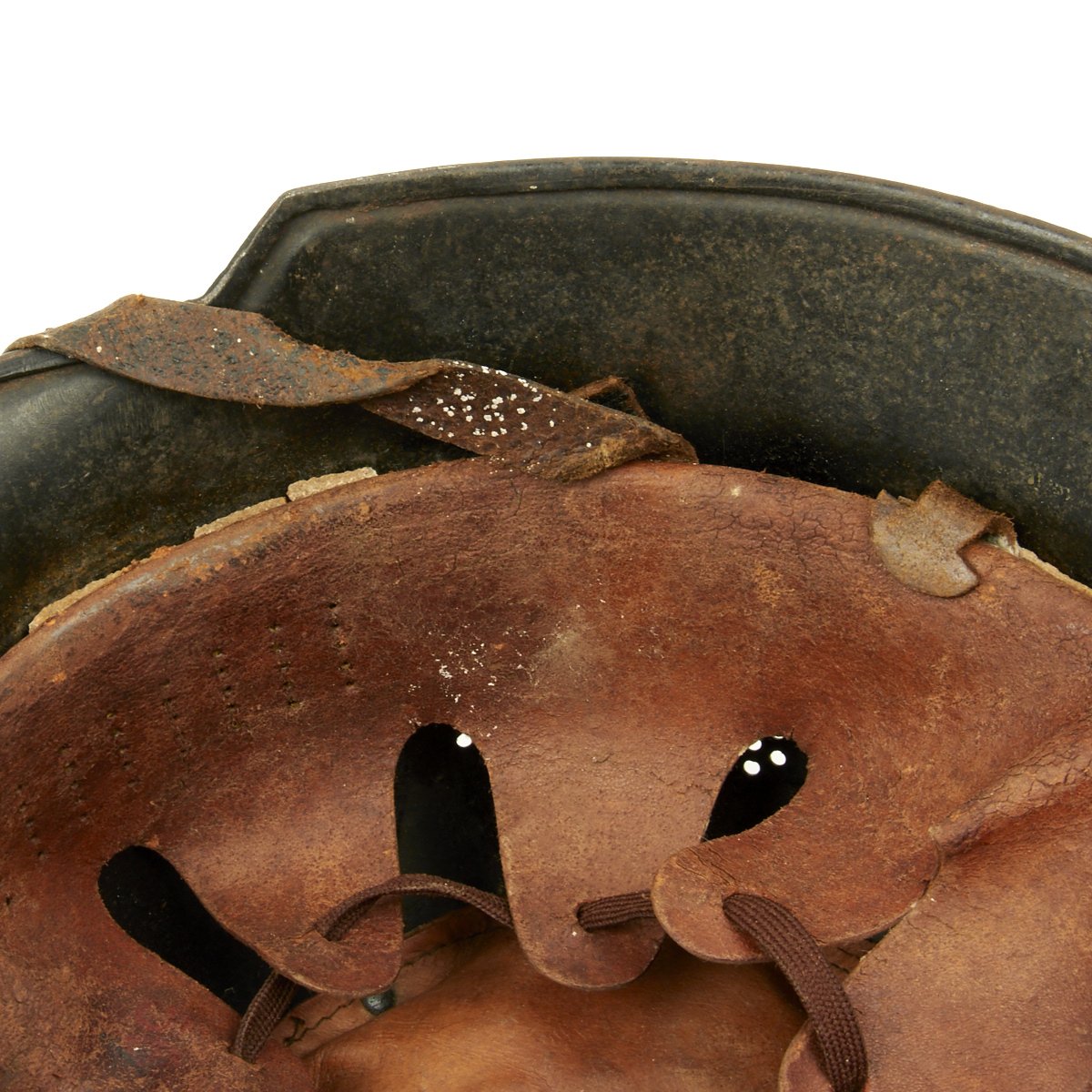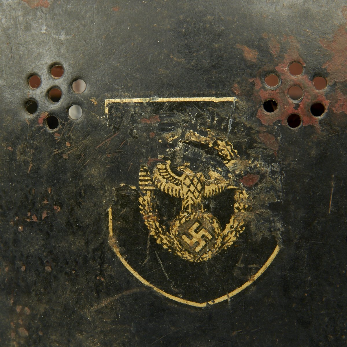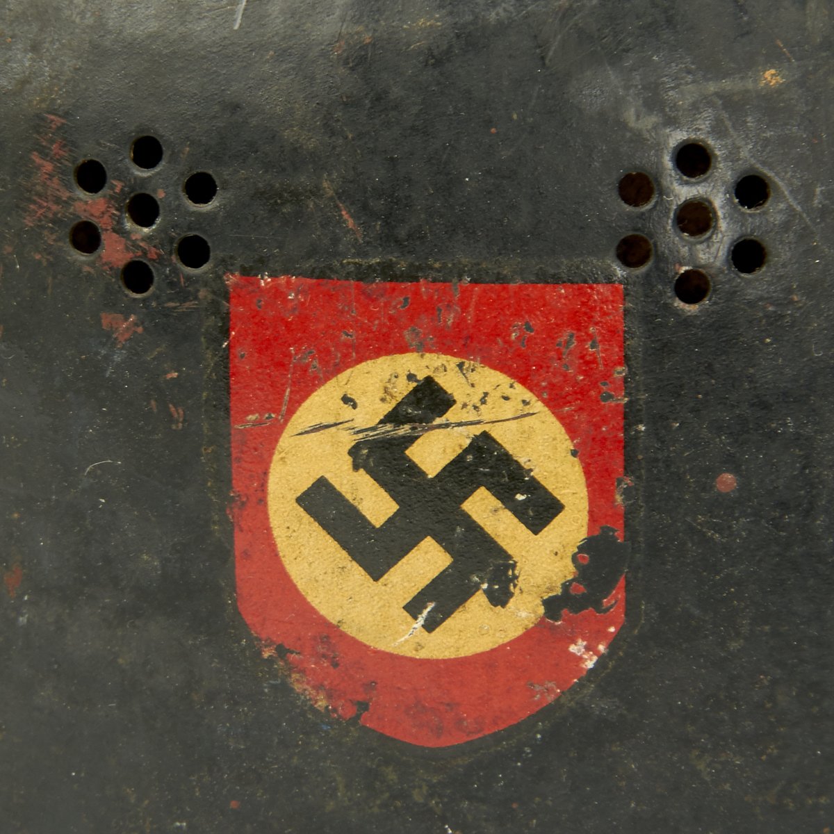 Original Item: Only One Available. Genuine steel construction M34 "Square Dip" Third Reich helmet. German WW2 civic police issue. Features genuine double decals of civic eagle and NSDAP swas. Comes with complete leather liner and cork washers still intact and tight with all split pins. The leather chin strap is still intact, though it is worn and missing significant amounts of finish, and shows some cracking.