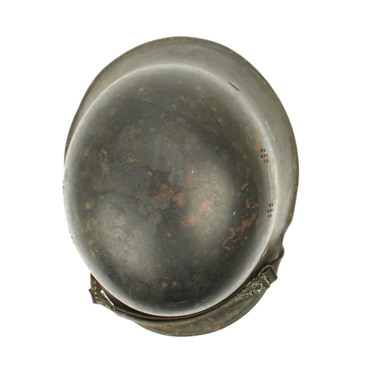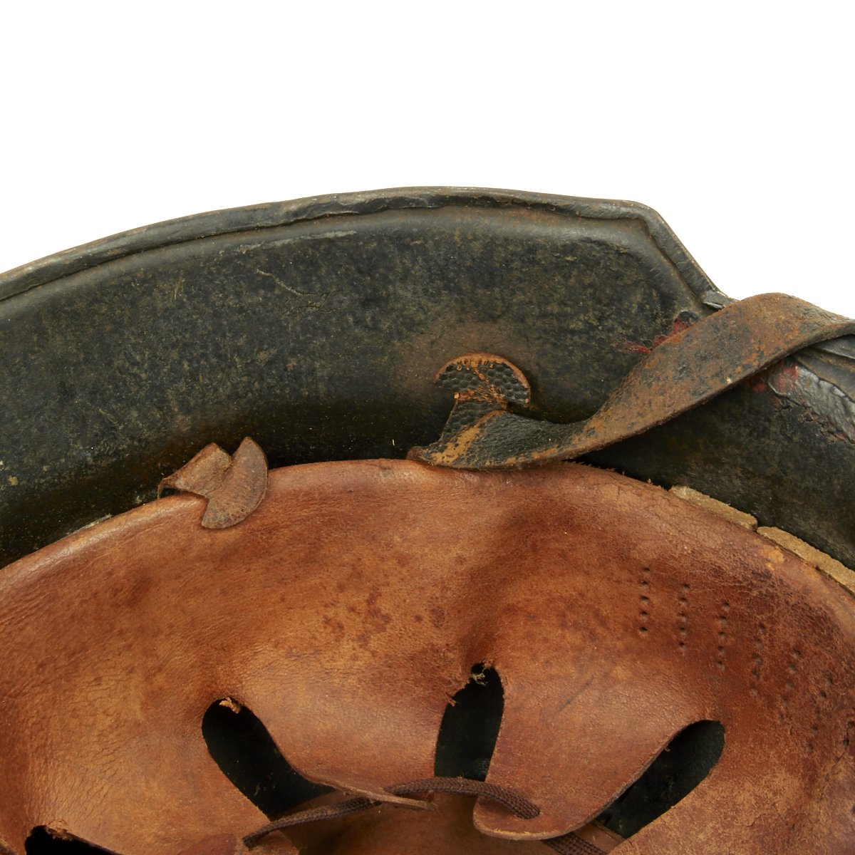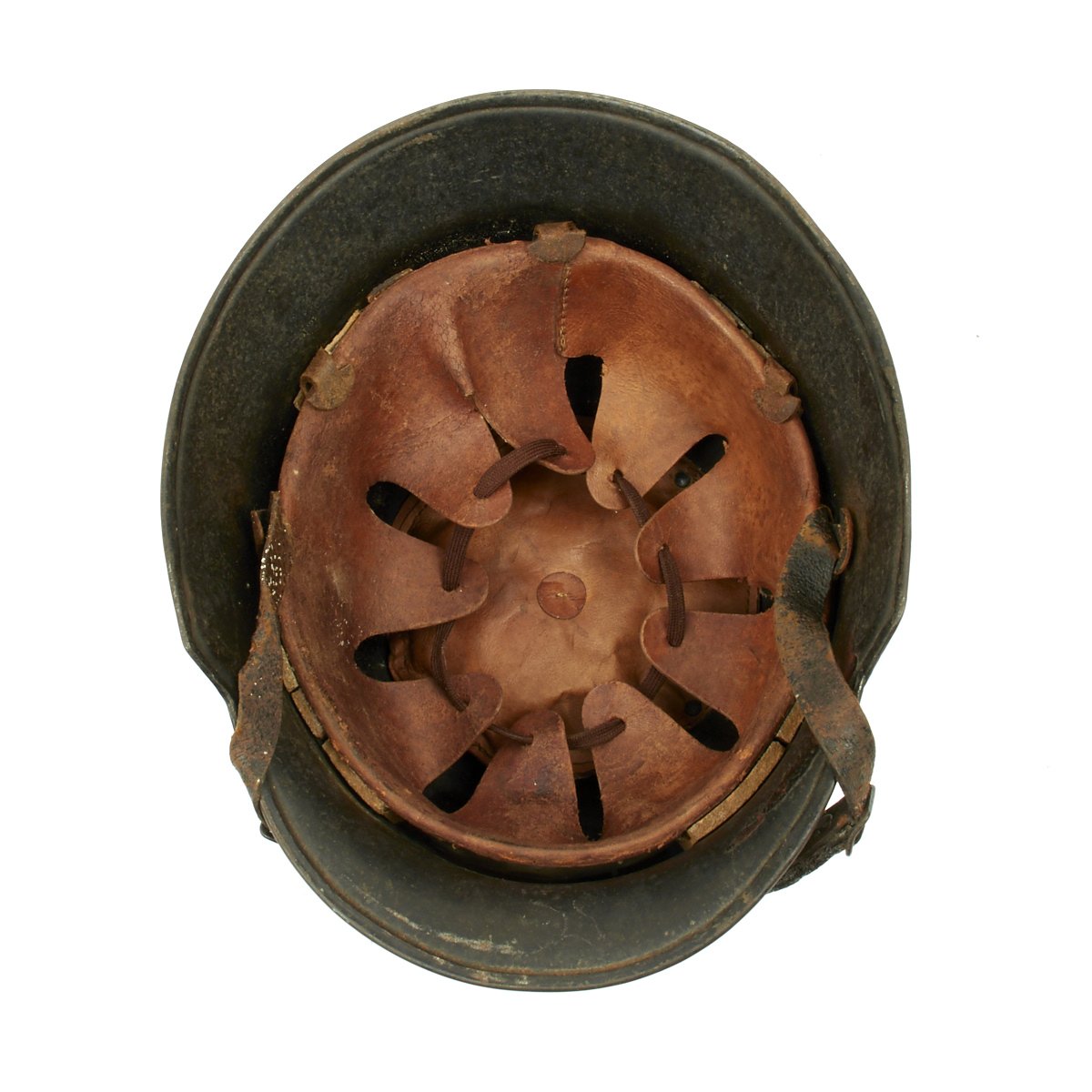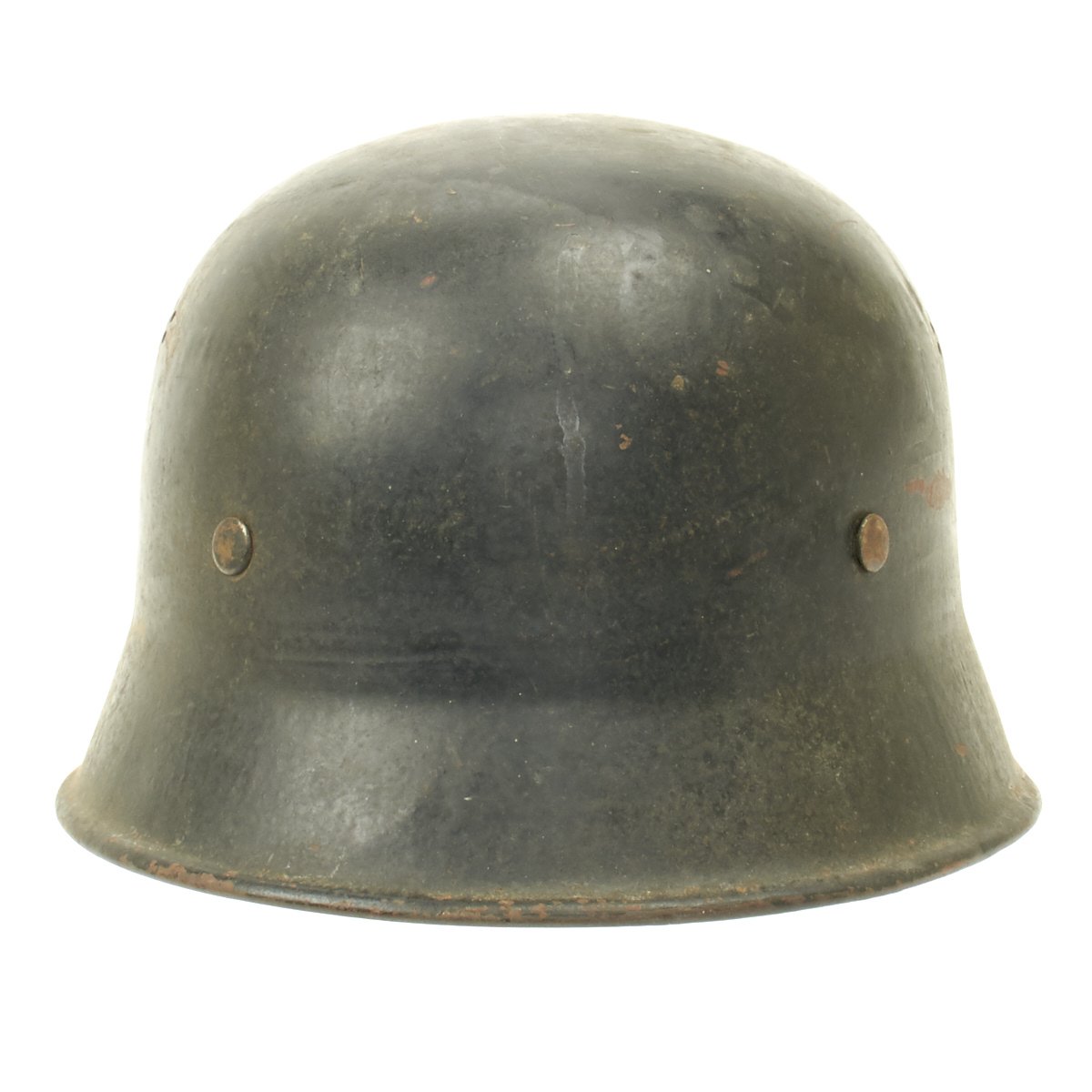Original Item: Only One Available. Genuine steel construction M34 "Square Dip" Third Reich helmet. German WW2 civic police issue. Features genuine double decals of civic eagle and NSDAP swas. Comes with complete leather liner and cork washers still intact and tight with all split pins. The leather chin strap is still intact, though it is worn and missing significant amounts of finish, and shows some cracking.