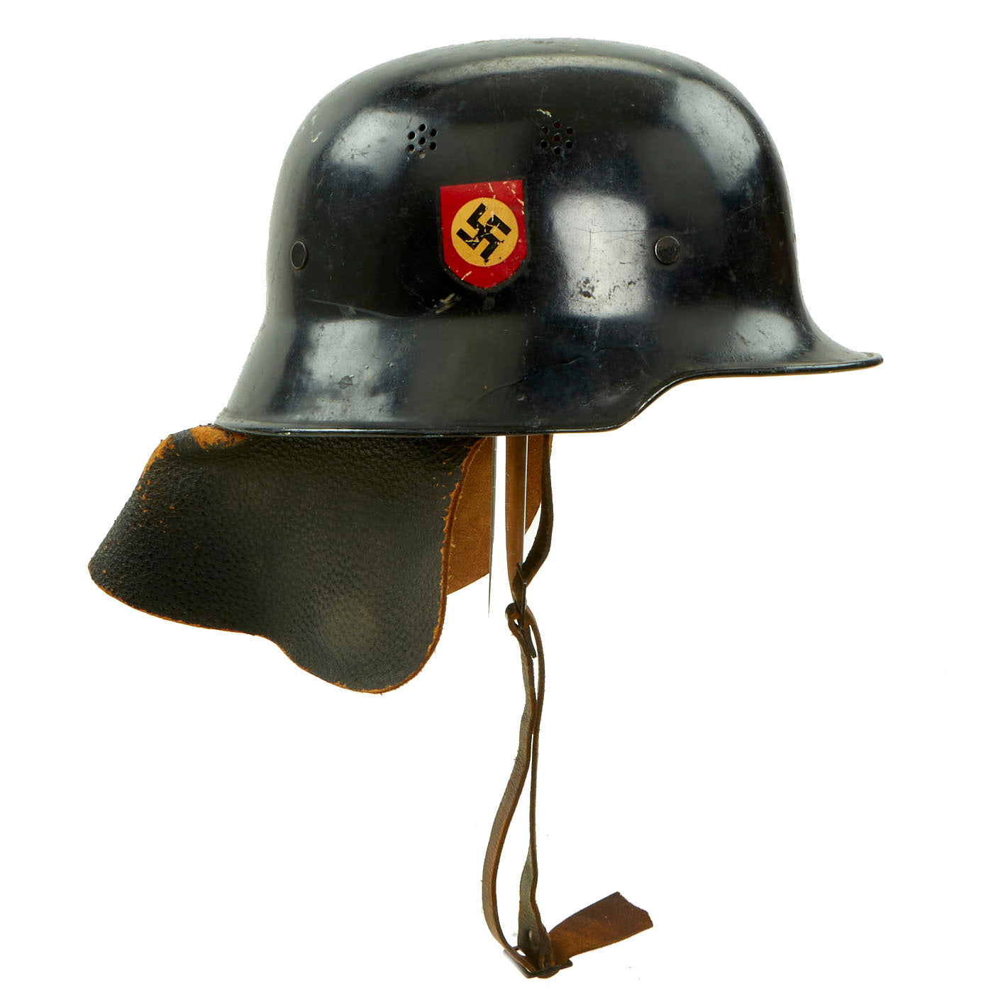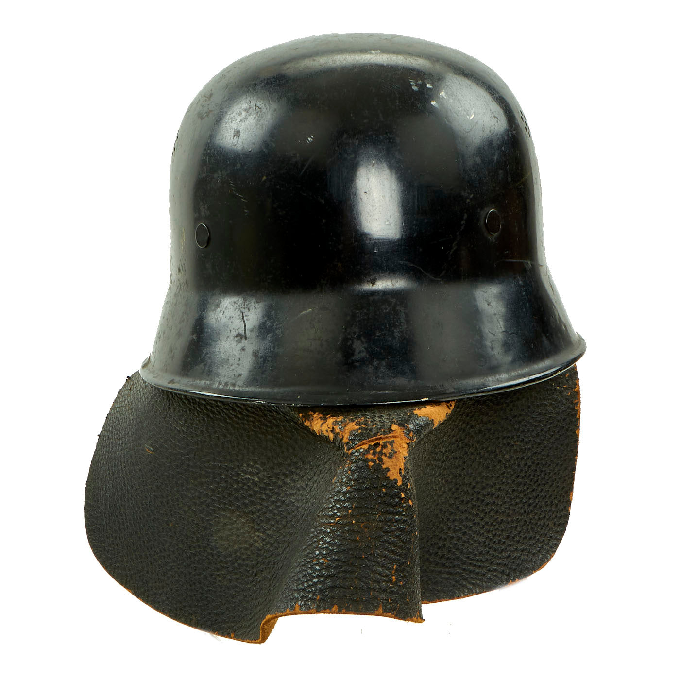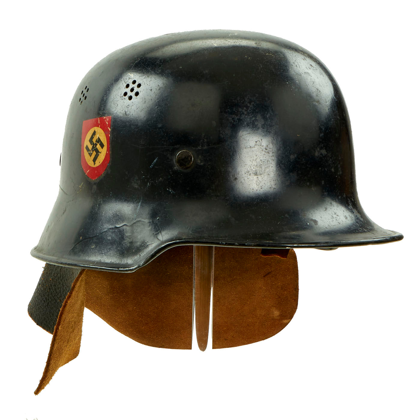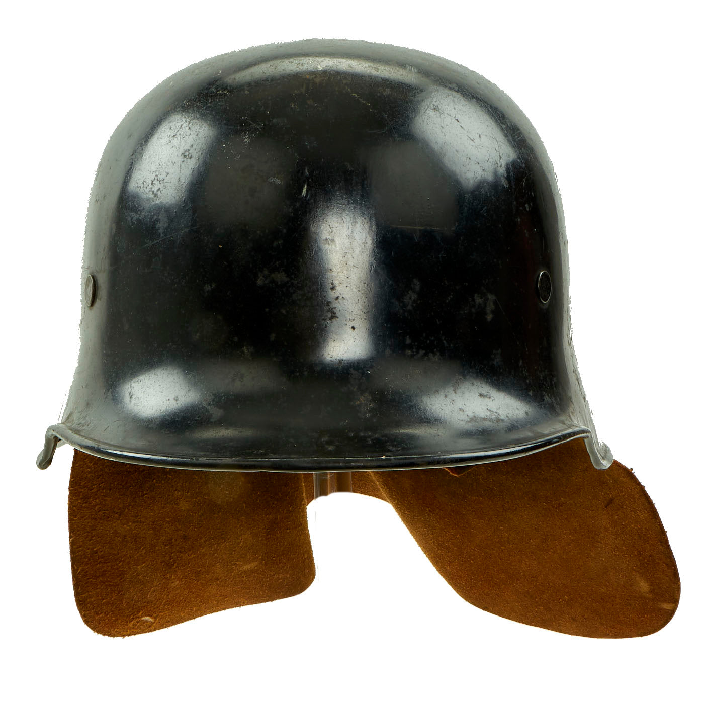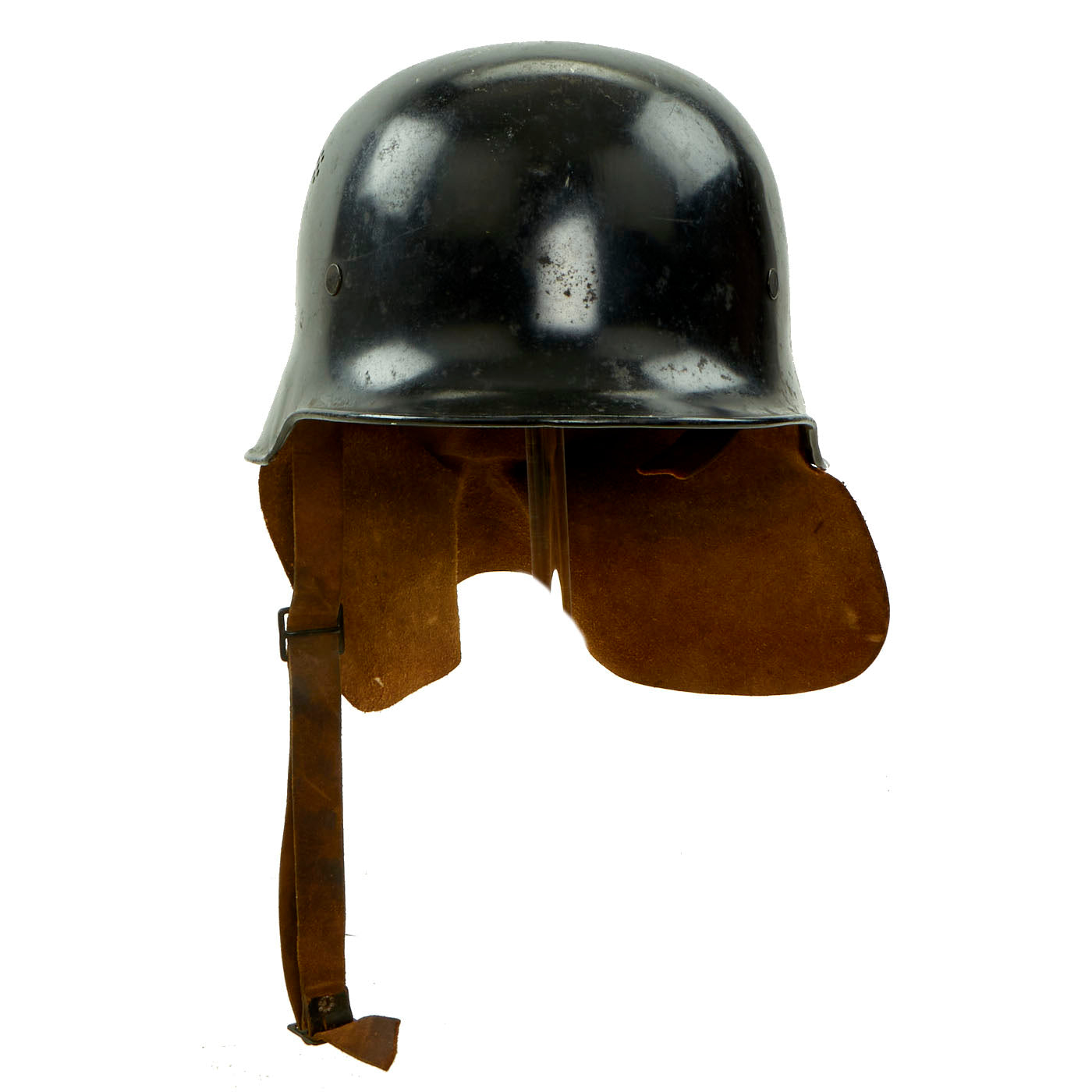 Original Item: Only One Available. This is an incredible example of an M34 "Square Dip" Third Reich helmet, outfitted for German WWII Fire Department (Feuerwehr) issue. During WWII the official name of this group was the Feuerschutzpolizei (Fire Protection Police), and they were handled as part of the police. This helmet has the standard steel shell, and is in very good condition. It does not look to have ever had an aluminum comb, which were not fitted to all fire police helmets. However, it does have the rare rear leather neck protector, which is something we have only had once before!