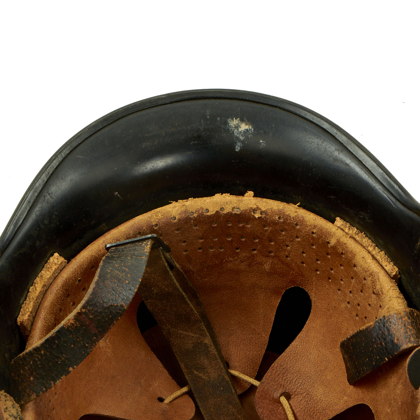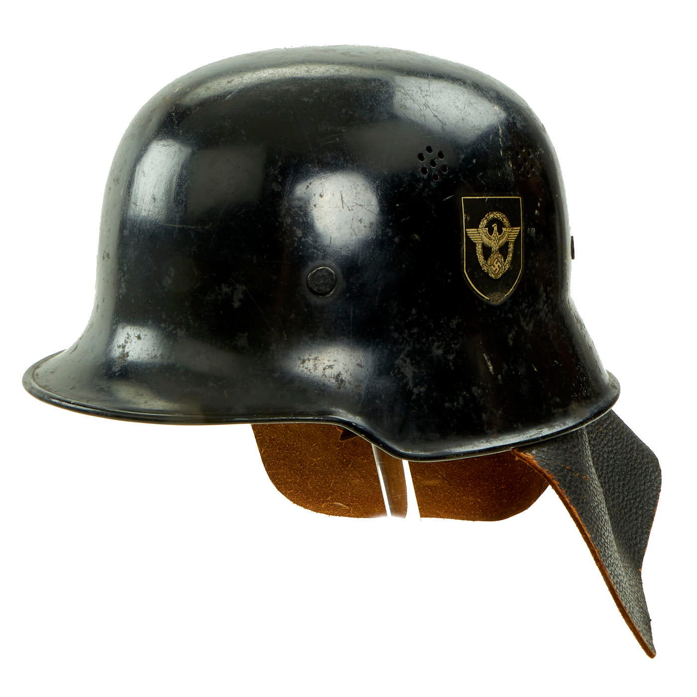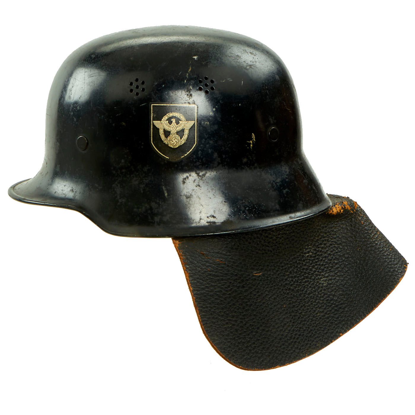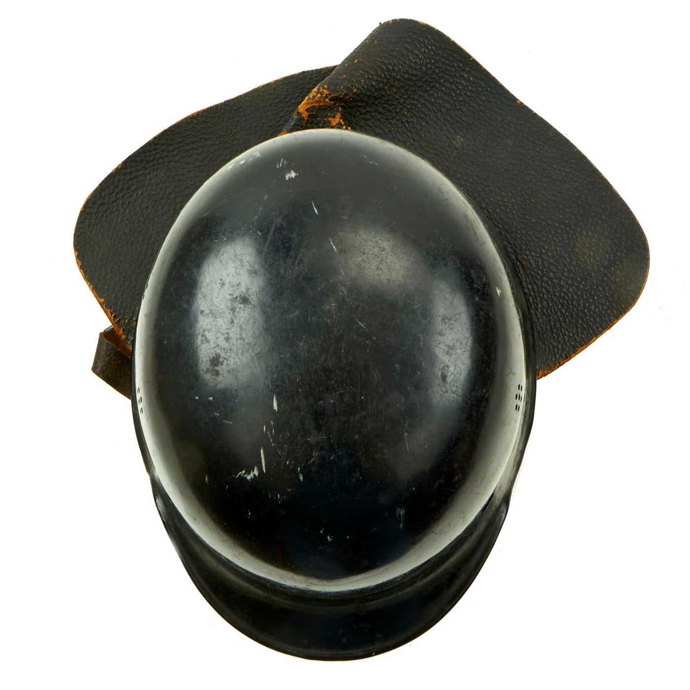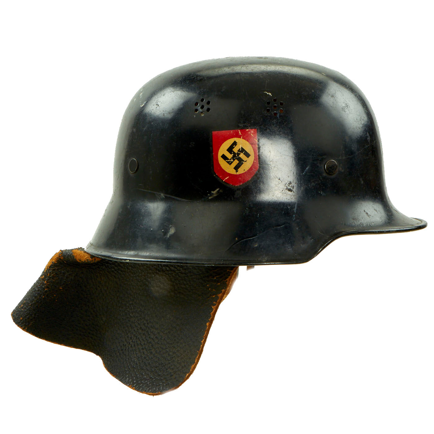 Original Item: Only One Available. This is an incredible example of an M34 "Square Dip" Third Reich helmet, outfitted for German WWII Fire Department (Feuerwehr) issue. During WWII the official name of this group was the Feuerschutzpolizei (Fire Protection Police), and they were handled as part of the police. This helmet has the standard steel shell, and is in very good condition. It does not look to have ever had an aluminum comb, which were not fitted to all fire police helmets. However, it does have the rare rear leather neck protector, which is something we have only had once before!