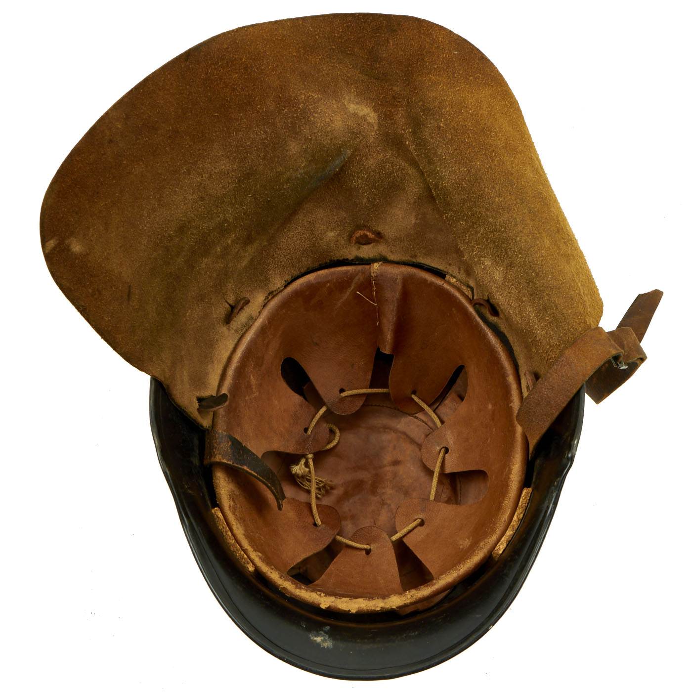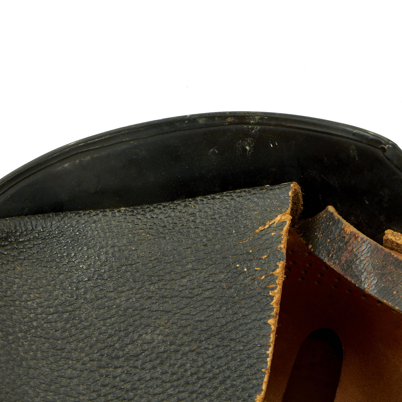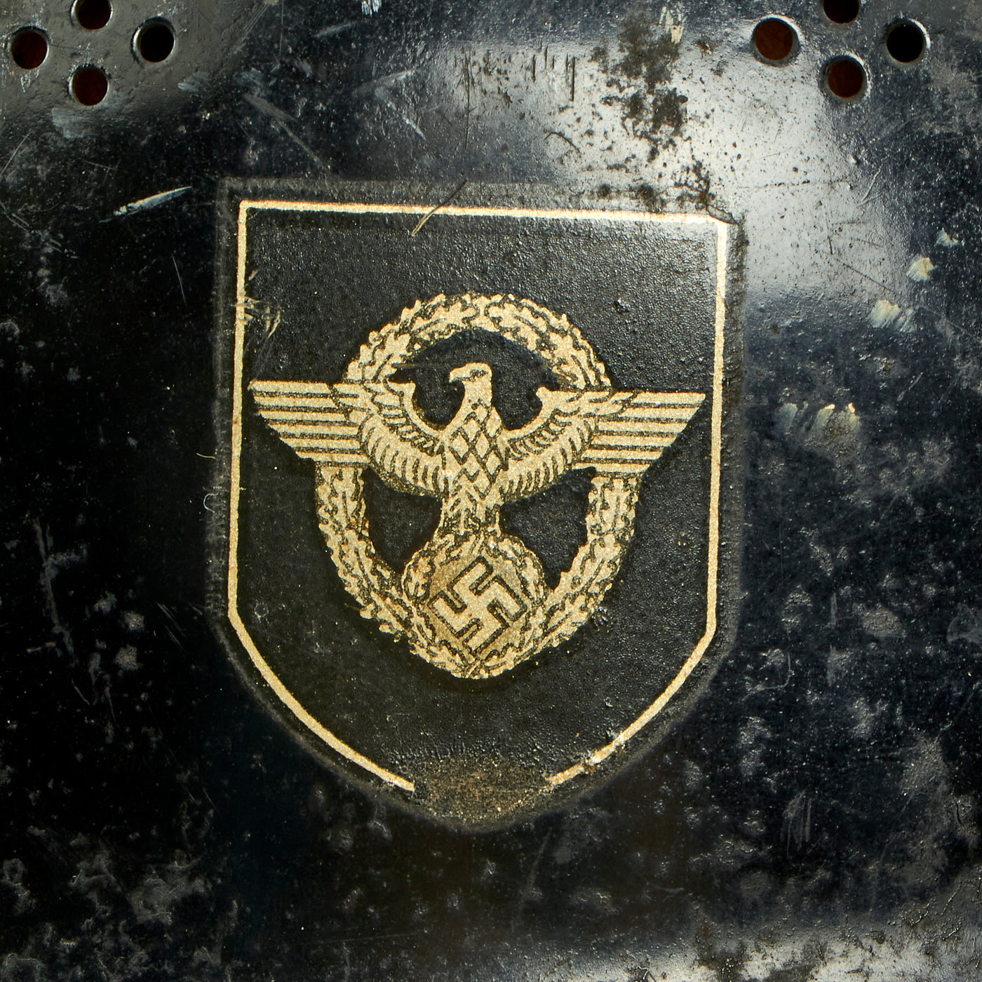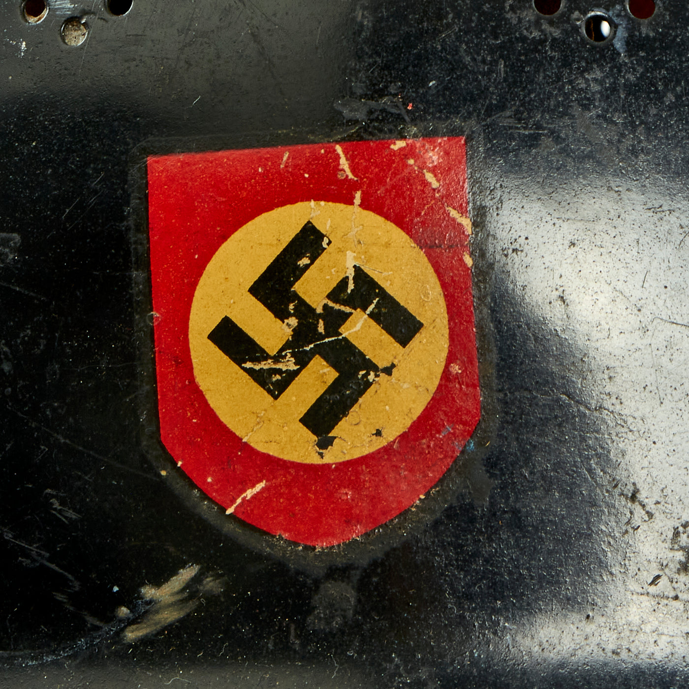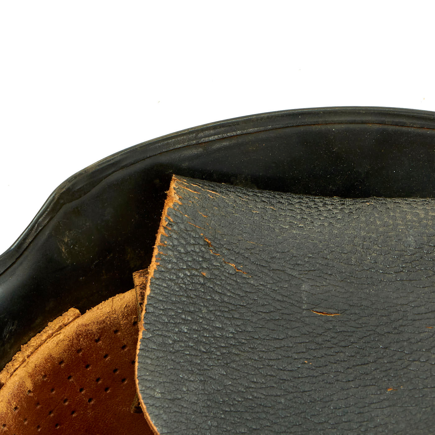 The helmet features genuine double decals of of a NSDAP Party Shield on the right, and NSDAP Civic Police Eagle on the left. The exterior of this German helmet retains virtually all of the original black paint, with just a bit of scuffing and wear. The NSDAP Party Shield decal is about 90% complete with some light scratches, while the NSDAP Civic Police Eagle is about 95%, with just a bit of missing at the bottom. Both have a lovely aged look from the lacquer component yellowing a bit.