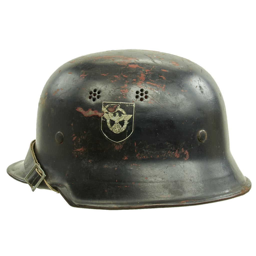 Original Item: Only One Available. This is a very nice genuine steel construction M34 "Square Dip" Third Reich helmet, outfitted for German WWII civic police issue. It features genuine double decals of civic eagle and NSDAP swas. Comes with complete leather liner and cork washers still intact and tight with all 4 split pins. The leather liner is in very good condition, showing light staining and wear. It still has an original size 55 marked on the top pad, and the rear tabs for a leather "skirt" are still attached. The original black leather chin strap is present, and also in great shape, with just a bit of finish loss.