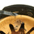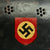 The exterior of this German helmet retains about 85% of the original black paint, with some wear through to the red primer coat in places, as well as overall wear and patination. The NSDAP decal is about 95% complete, with some small light wear, and the civic eagle is about 75%, with some wear through.