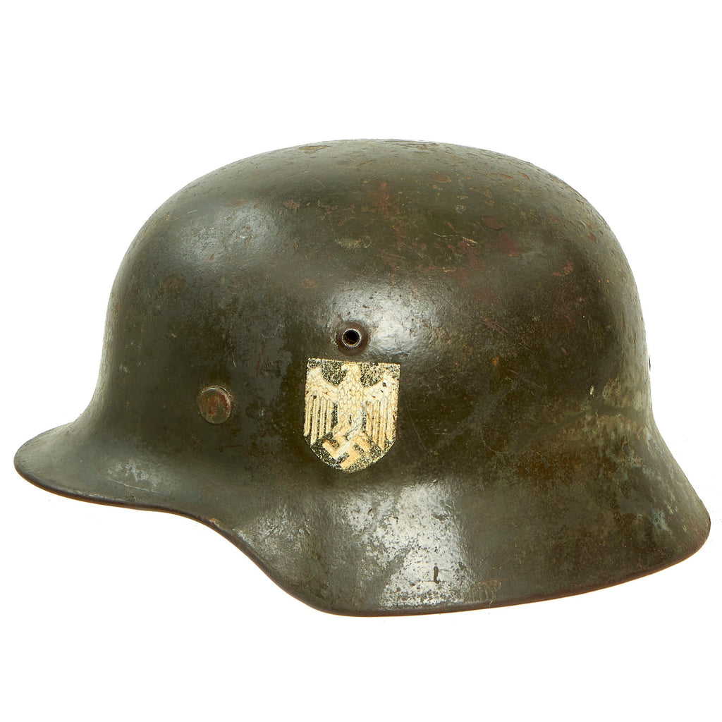 Original Item: Only One Available. This is a very nice all original example of a German Model 35 Steel helmet, as issued to the Wehrmacht Heer (army). It shows lovely period service wear in the form of chipped paint and oxidation on the shell of the helmet. It most likely saw service for a long period, but does not appear to have been repainted at any point during the war, or after. This stamped sheet steel construction helmet retains 75% of its original paint, which actually looks to be early war Apfelgrün (apple green), replaced later by the more blue gray panzergrau (armor gray).