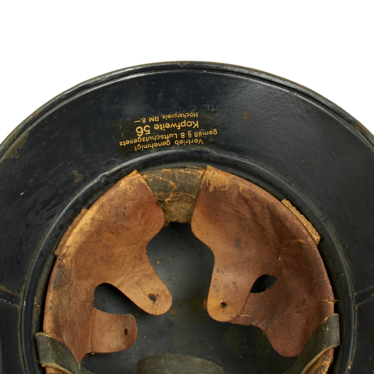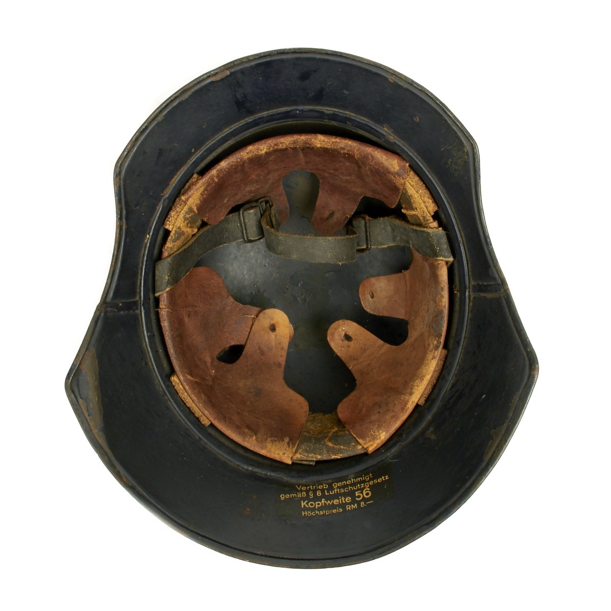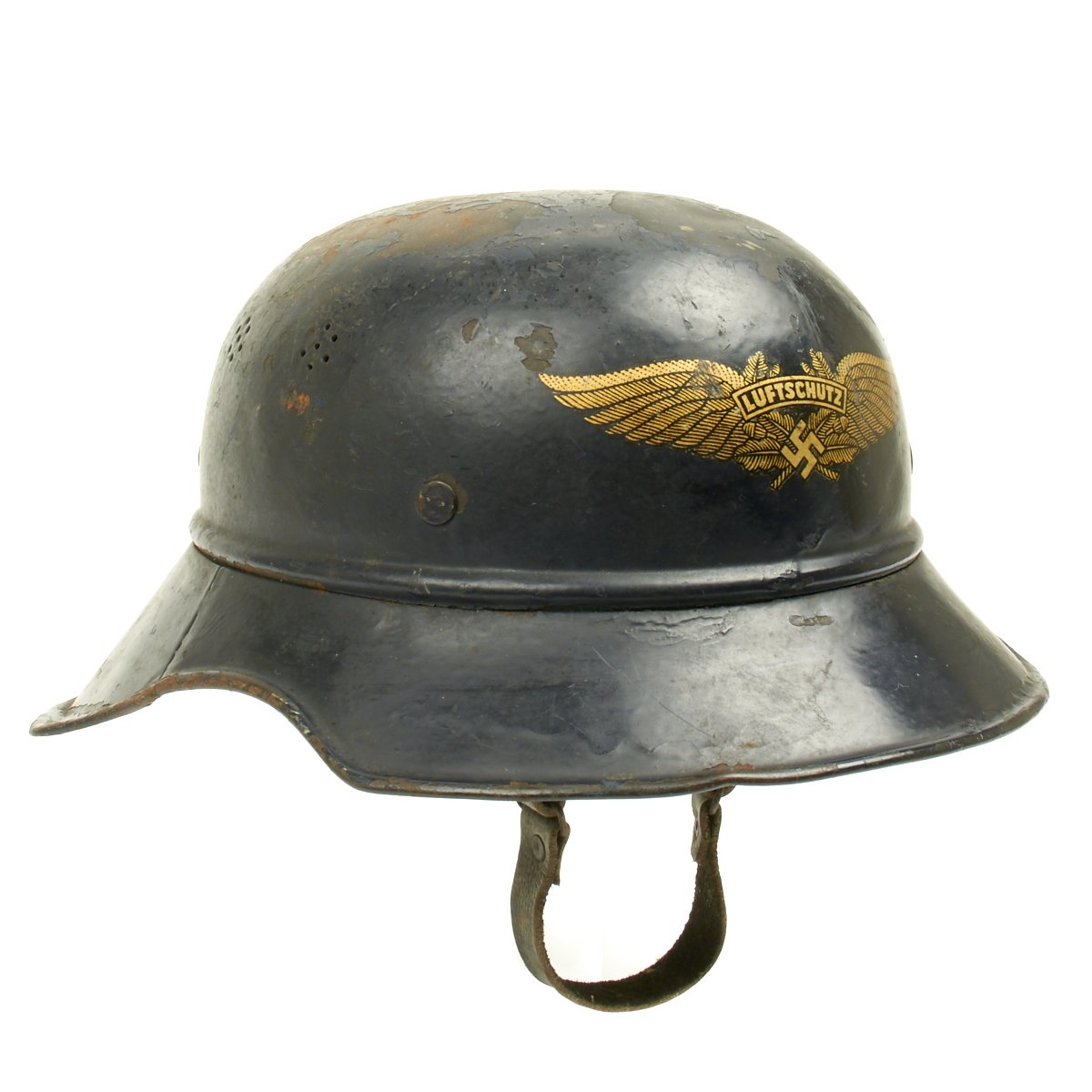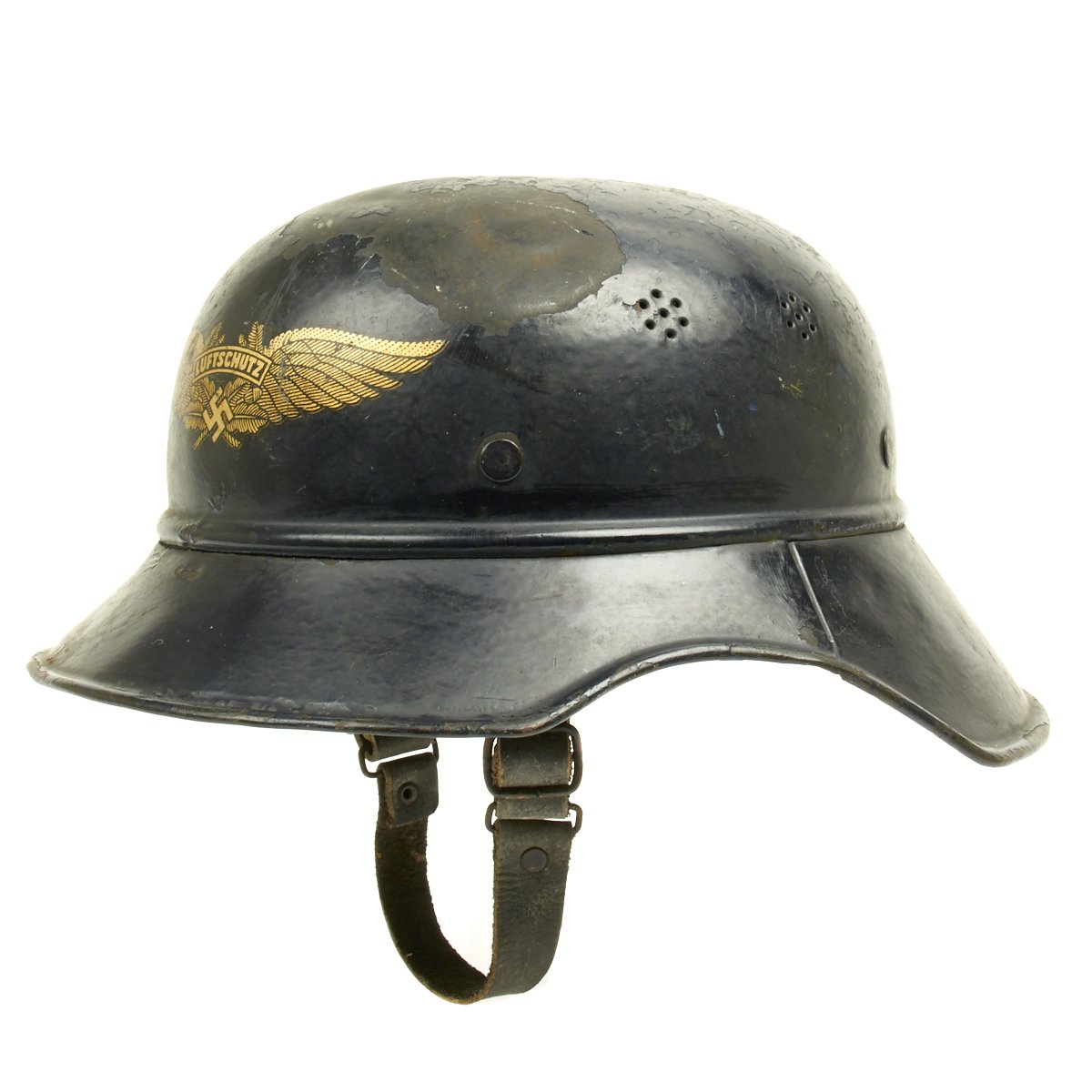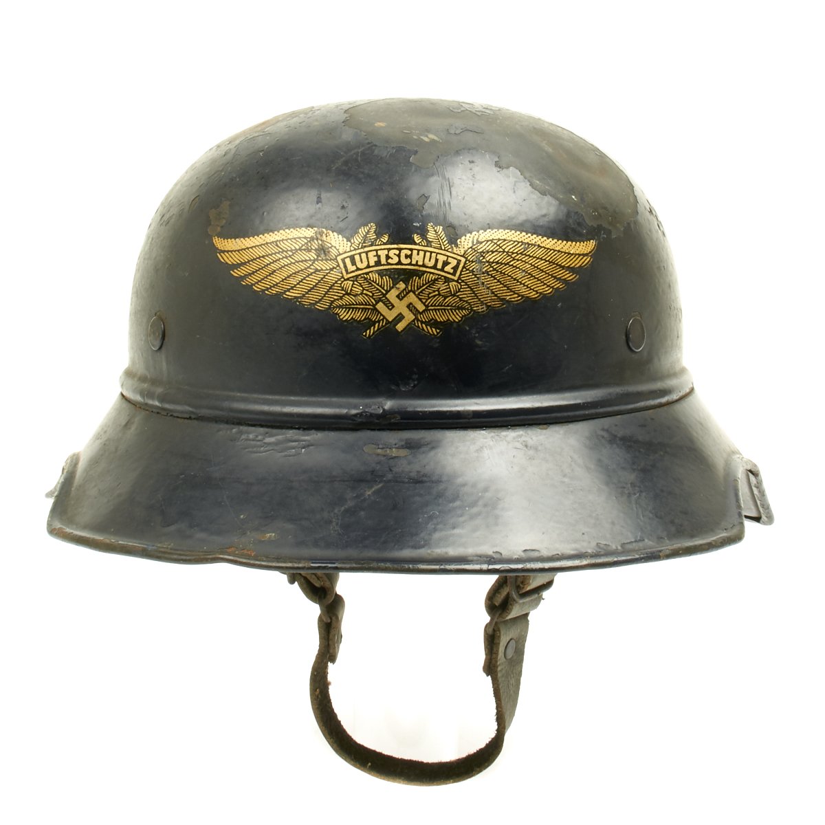 Original Items: Only one set available. This is an excellent original M1938 Beaded Luftschutz Gladiator German helmet. The exterior of this German helmet retains about 75% of the original dark blue paint. The helmet retains the original split pin rivets. The Luftschutz decal is clean and 98% complete but has some scuffs on the front side.