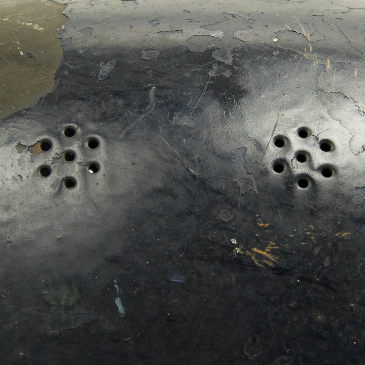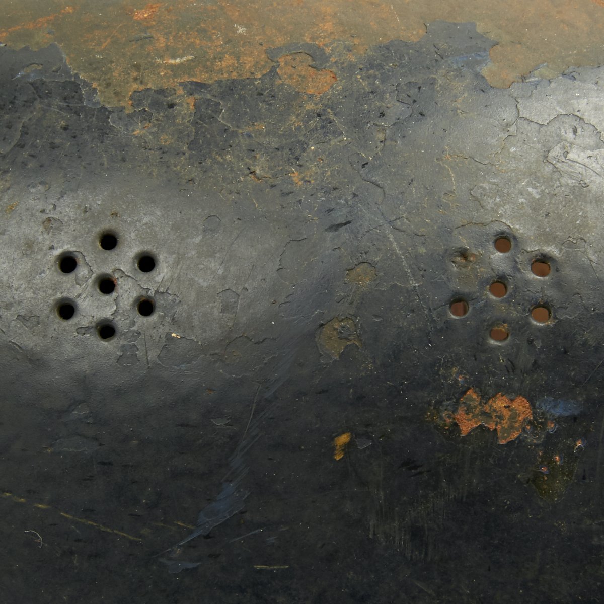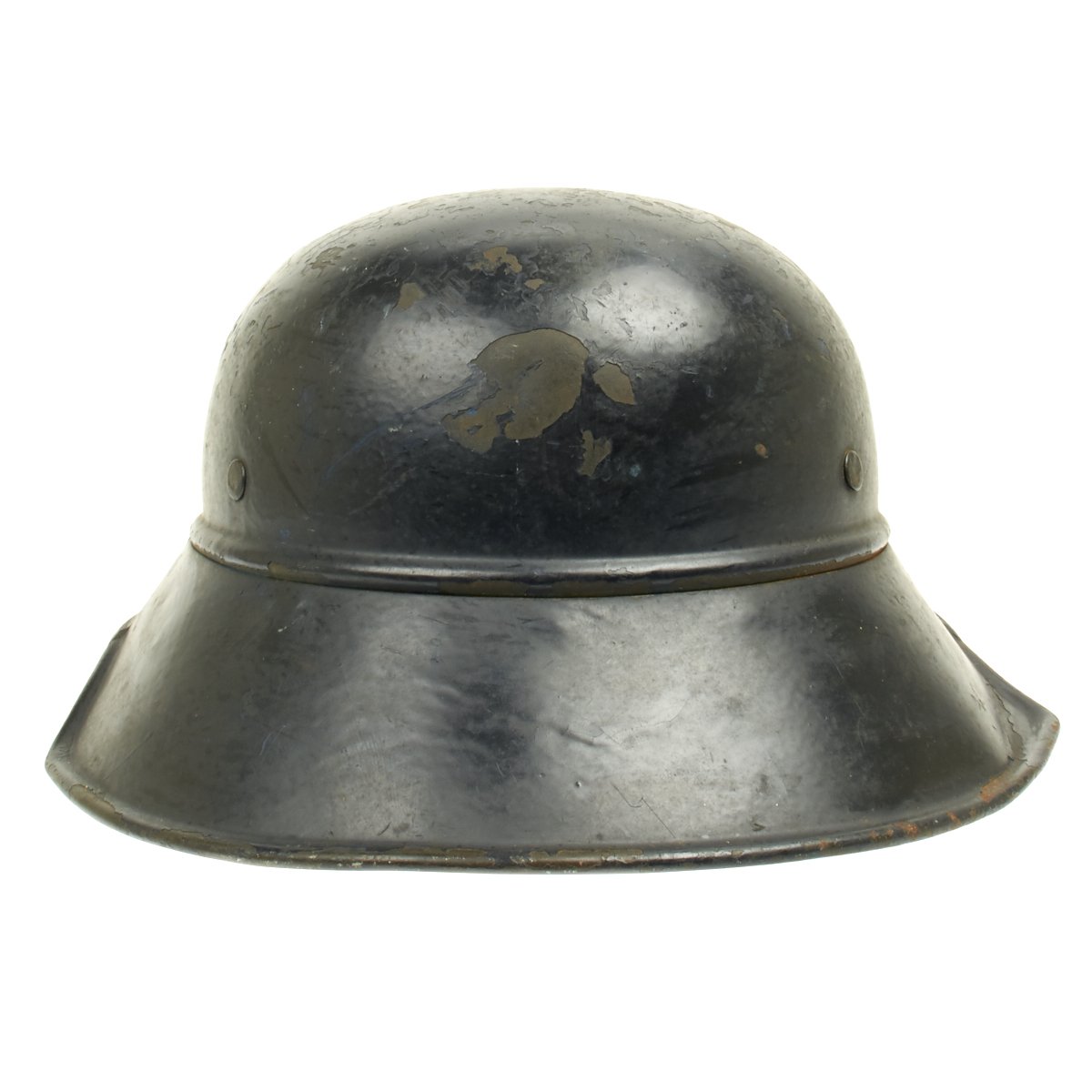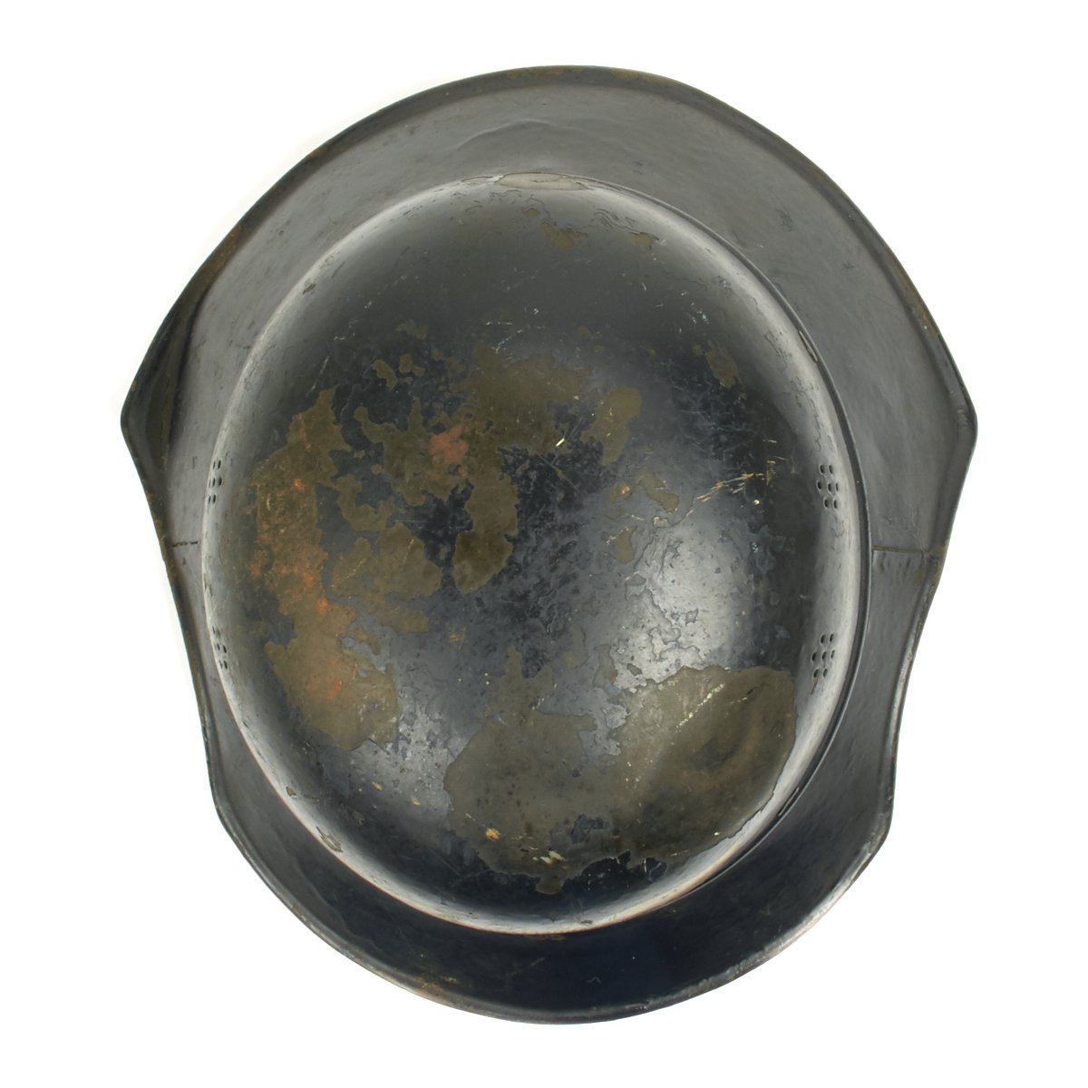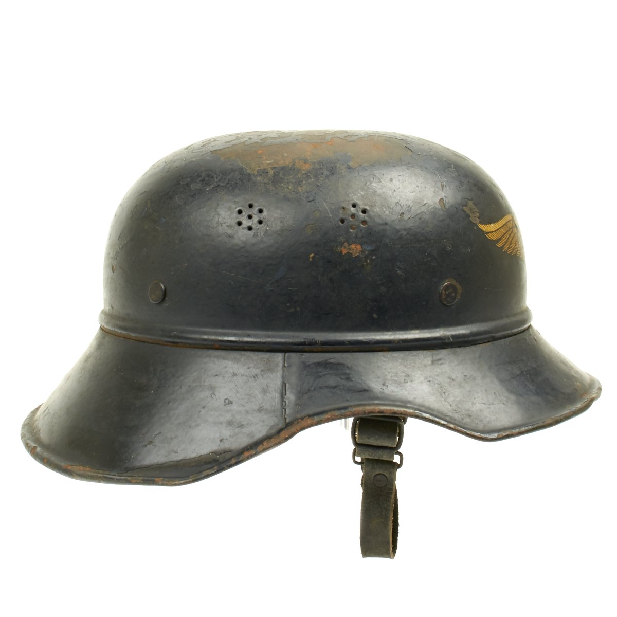 Original Items: Only one set available. This is an excellent original M1938 Beaded Luftschutz Gladiator German helmet. The exterior of this German helmet retains about 75% of the original dark blue paint. The helmet retains the original split pin rivets. The Luftschutz decal is clean and 98% complete but has some scuffs on the front side.