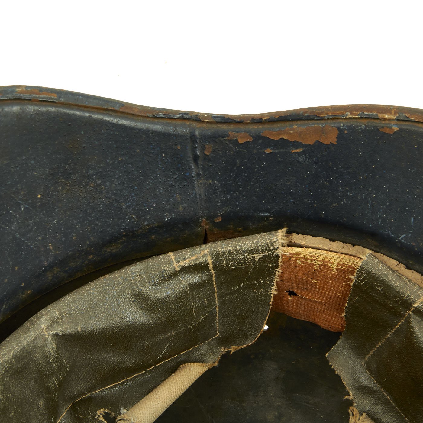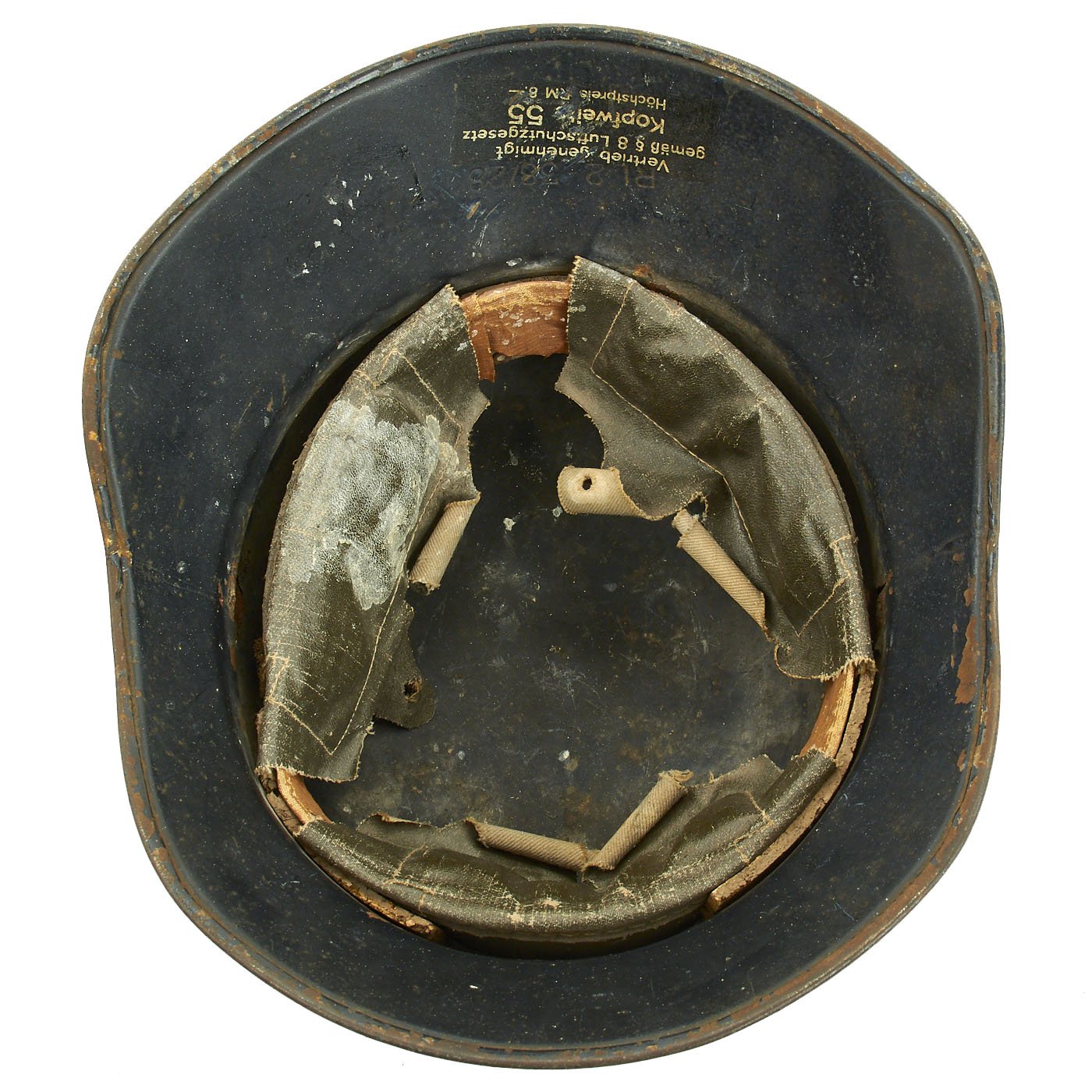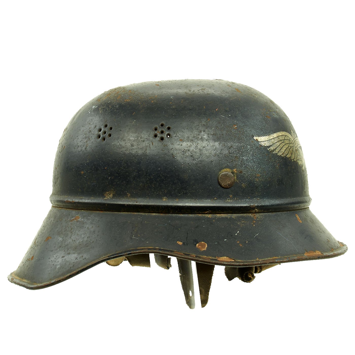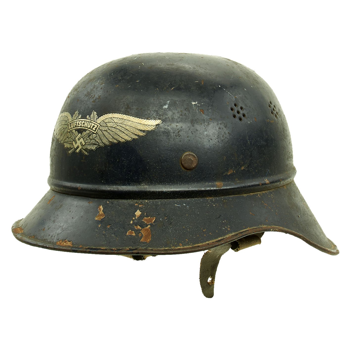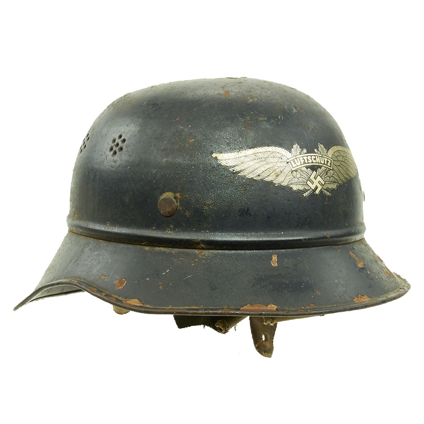 Original Item: Only One Available. This is a very nice original M1938 Beaded Luftschutz Gladiator German helmet. The exterior of this German helmet retains about 80% of the original dark blue paint, with overall wear, with some chipping and oxidation. The helmet retains the original split pin rivets, though they have lost their original paint. The Luftschutz decal is clean and 90% complete with only a few scuffs and wear.