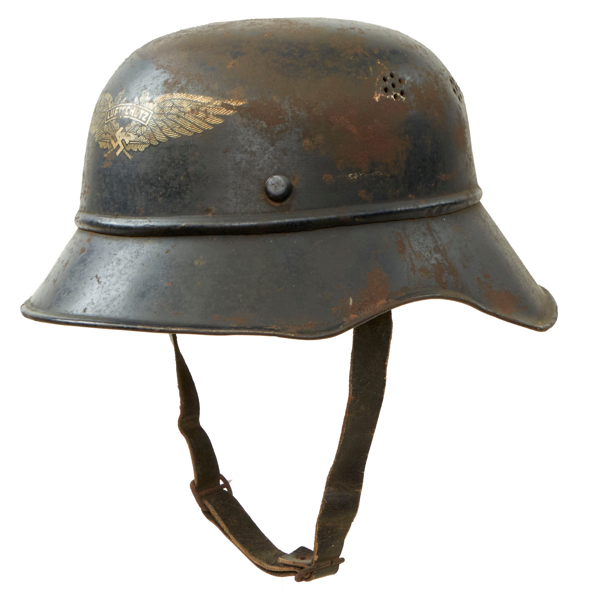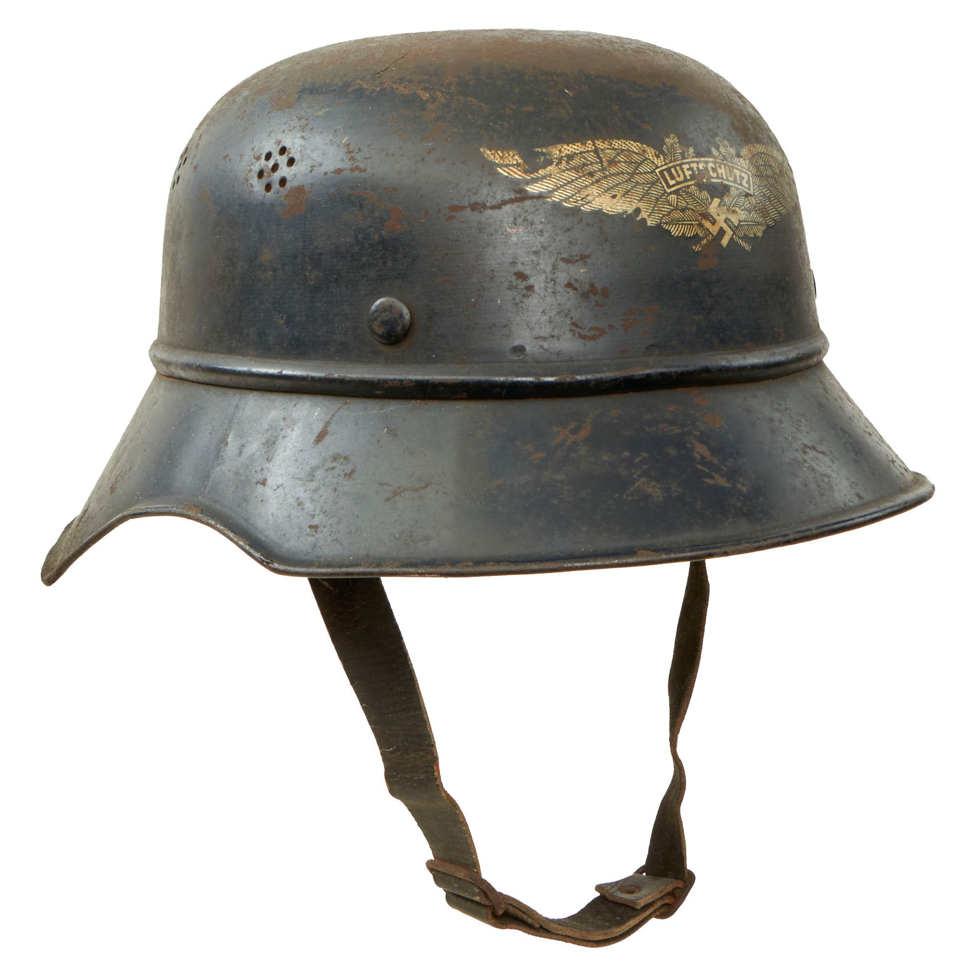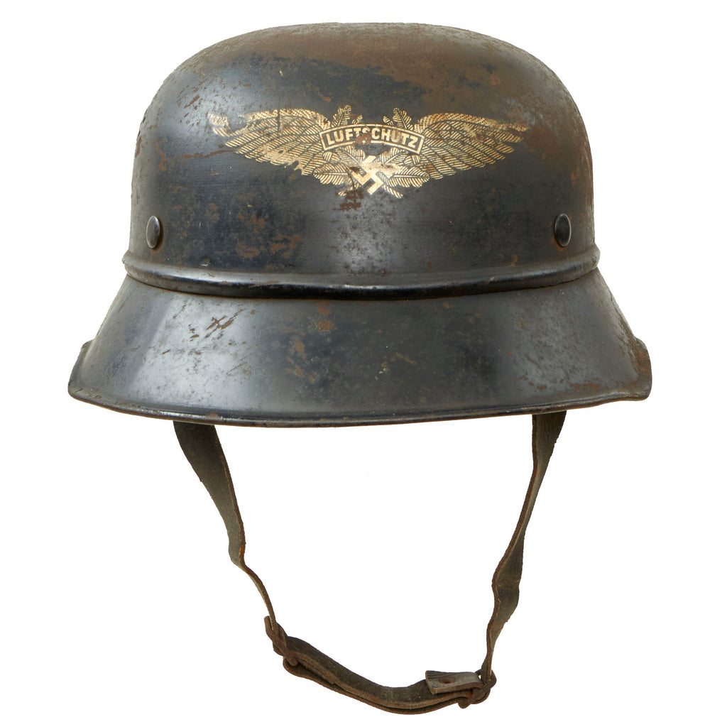 Original Item: Only One Available. This is a very nice original service worn M1938 Beaded Luftschutz Gladiator German helmet, which looks to have seen extensive service during the WWII era. The exterior of this German helmet retains about 60% of the original dark blue paint, showing a lot of wear to the crown, which has oxidized where the paint is missing. There is paint loss in other areas, probably due to moisture exposure, which has caused the finish to flake off. The interior is in a bit better shape, but still shows paint loss and oxidation.