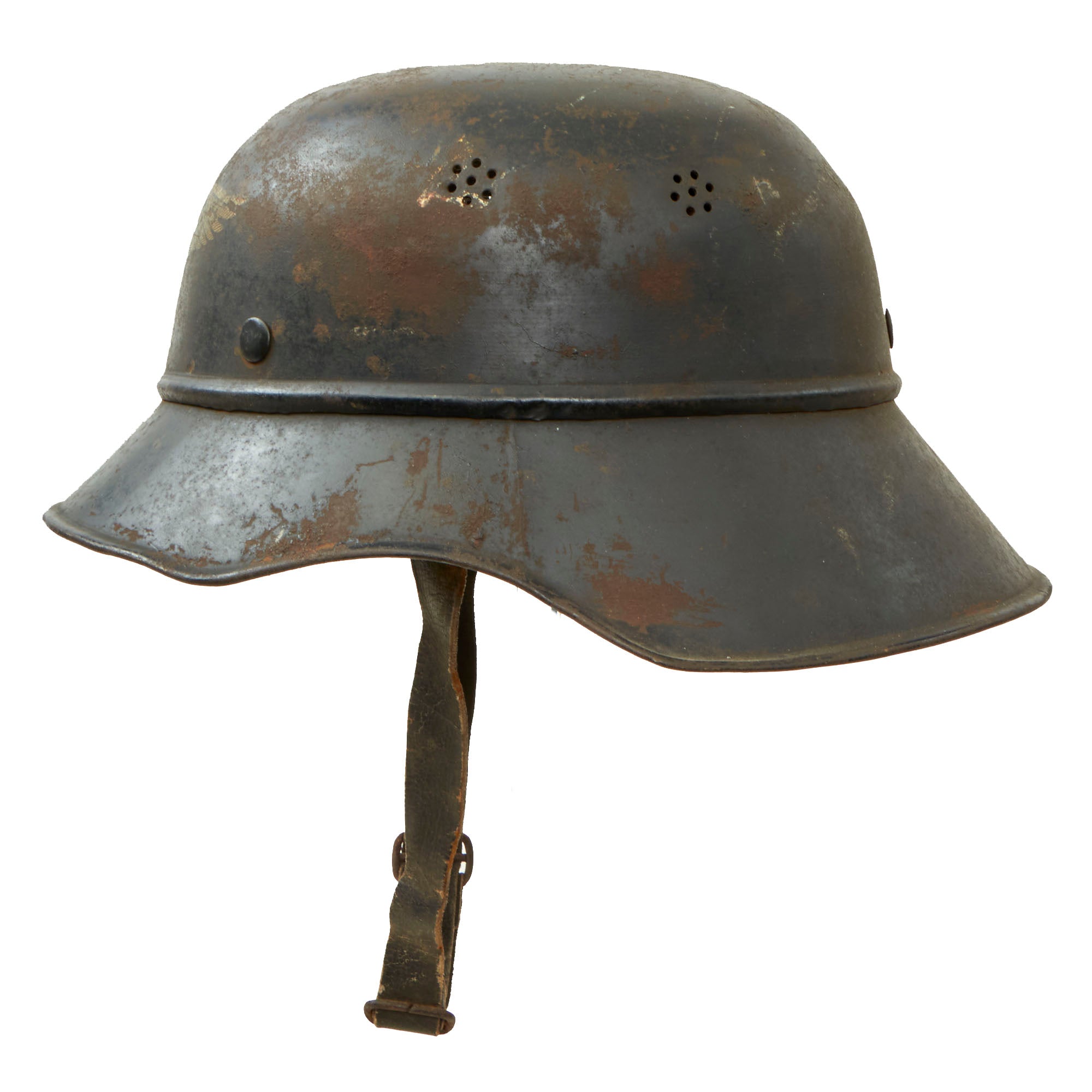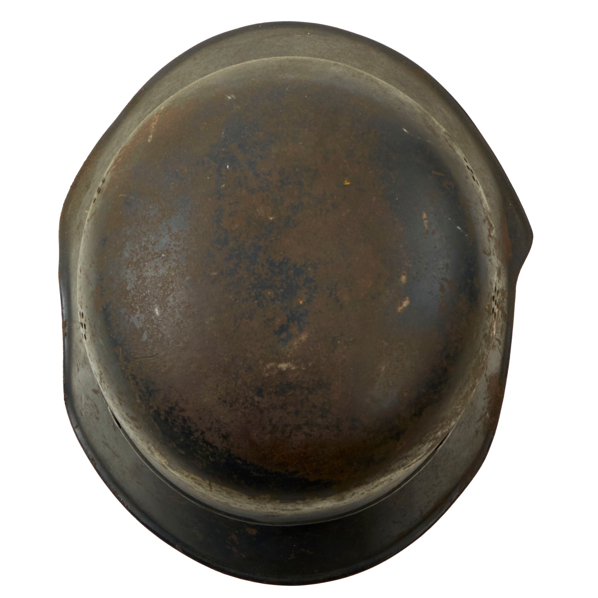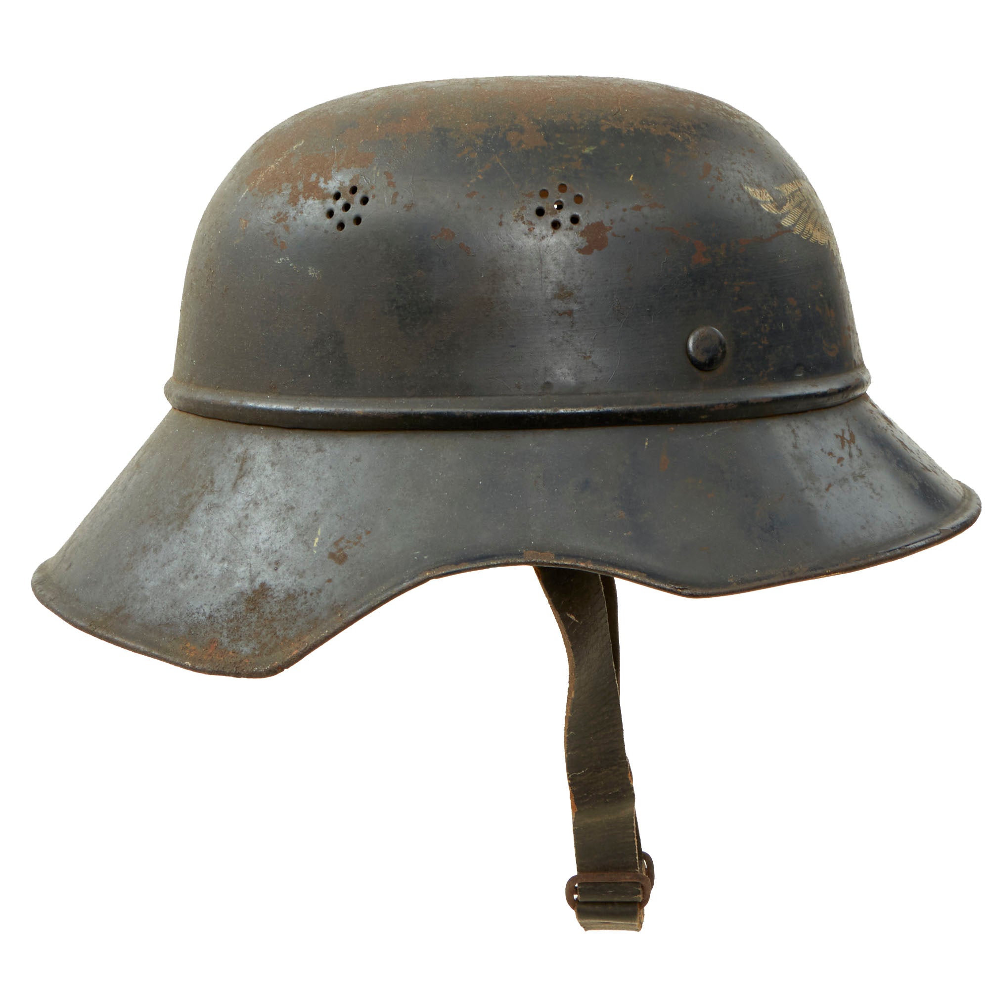 Original Item: Only One Available. This is a very nice original service worn M1938 Beaded Luftschutz Gladiator German helmet, which looks to have seen extensive service during the WWII era. The exterior of this German helmet retains about 60% of the original dark blue paint, showing a lot of wear to the crown, which has oxidized where the paint is missing. There is paint loss in other areas, probably due to moisture exposure, which has caused the finish to flake off. The interior is in a bit better shape, but still shows paint loss and oxidation.