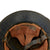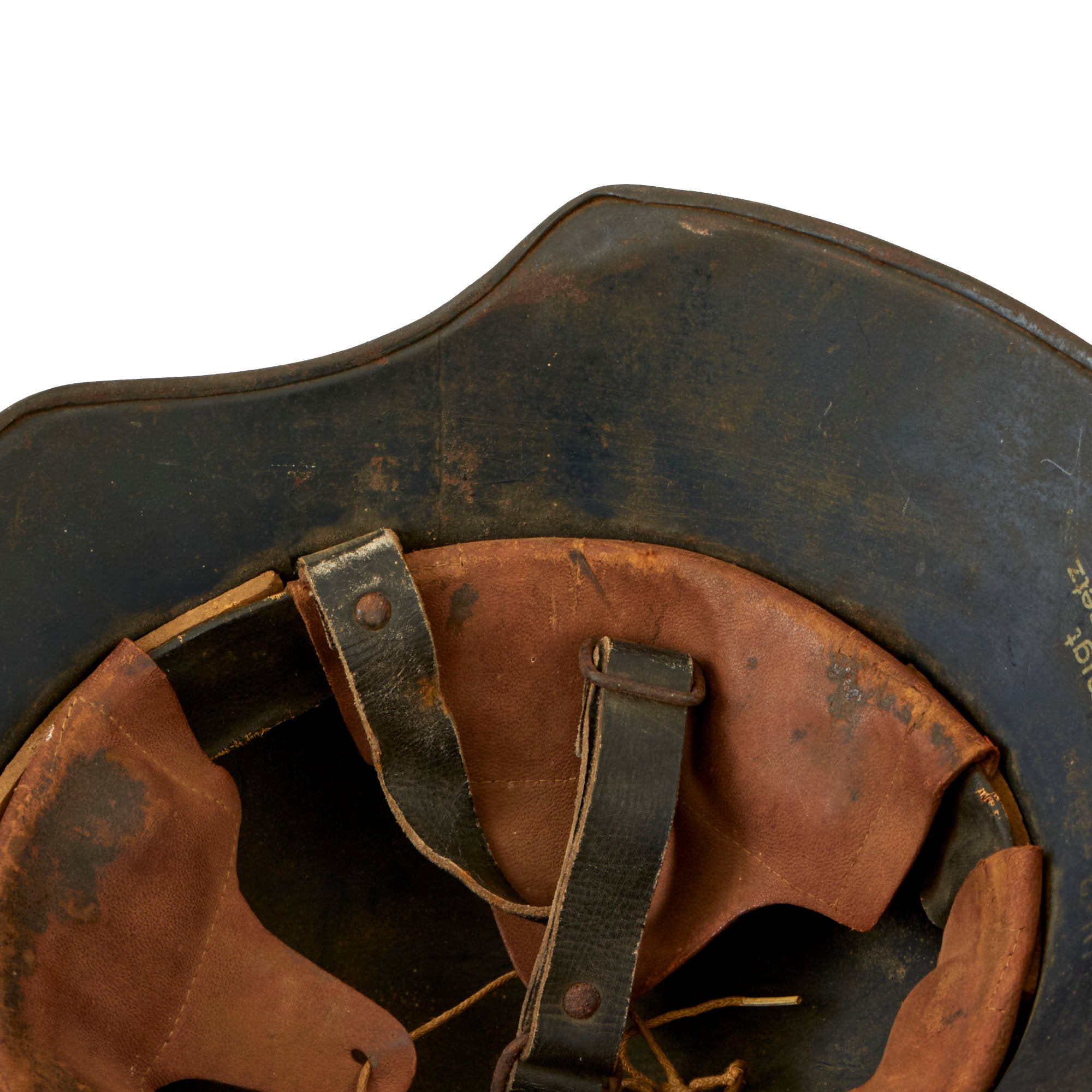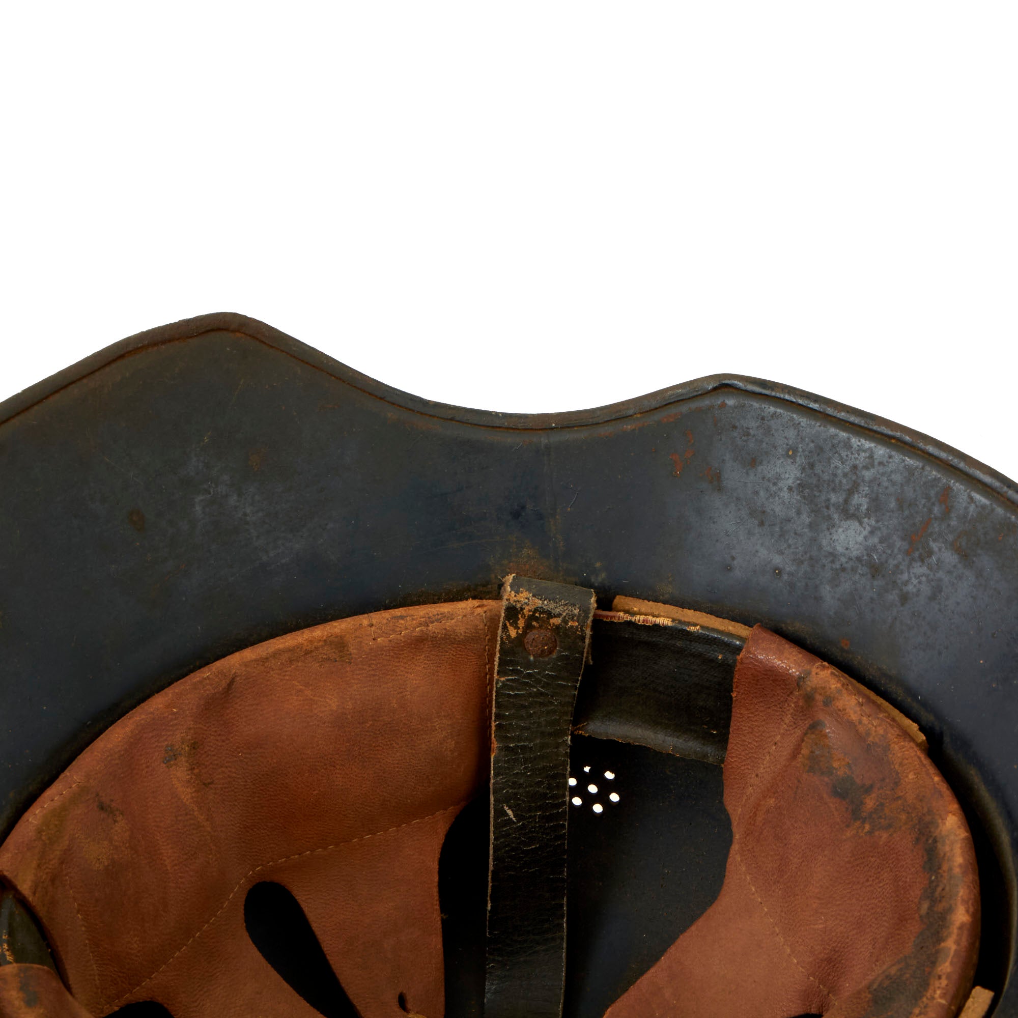 The liner in the helmet is a standard leather German WWI style, with the three larger panels attached to a liner band, which we often see in Luftschutz helmets. The panels are attached to a black oilcloth covered fiber band. It is in very good used condition, showing some staining, but the leather is still relatively supple and retains the top tie string. The original chinstrap is present and intact.