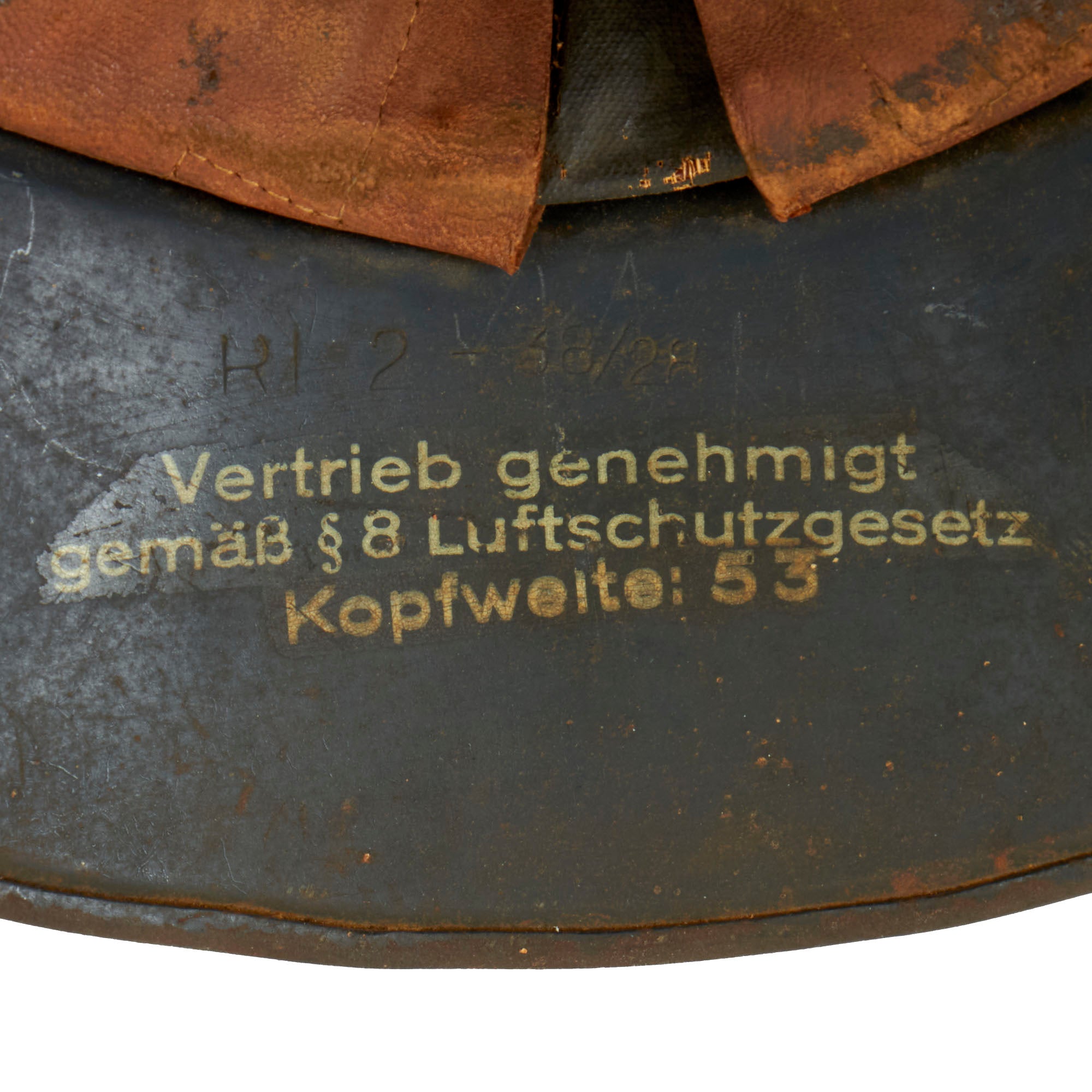 The inner skirt is maker marked with stamping into the steel with RL 2 - 38 / 28. These markings would seem to indicate that the helmet was made in 1938, though we do not know if any records were kept of the maker. It may be that it was made under a 1938 contract. Below is a original Luftschutz helmet information decal / paint stamp, which is complete: