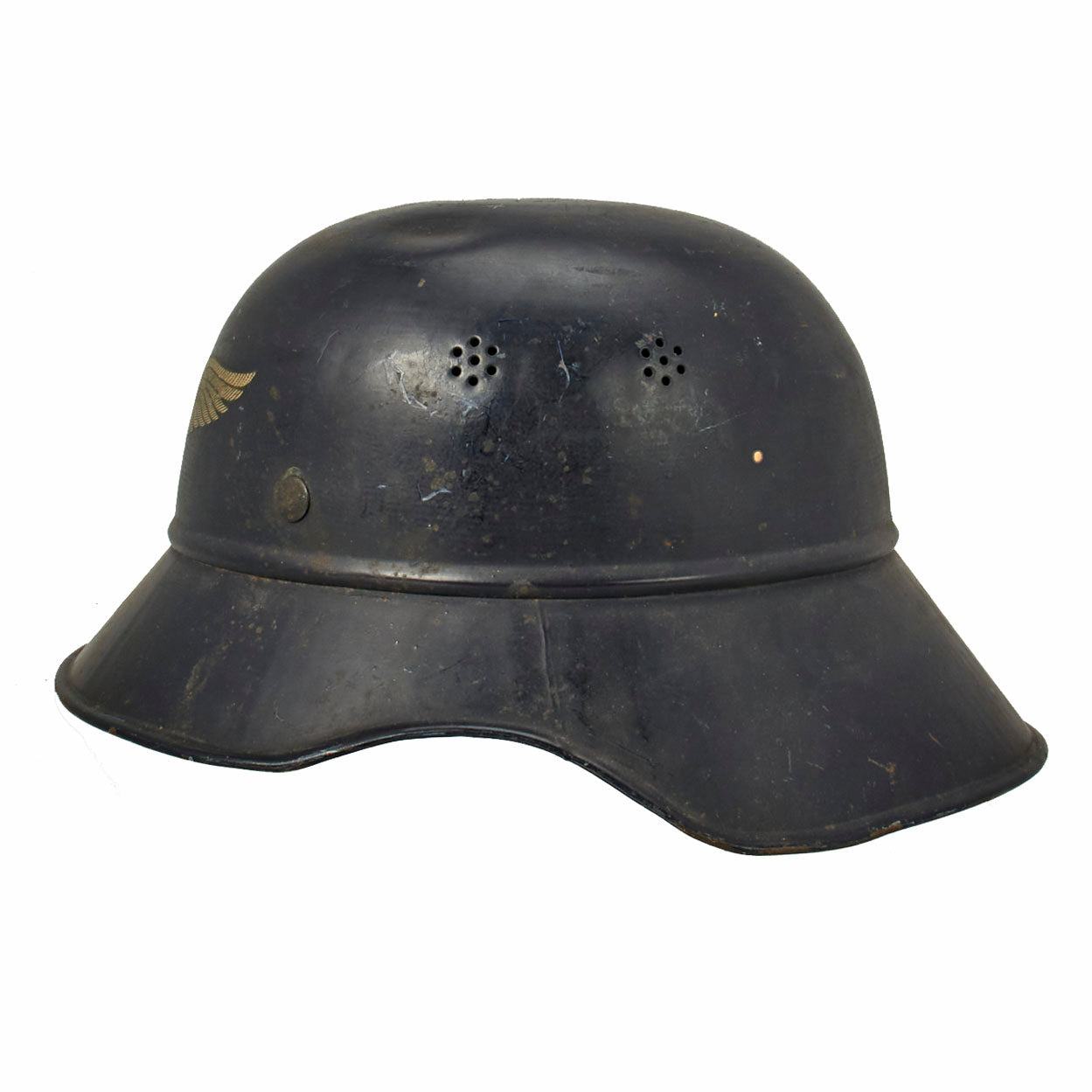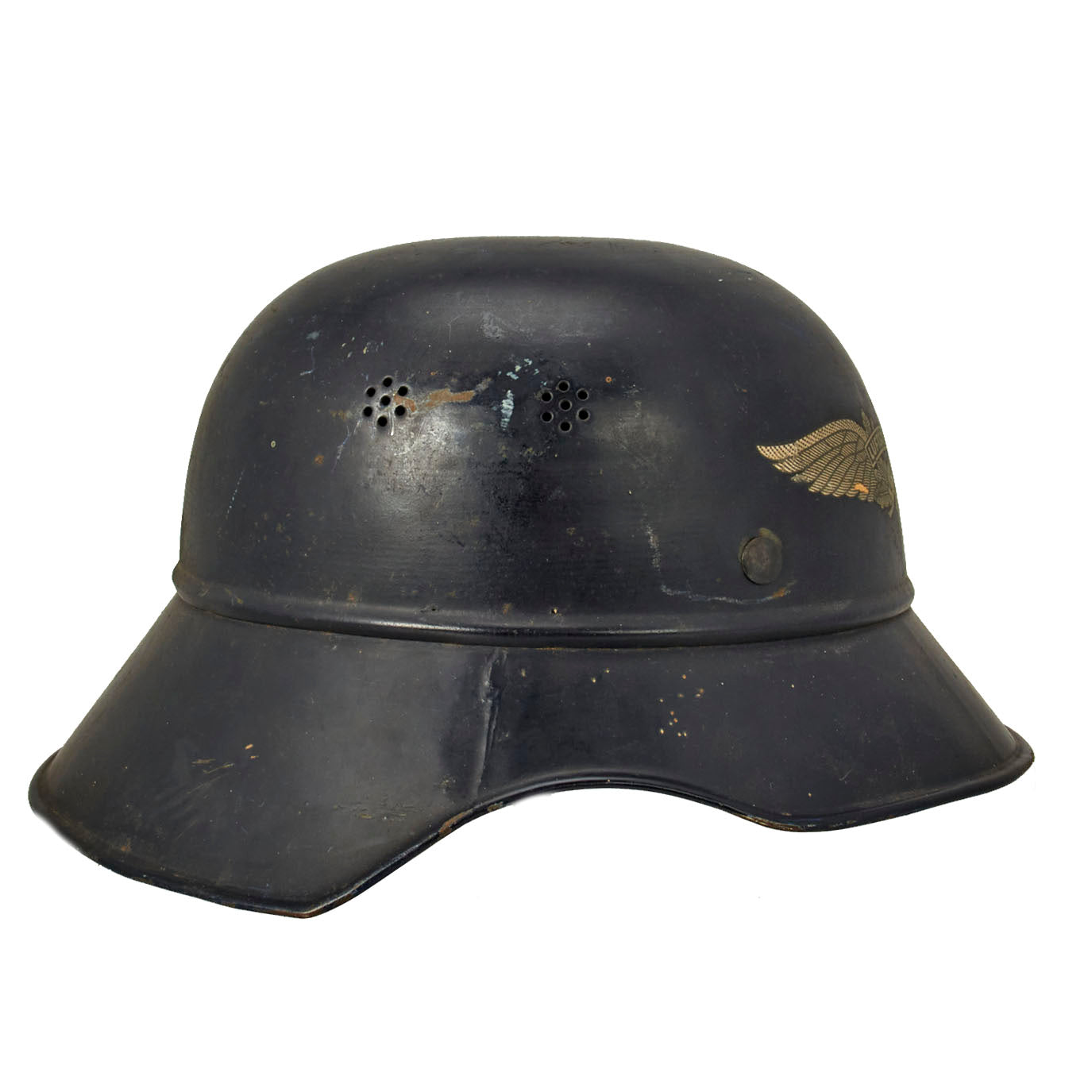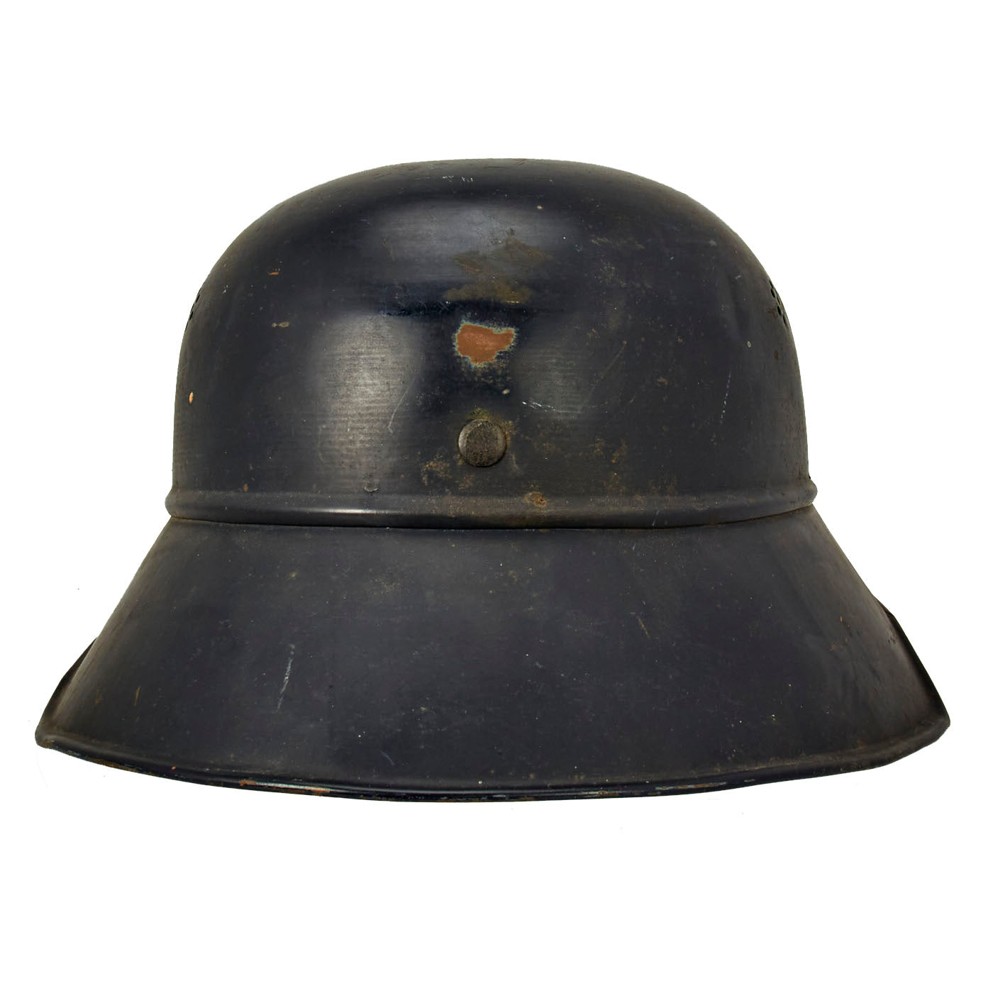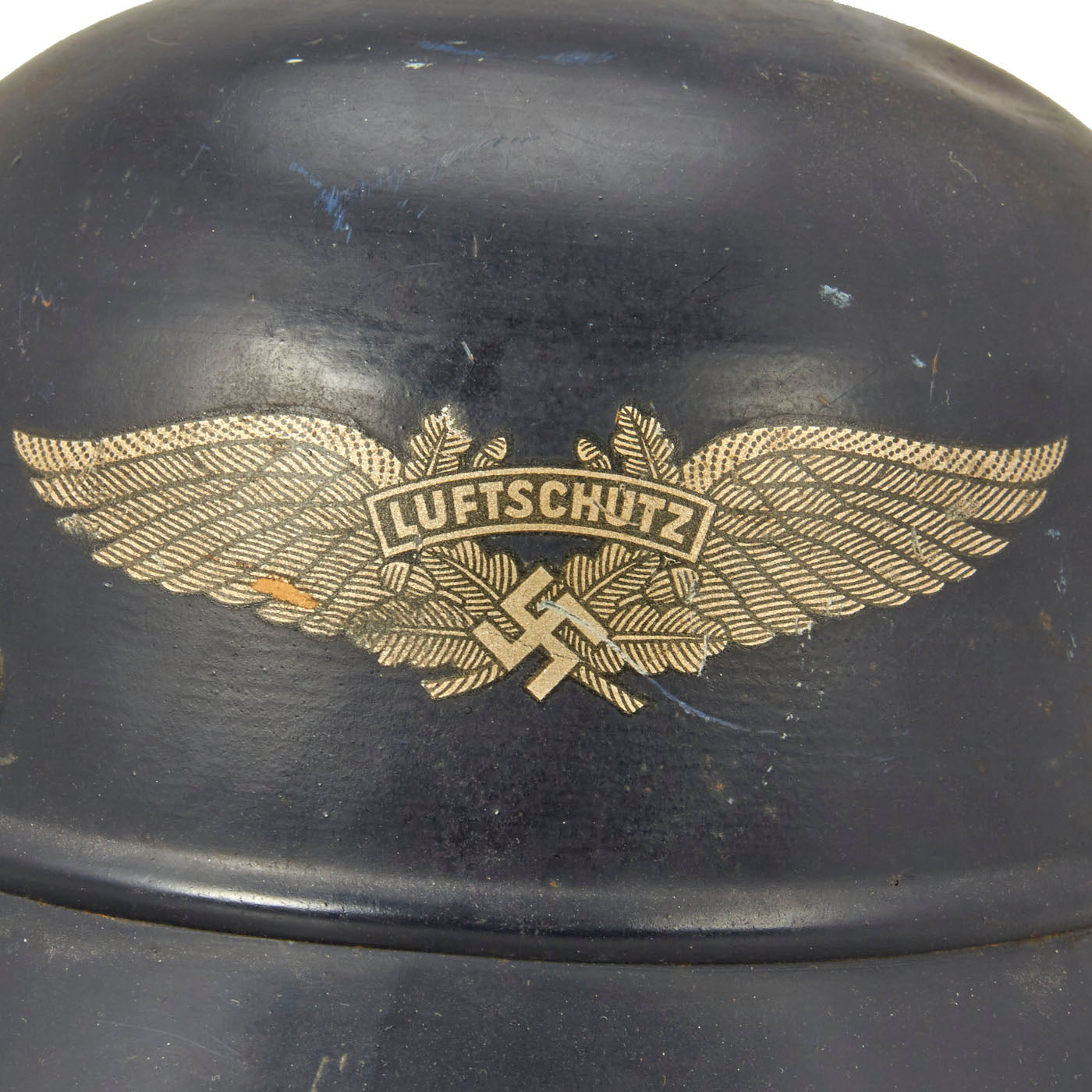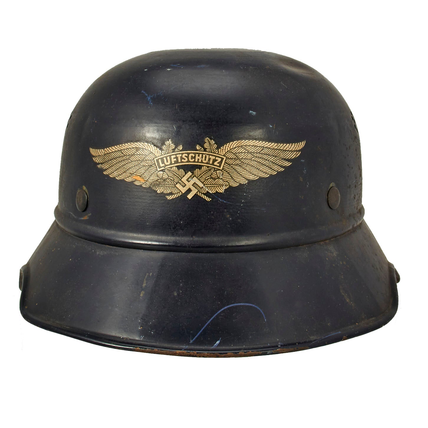 Original Item: Only One Available. This is a very nice original M1938 Beaded Luftschutz Gladiator German helmet. The exterior of this German helmet retains over 90% of the original dark blue paint, with only light overall wear and some scuffs through the paint. The helmet still has all three of the original hollow liner attachment rivets, with fully intact paint.