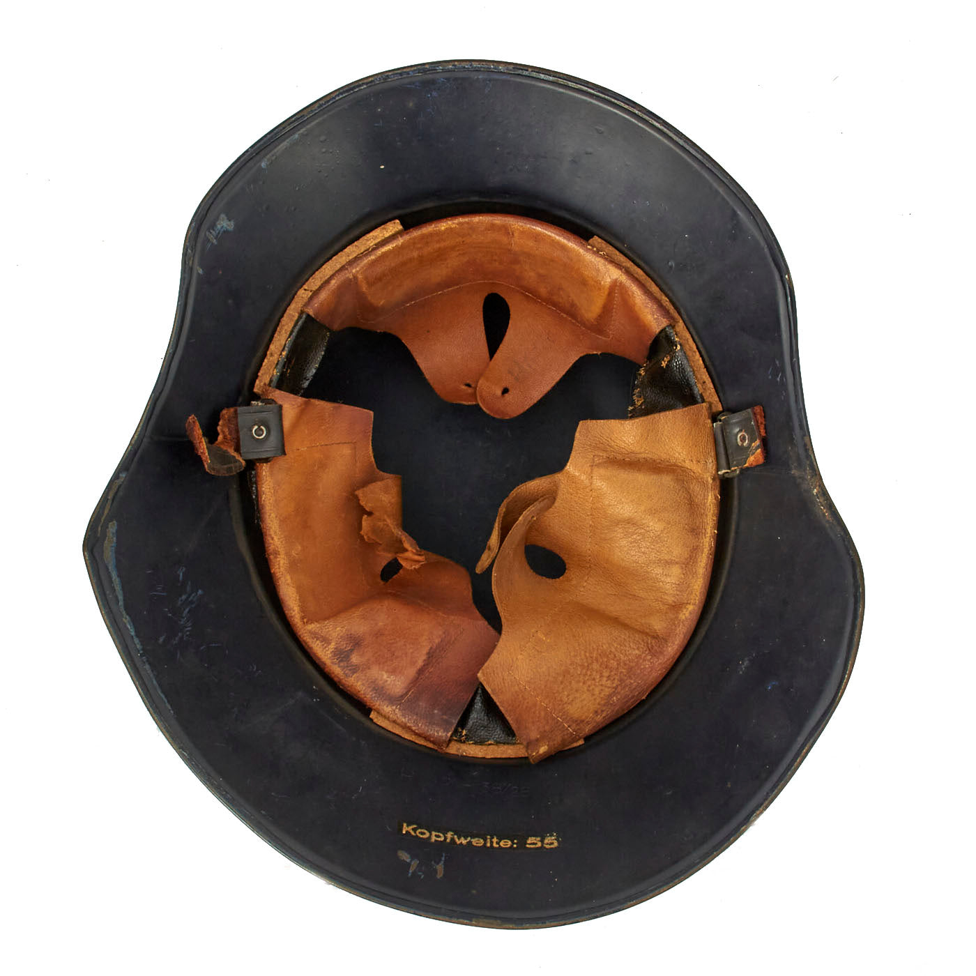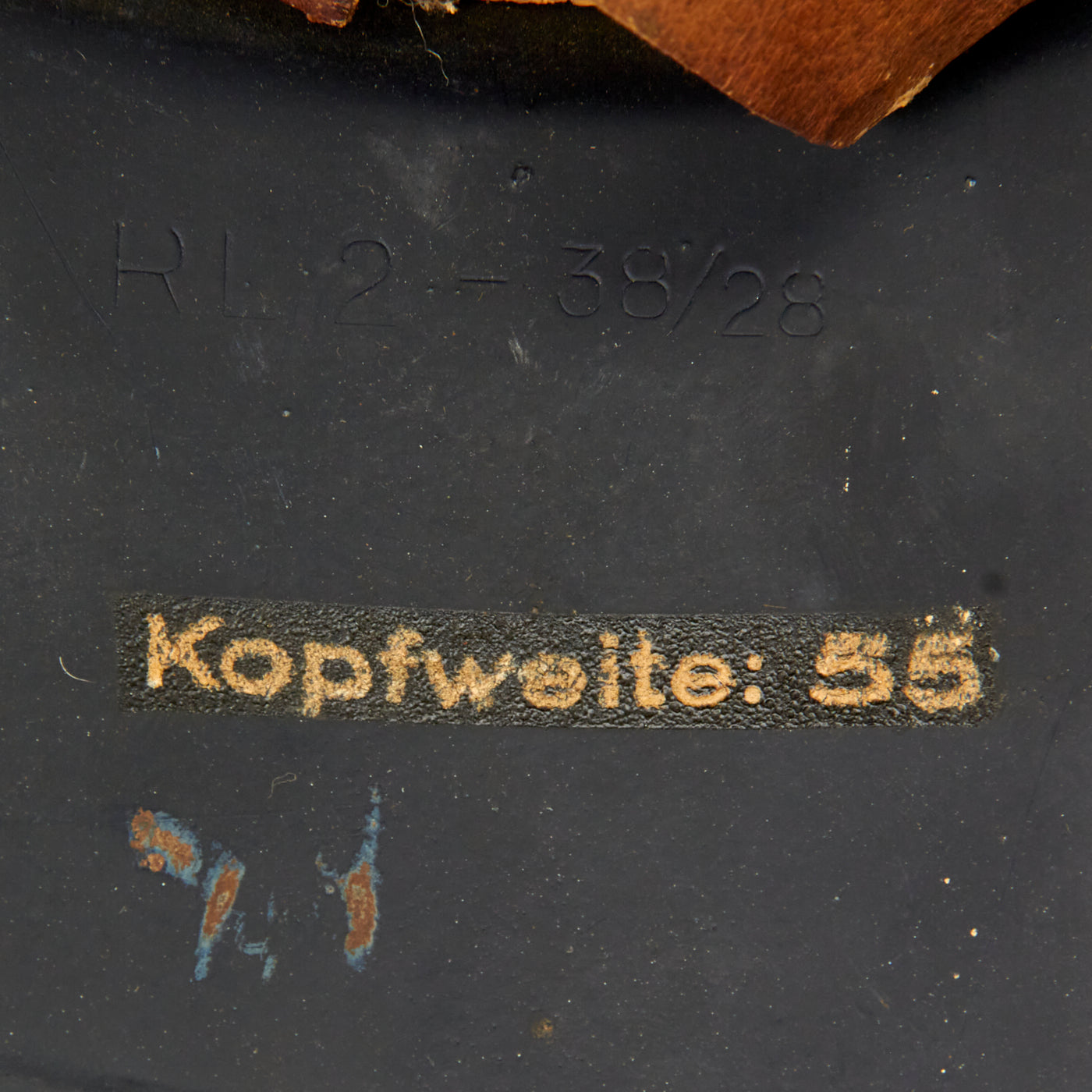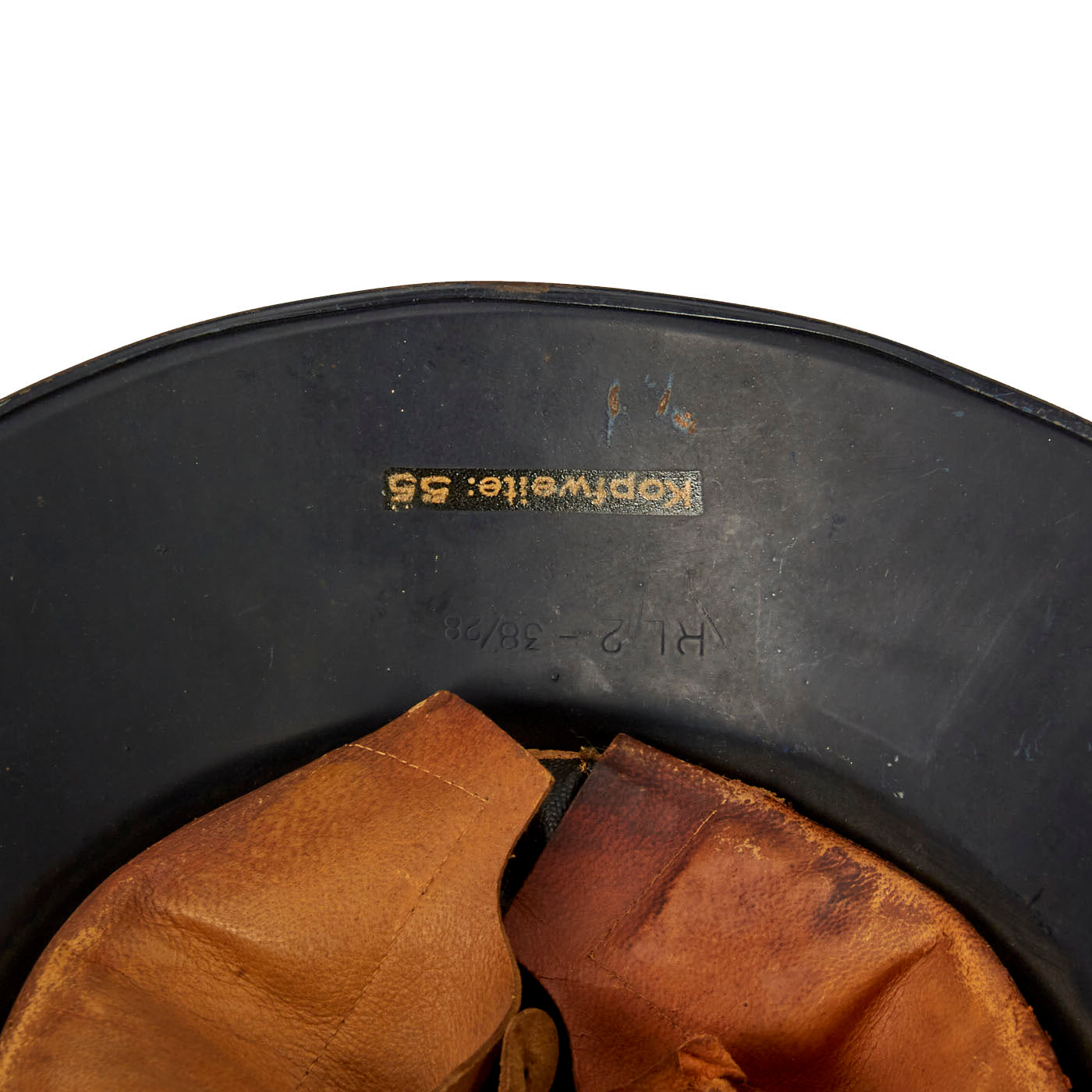 The inner skirt is maker marked with stamping into the steel with RL2 38 / 28. These markings would seem to indicate that the helmet was made in 1938, though we do not know if any records were kept of the maker. It may be that it was made under a 1938 contract. There is also a decal reading Kopfweite: 55, or "head width 55cm".