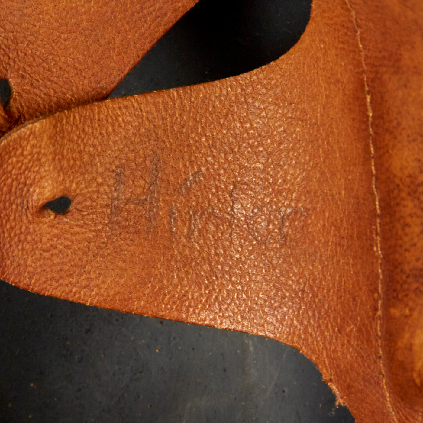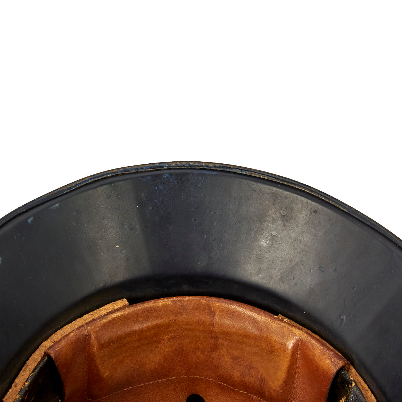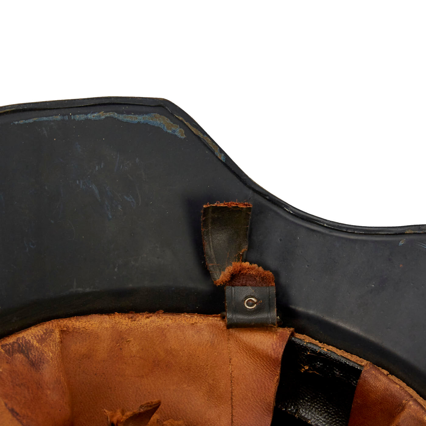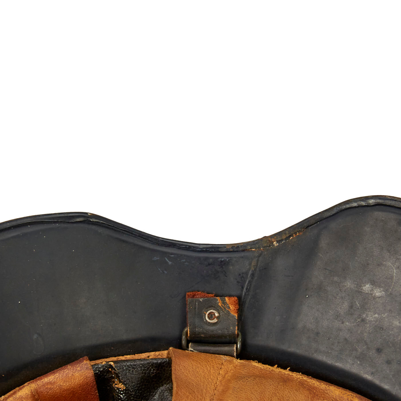 The liner in this helmet is made from oilcloth, an early form of leather, and is complete, although two fingers attached to one pad are torn. The style is reminiscent of earlier WWI liners, with three pads topped with two fingers each. The fiber liner band is also covered in oil cloth, and the three cork pads are still present between the liner band and shell. The leather chin strap is missing, with only remnants remaining attached to the bales.