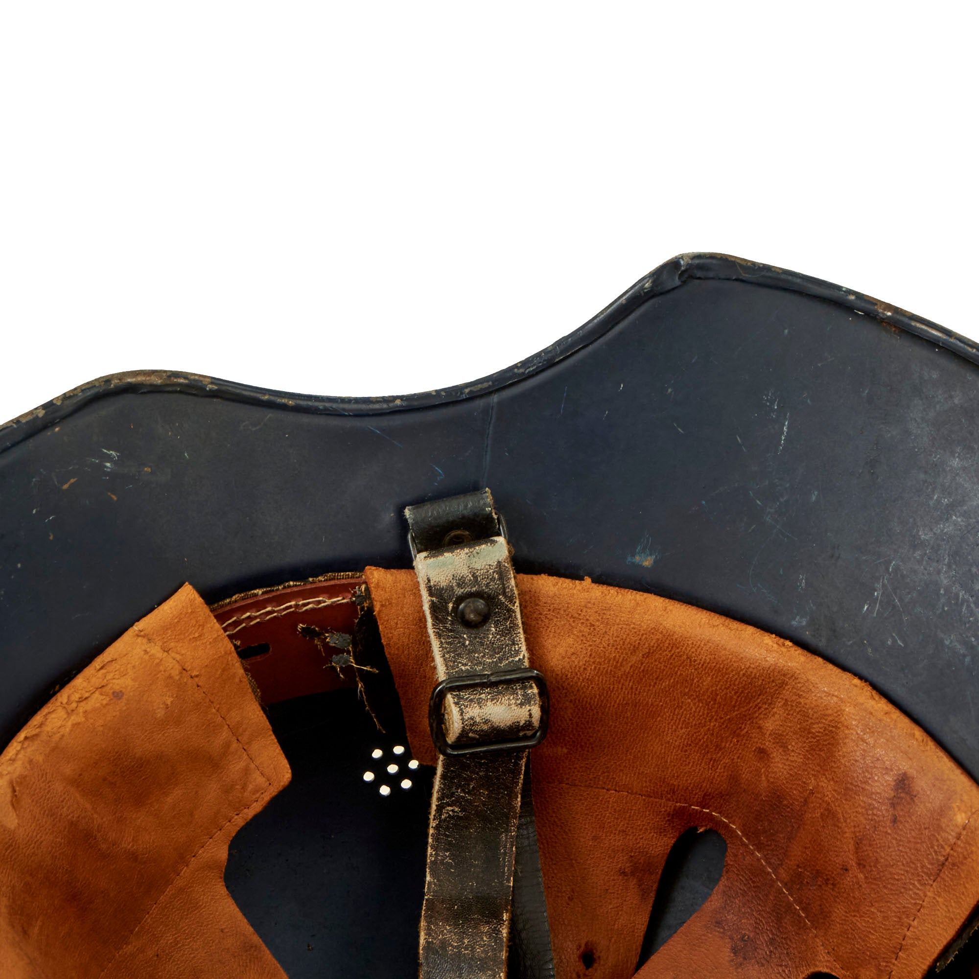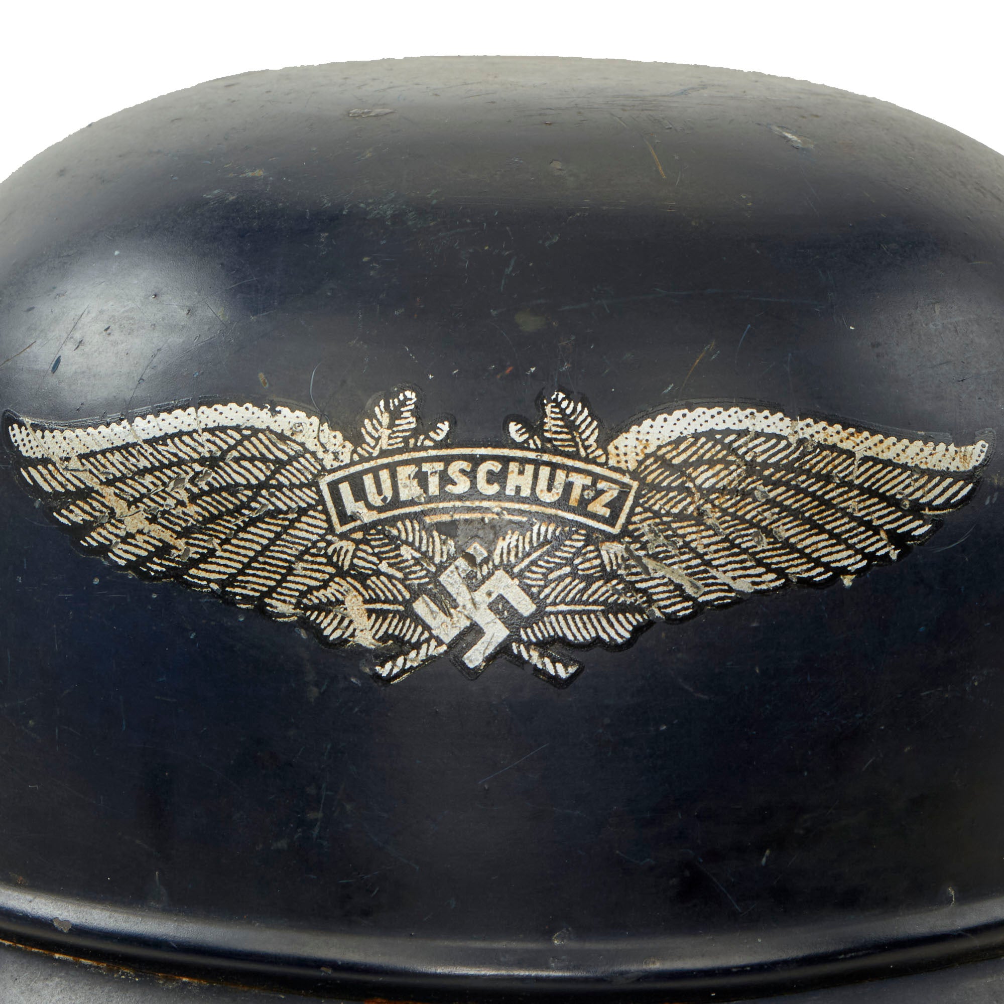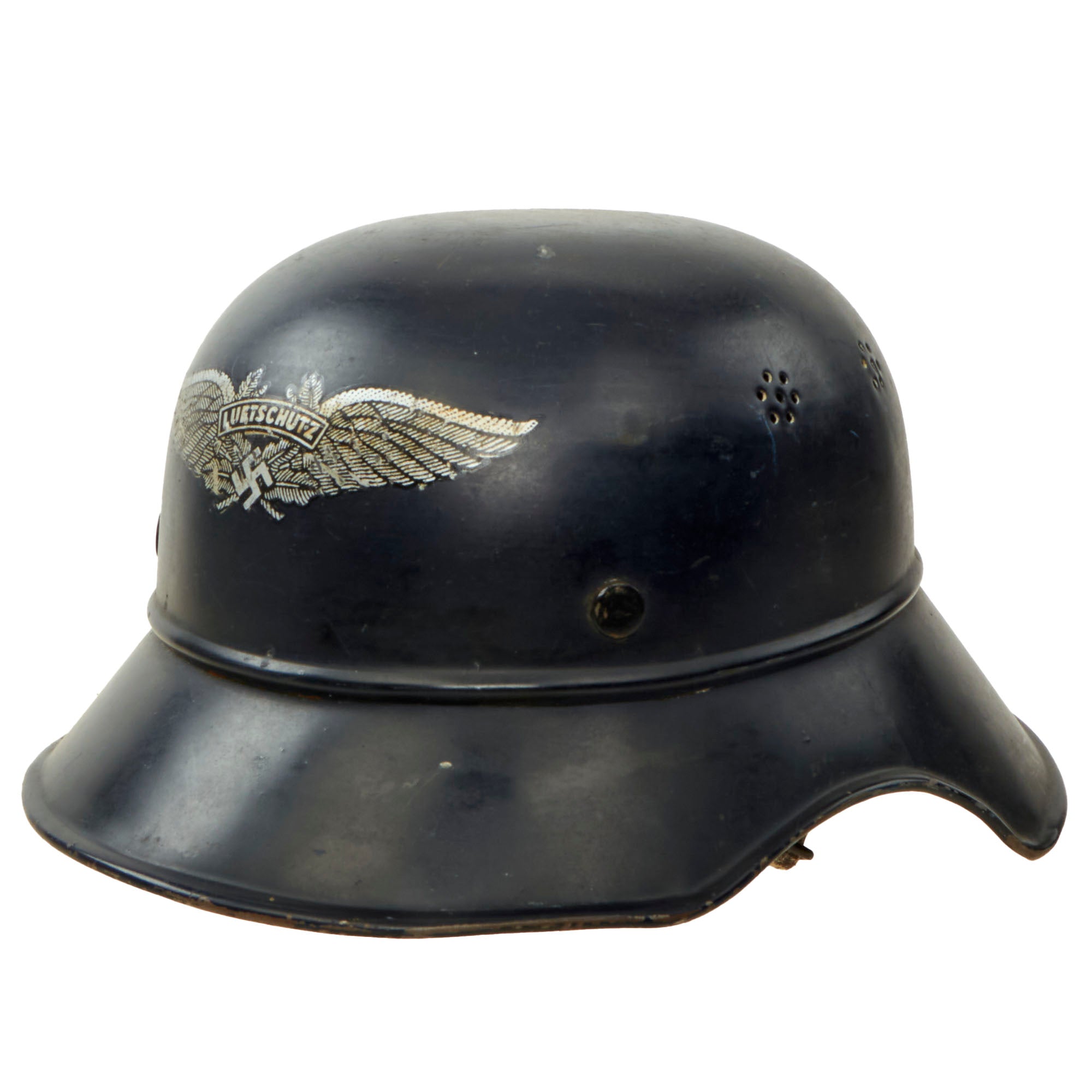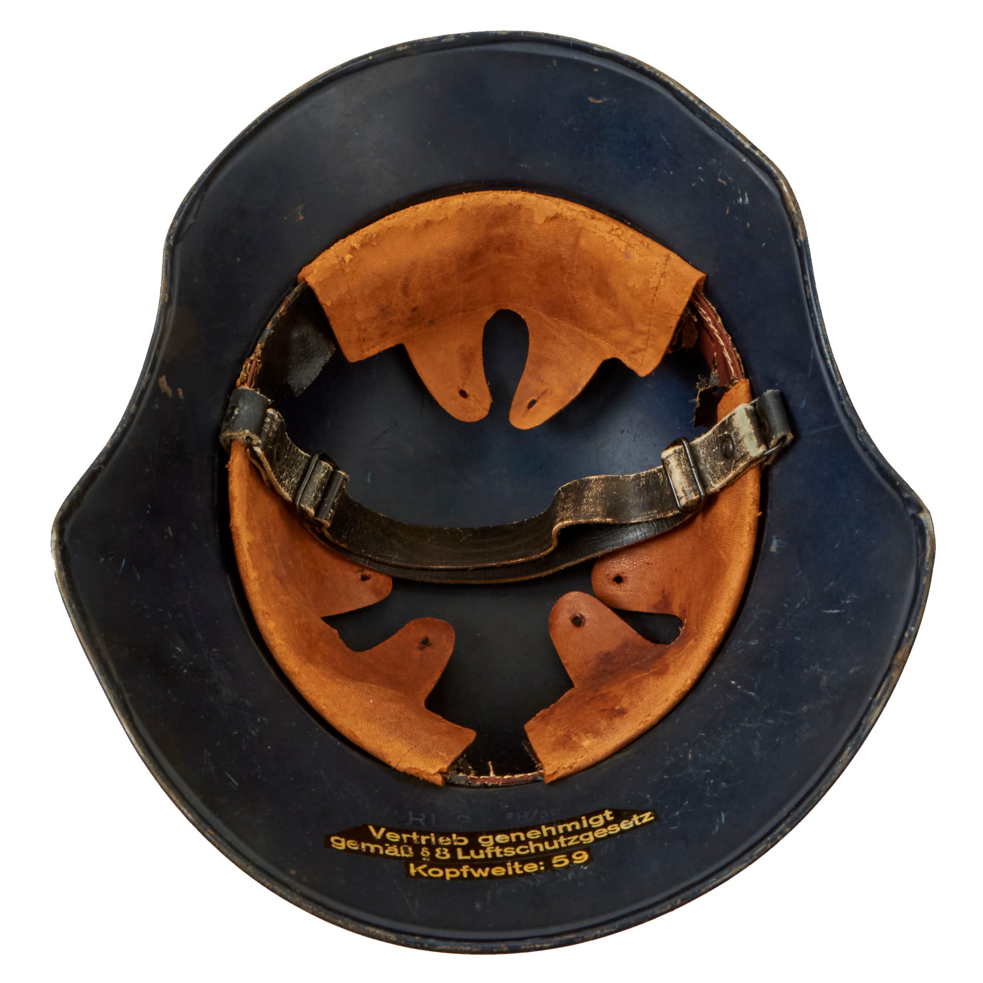 Original Item: Only One Available. This is a lovely lightly used M1938 Beaded Luftschutz Gladiator German helmet, which looks to have seen only light service during the WWII era. The exterior of this German helmet retains over 95% of the original dark blue paint, showing light overall wear, though there is a wide flat area on the top of the crown from a dent of some sort. There is little paint loss on either the interior or exterior, giving it a great look.