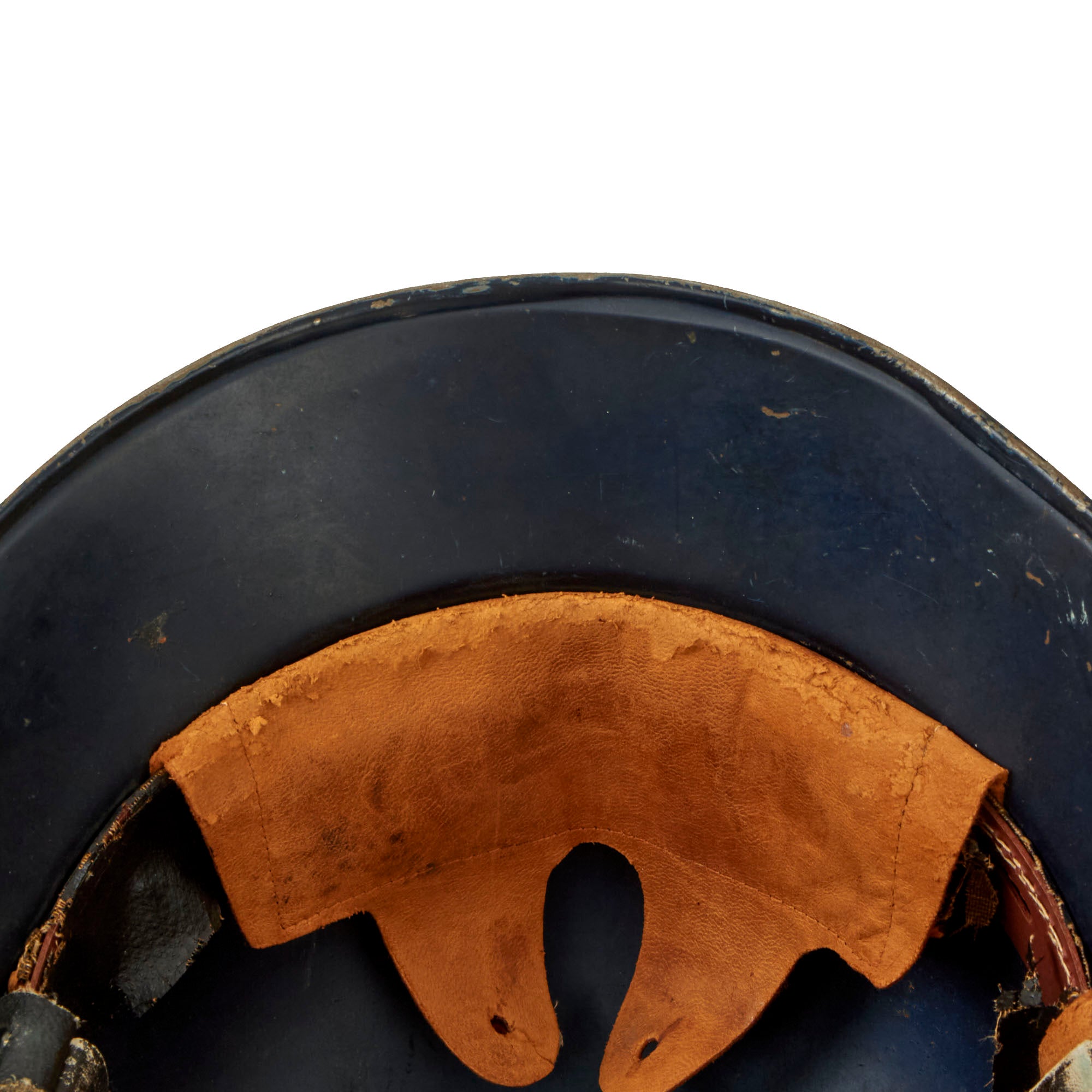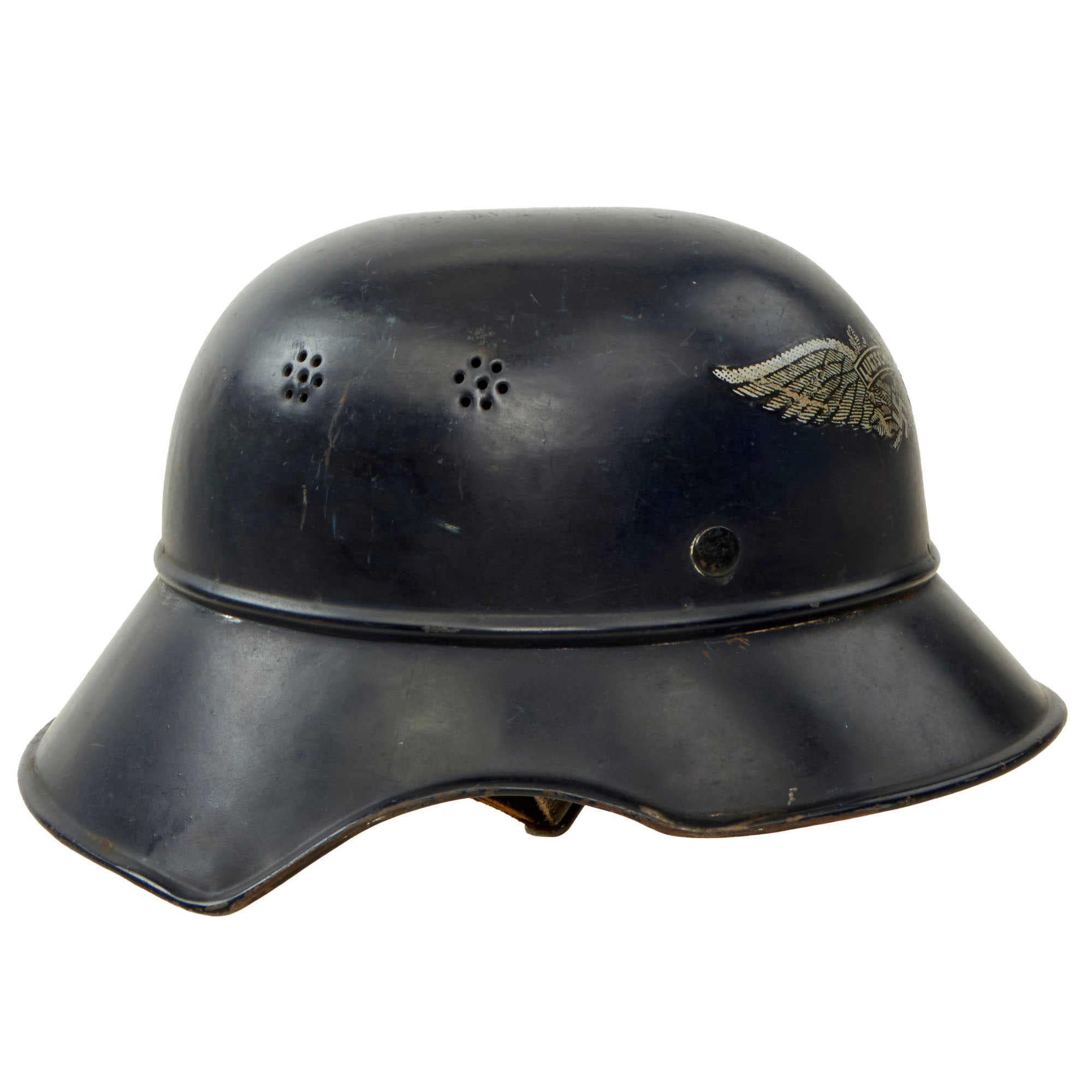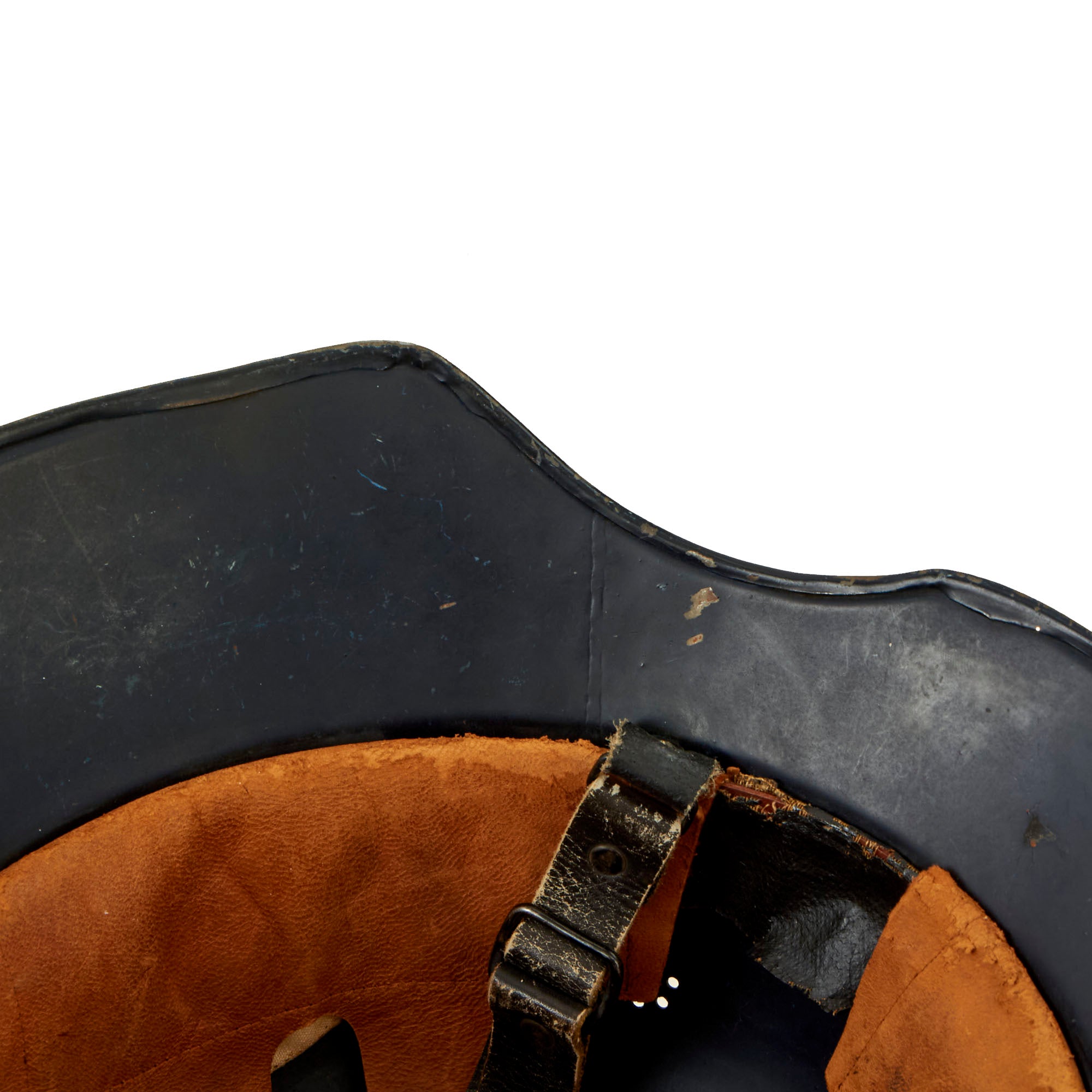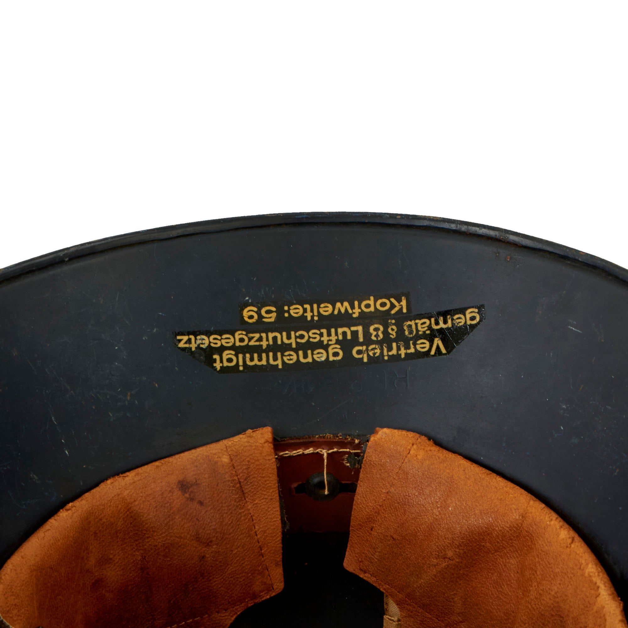 Original Item: Only One Available. This is a lovely lightly used M1938 Beaded Luftschutz Gladiator German helmet, which looks to have seen only light service during the WWII era. The exterior of this German helmet retains over 95% of the original dark blue paint, showing light overall wear, though there is a wide flat area on the top of the crown from a dent of some sort. There is little paint loss on either the interior or exterior, giving it a great look.