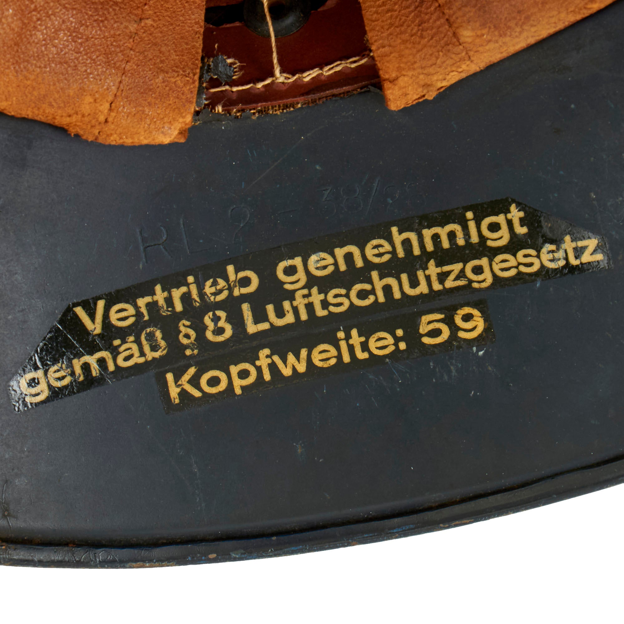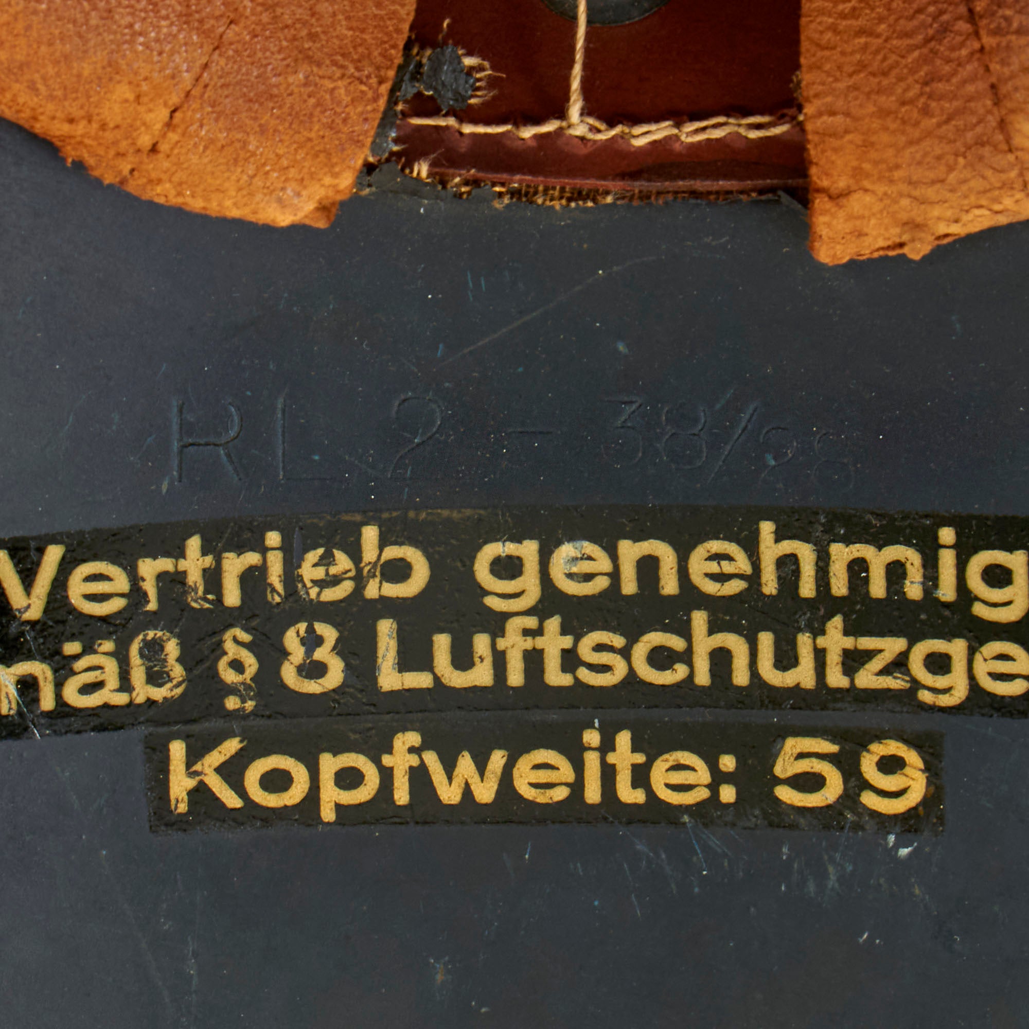 The inner skirt is maker marked with stamping into the steel with RL 2 - 38 / 28. These markings would seem to indicate that the helmet was made in 1938, though we do not know if any records were kept of the maker. It may be that it was made under a 1938 contract. Below is a original Luftschutz helmet information decal / paint stamp, which is complete: